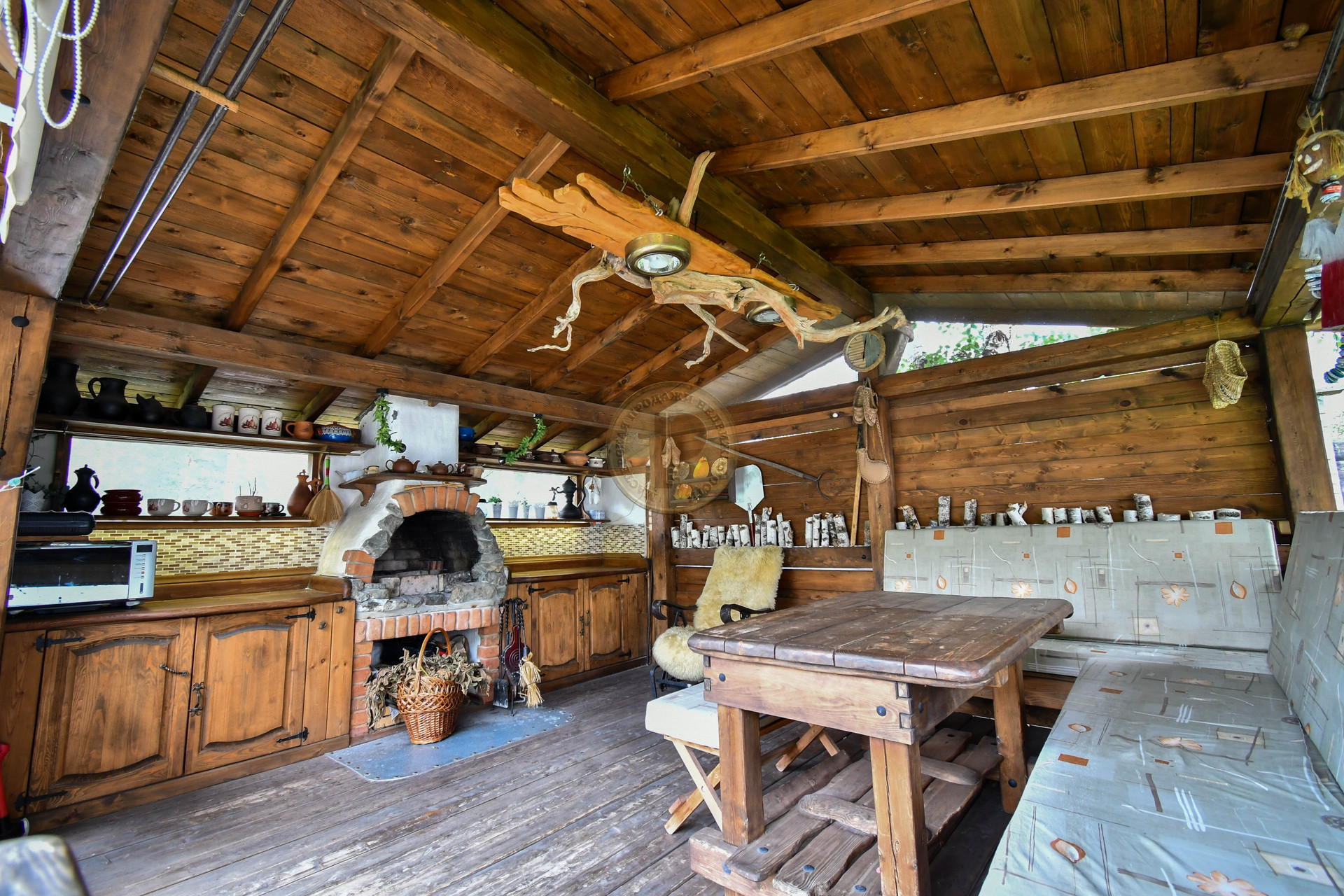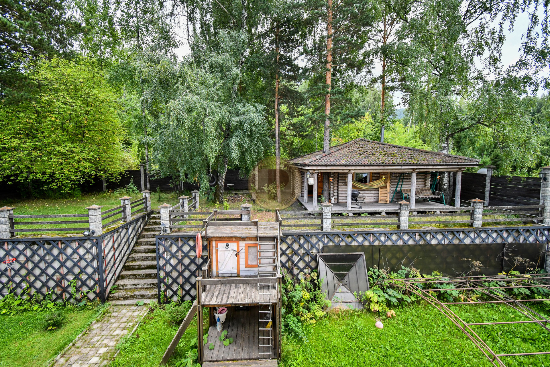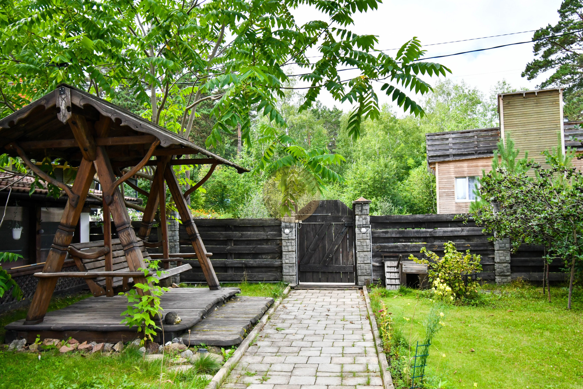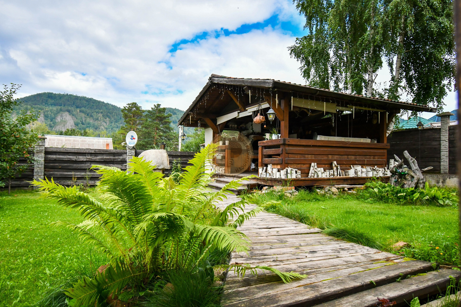 Территория 10 соток ИЖС огорожена крепким забором на ленточном фундаменте , выстроена дизайнерская беседка из дерева с мангалом, тандыром. Оборудована столом и стульями штучного производства для приема гостей. Весь участок благоустроен по эксклюзивному проекту.