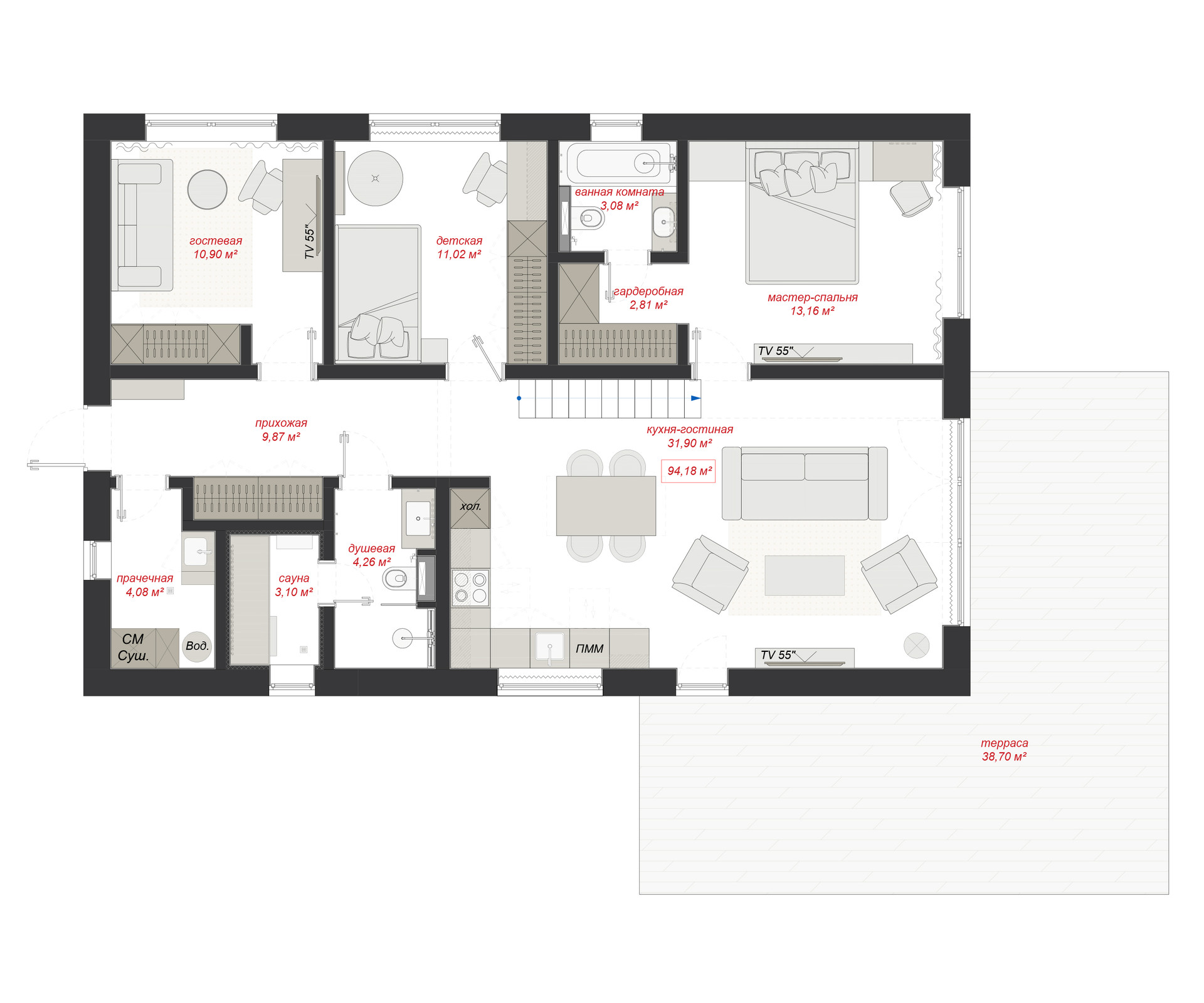 - Мастер-спальня с собственной ванной комнатой и личной гардеробной;
