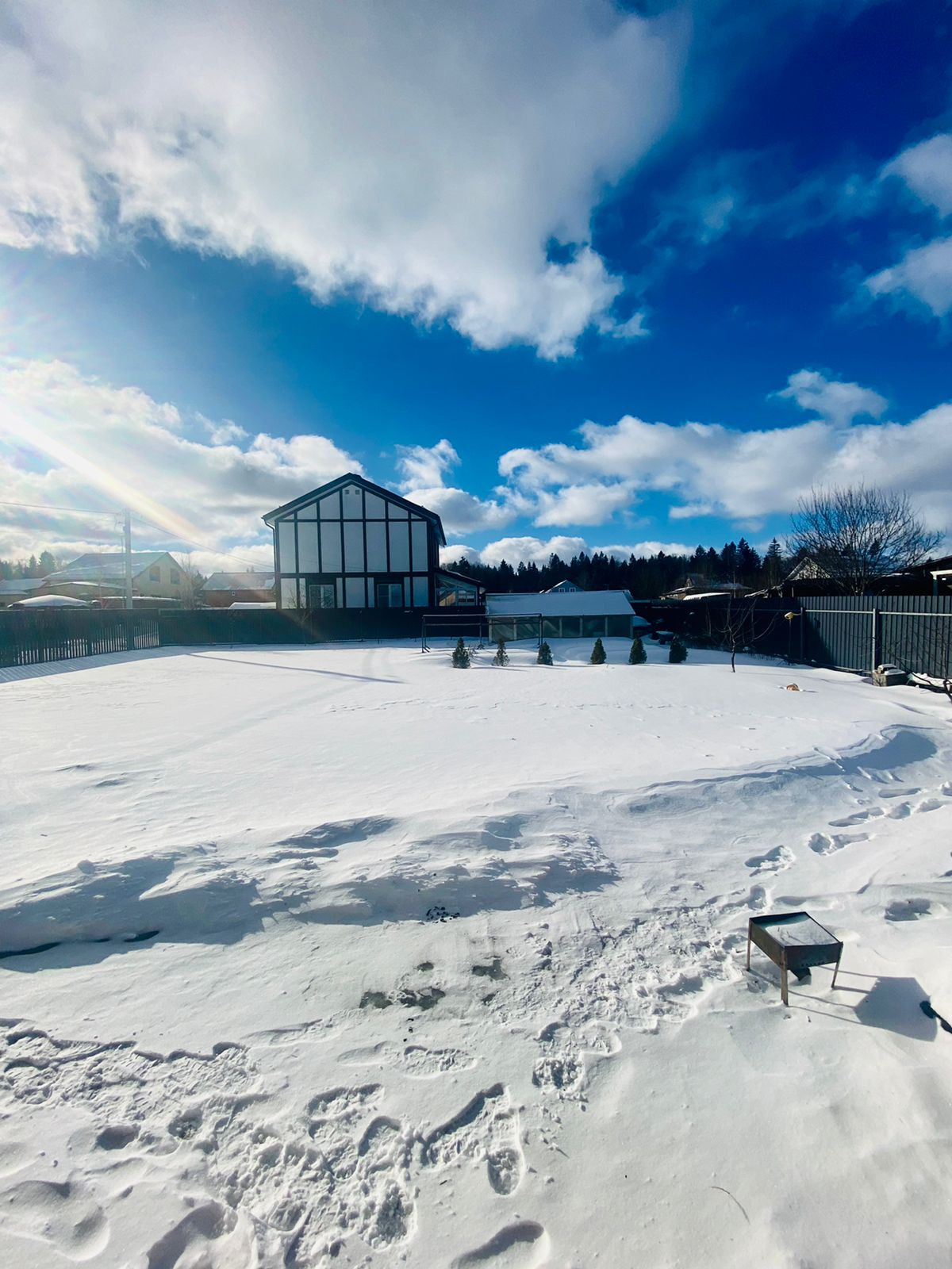 Участок угловой , граничит с двумя соседями . Огорожен металлическим и деревянным забором.