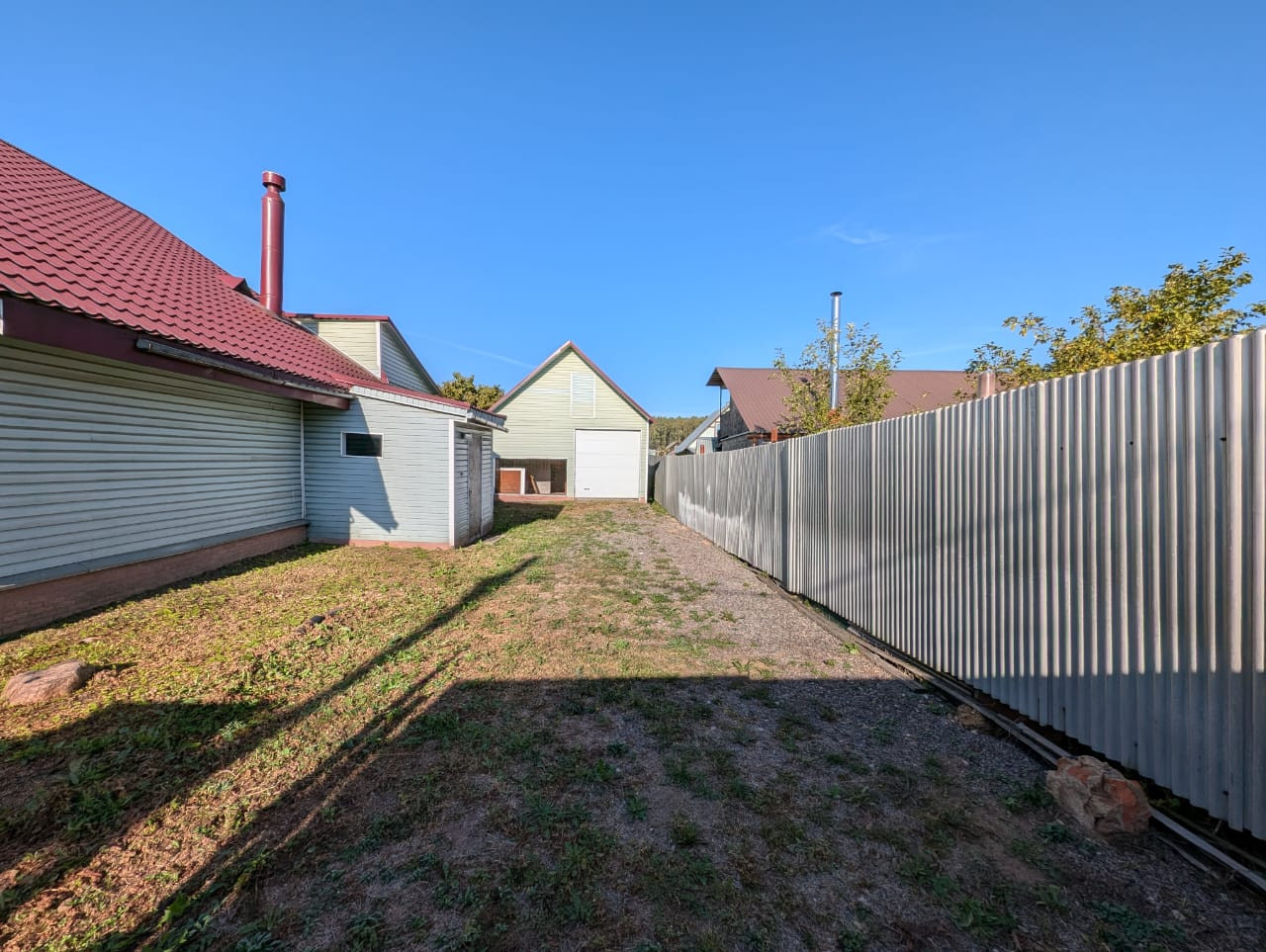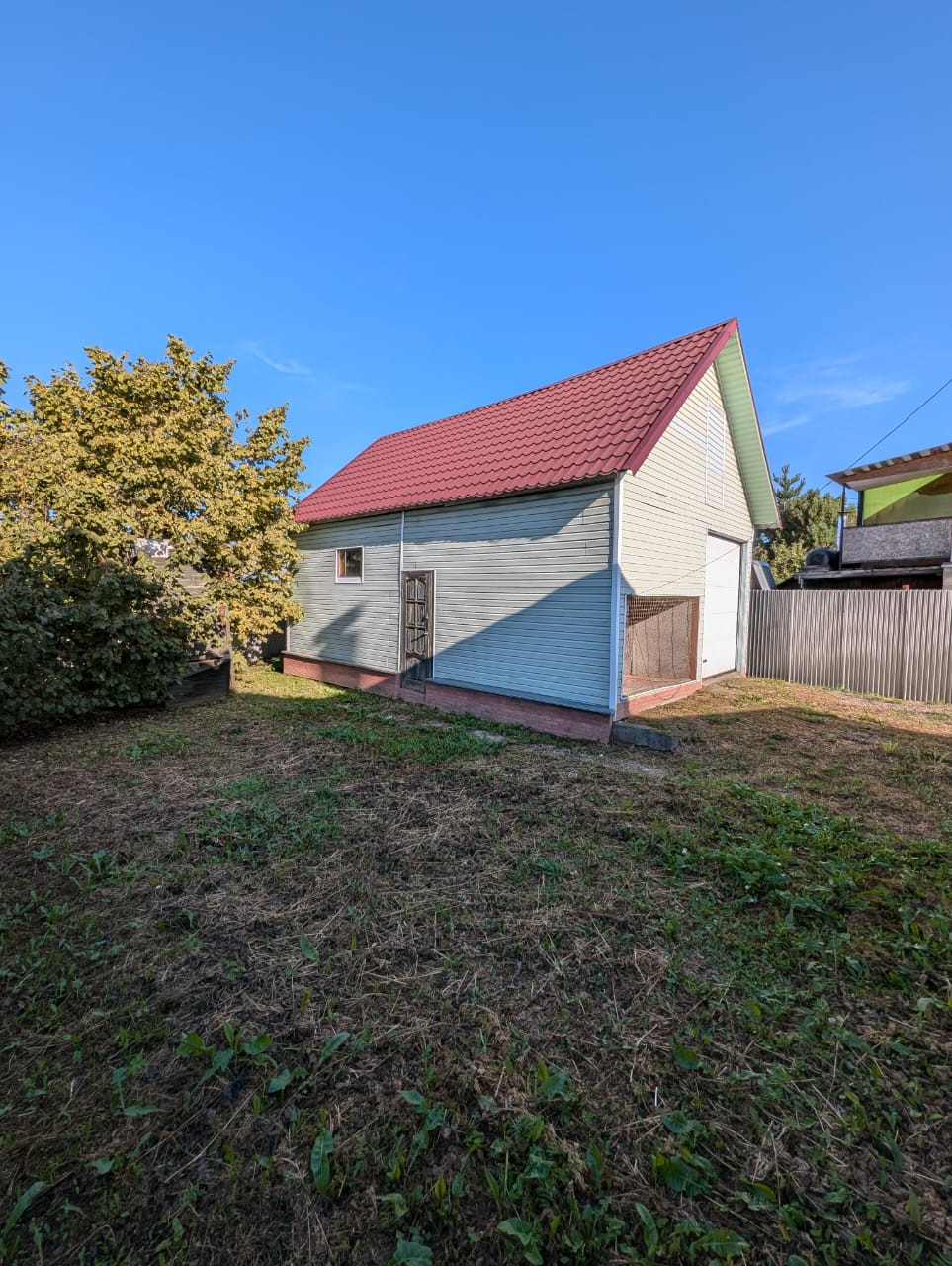 6 соток, огорожен забором из профнастила, имеются две качественные теплицы 8х3 метра и Гараж 48 кв.м, с электрическим подъемником двери, мастерской и вольером.