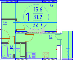 Общая площадь, 32,7 м2: