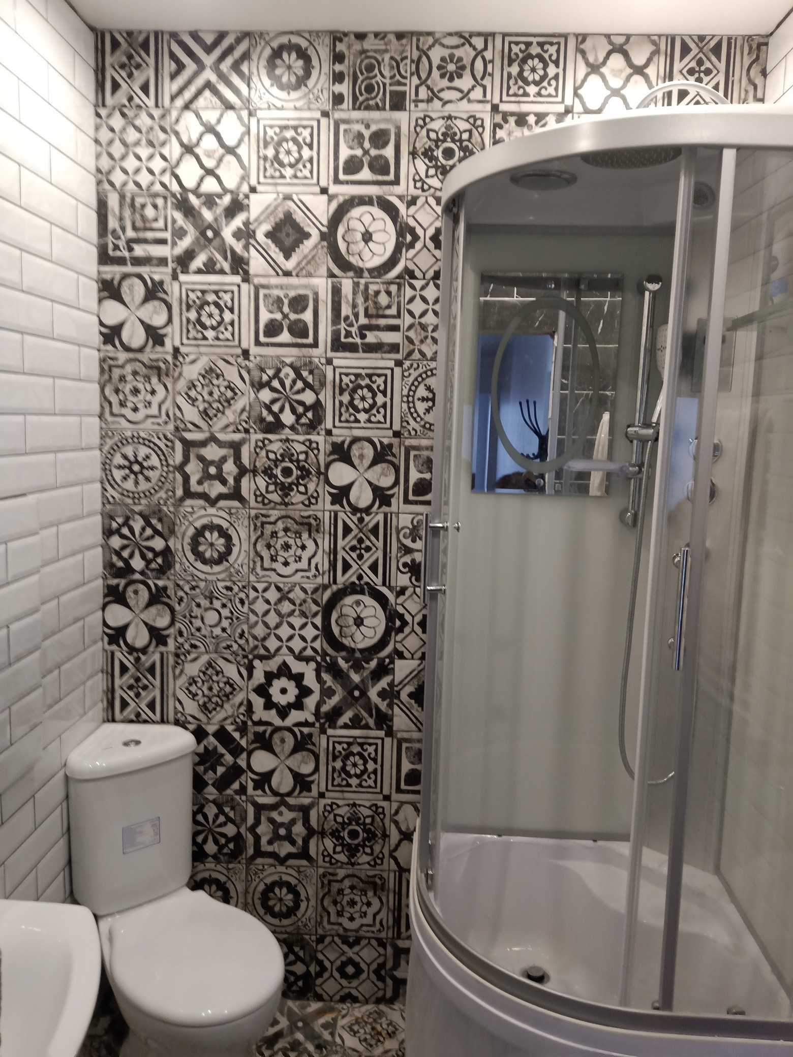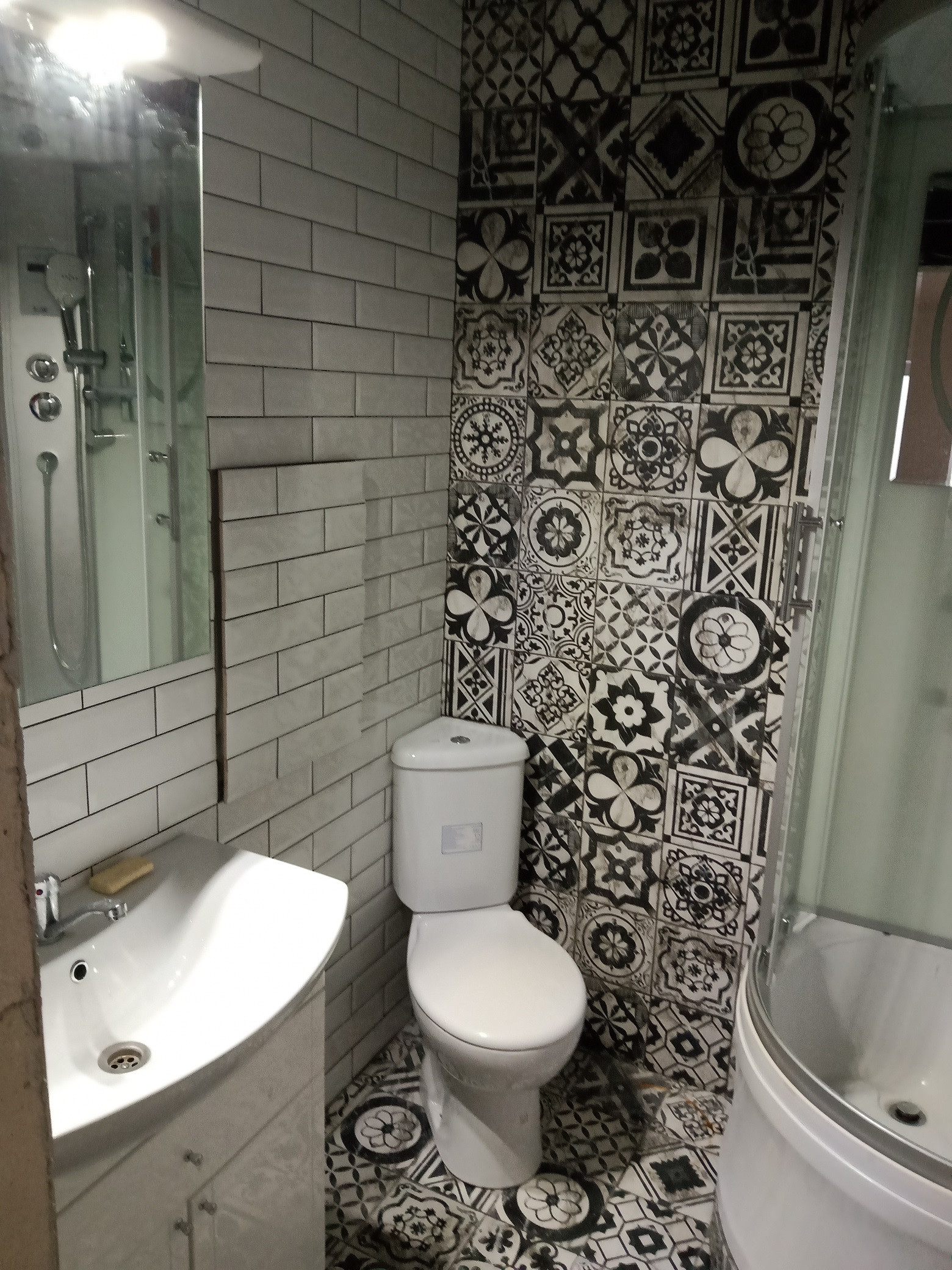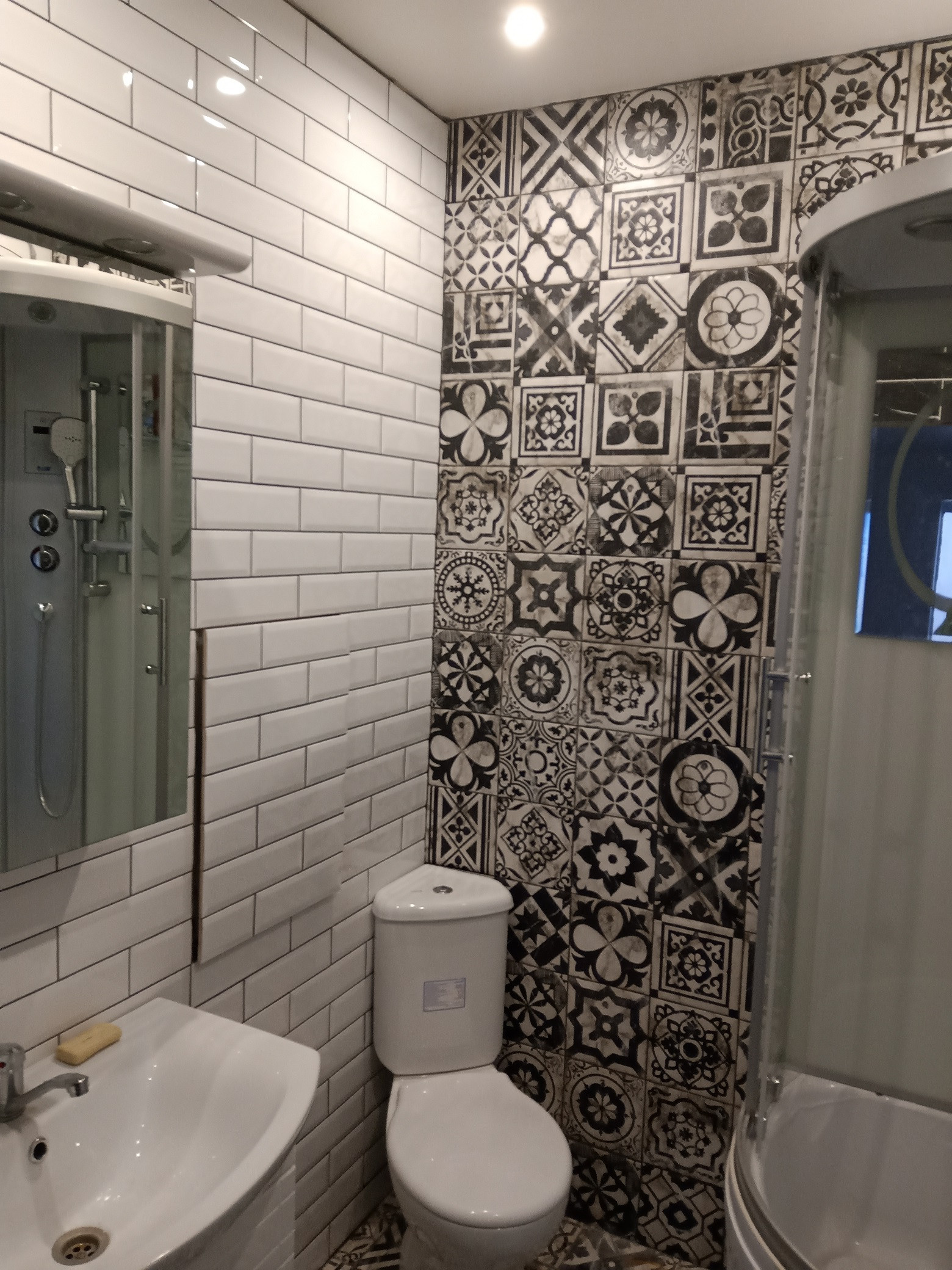 Первый – 3 м.кв. с немецкой душевой кабиной, угловым унитазом, раковиной и навесным шкафчиком с подсветкой.