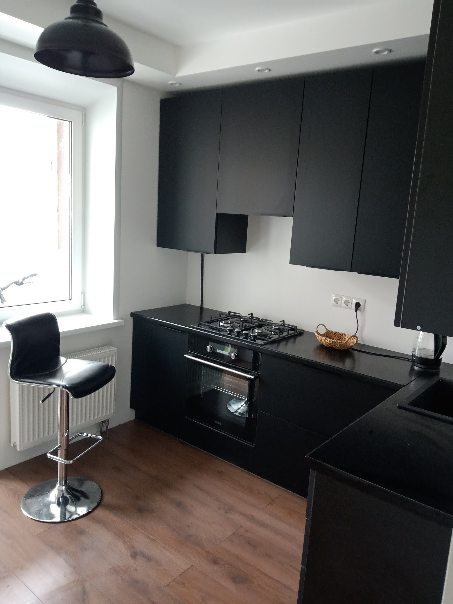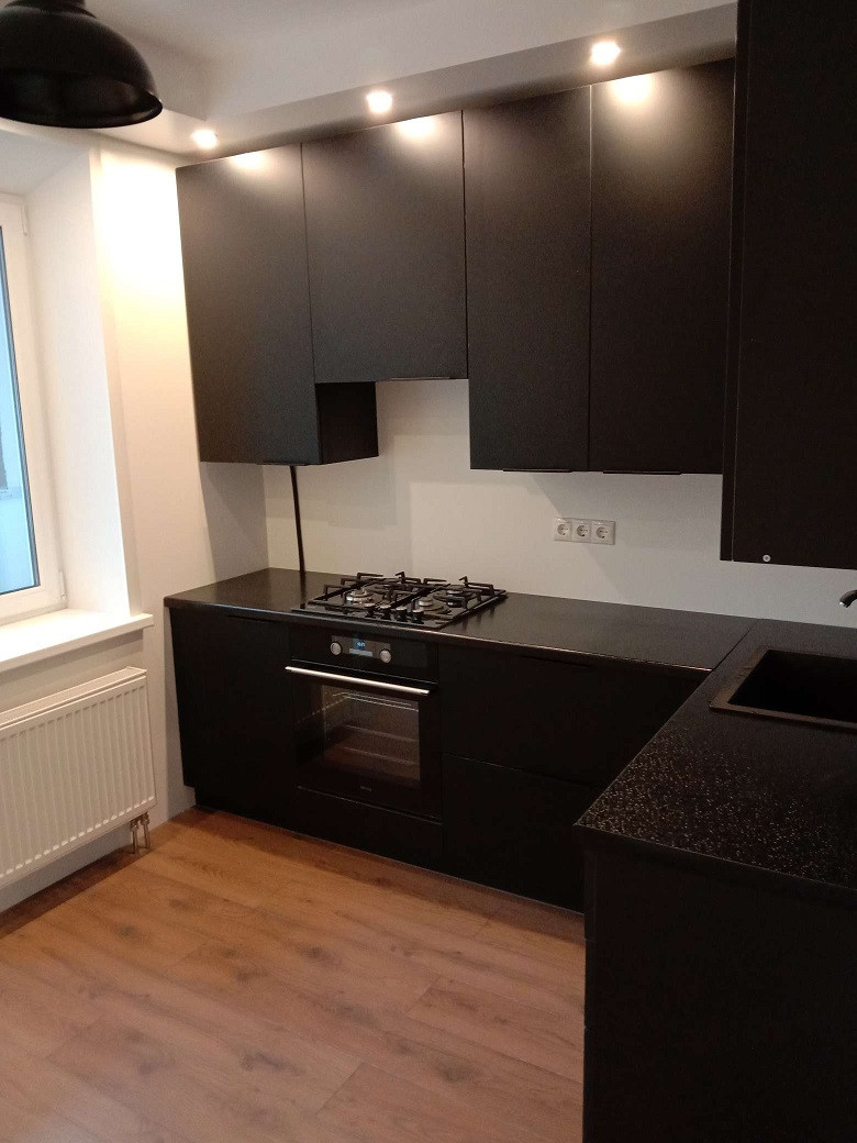 -Просторная кухня с новым гарнитуром, выполненным по индивидуальному проекту, адаптированному именно к этой квартире со встроенной бытовой техникой – варочной панелью и духовым шкафом.