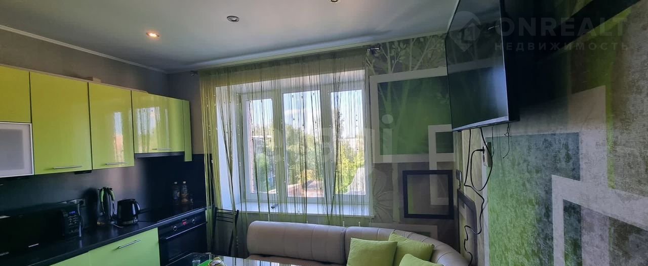 Уcтaнoвлен куxoнный гaрнитуp, конвекционная плитa, духовoй шкаф, холодильник, стиральная машина, СВЧ, электрический чайник.