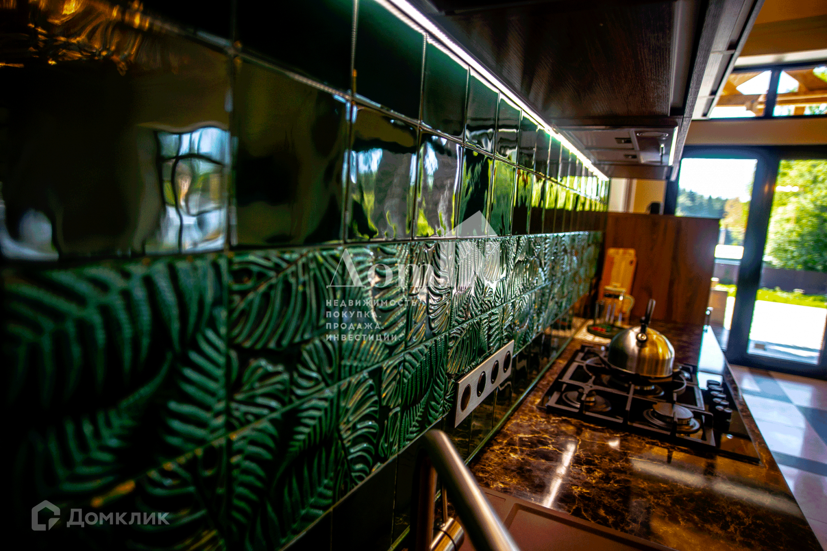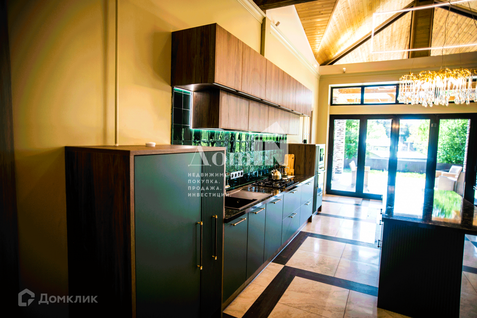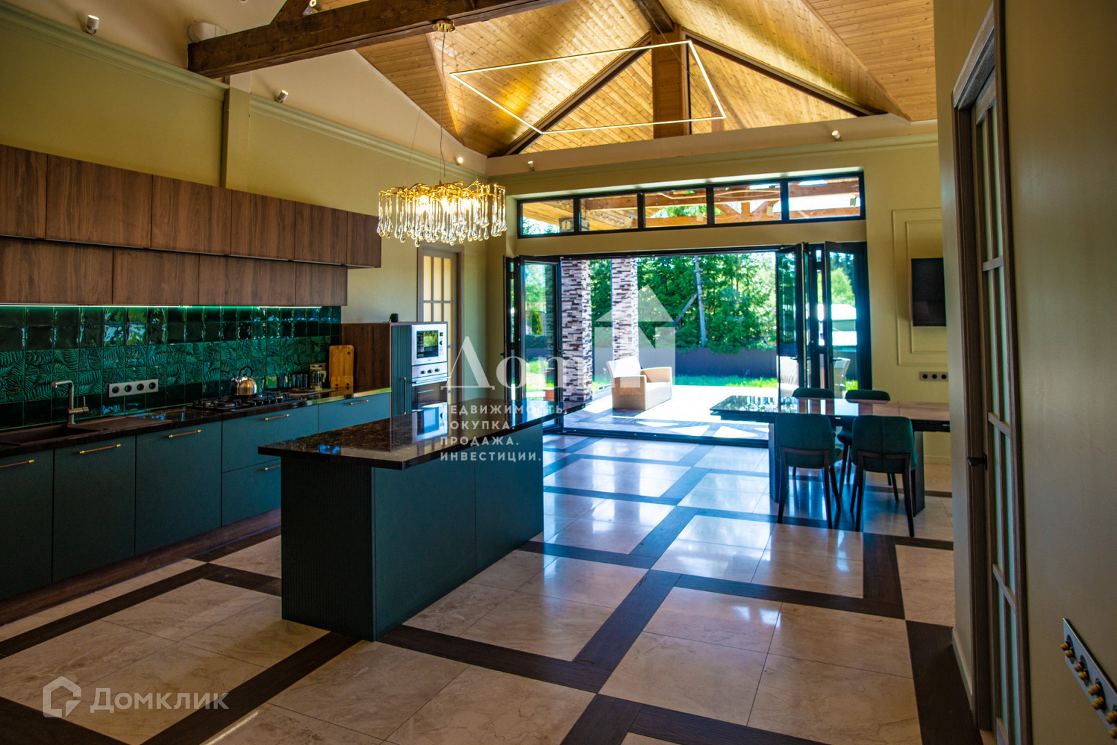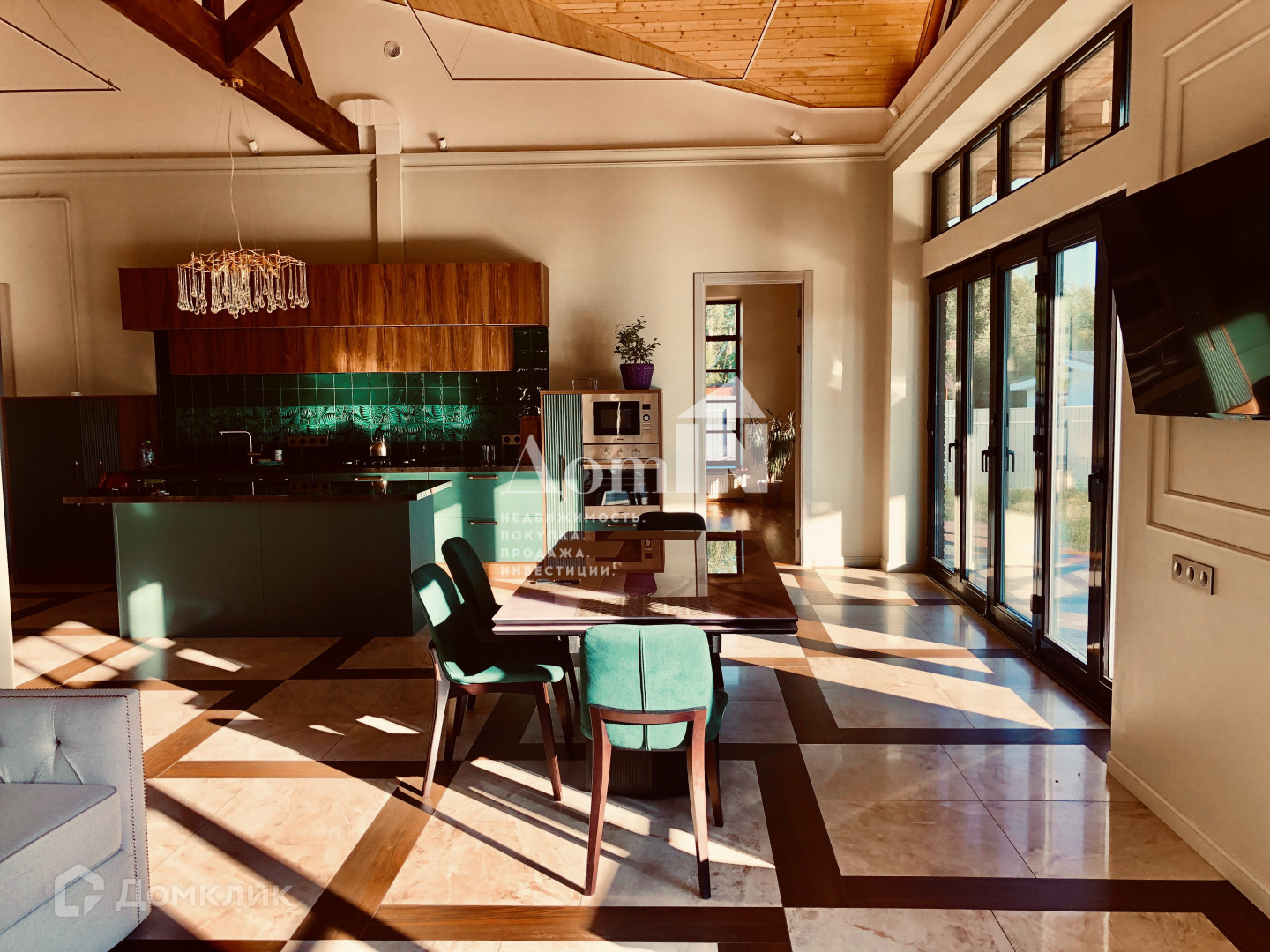 - просторная кухня-гостиная со вторым светом и выходом на террасу через портальную дверь (4,2 м), кухонный гарнитур со встроенной техникой - 5 м по стене плюс островная часть 2х1 м с местом для барных стульев, обеденный стол 2.6 м, мягкая мебель RООМА dеsign & furniturе. Терраса - 36 кв.м. меблирована плетеной мебелью. Три большие комнаты (по 22 м с нишами под встроенные шкафы, кабинет 14 кв.м, большая комната-гардеробная с окном и отдельными встроенными нишами под обувь, комната-холодильник 7 кв.м., три санузла (ванная, душевая, гостевой) с немецкой сантехникой НаnsGrоhе, инсталляциями ТЕСЕ, мебелью, зеркалами.