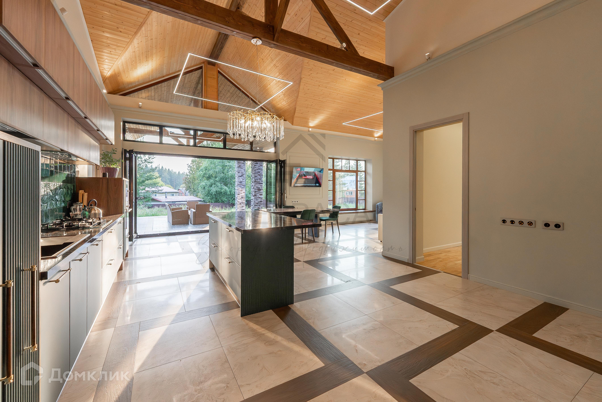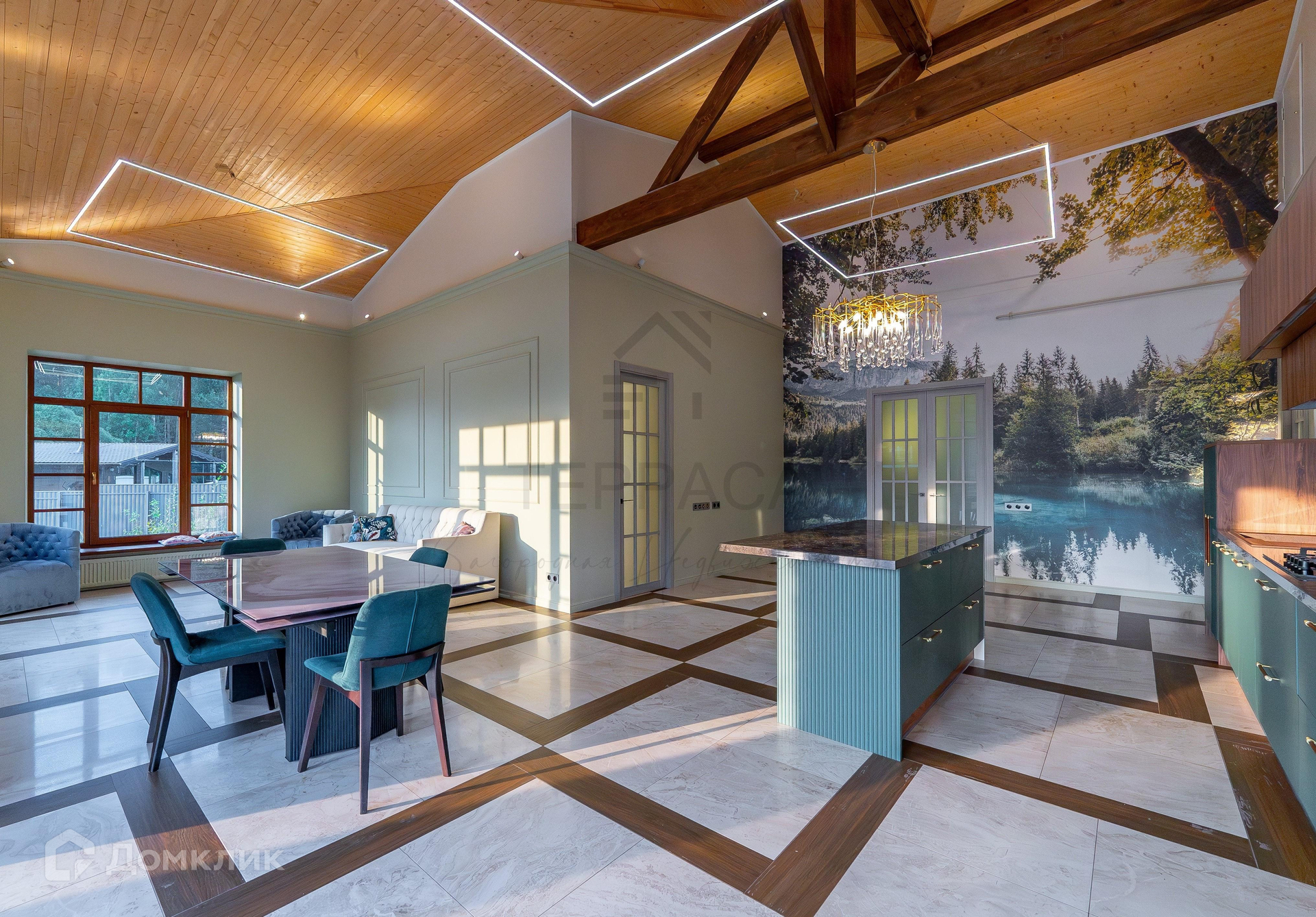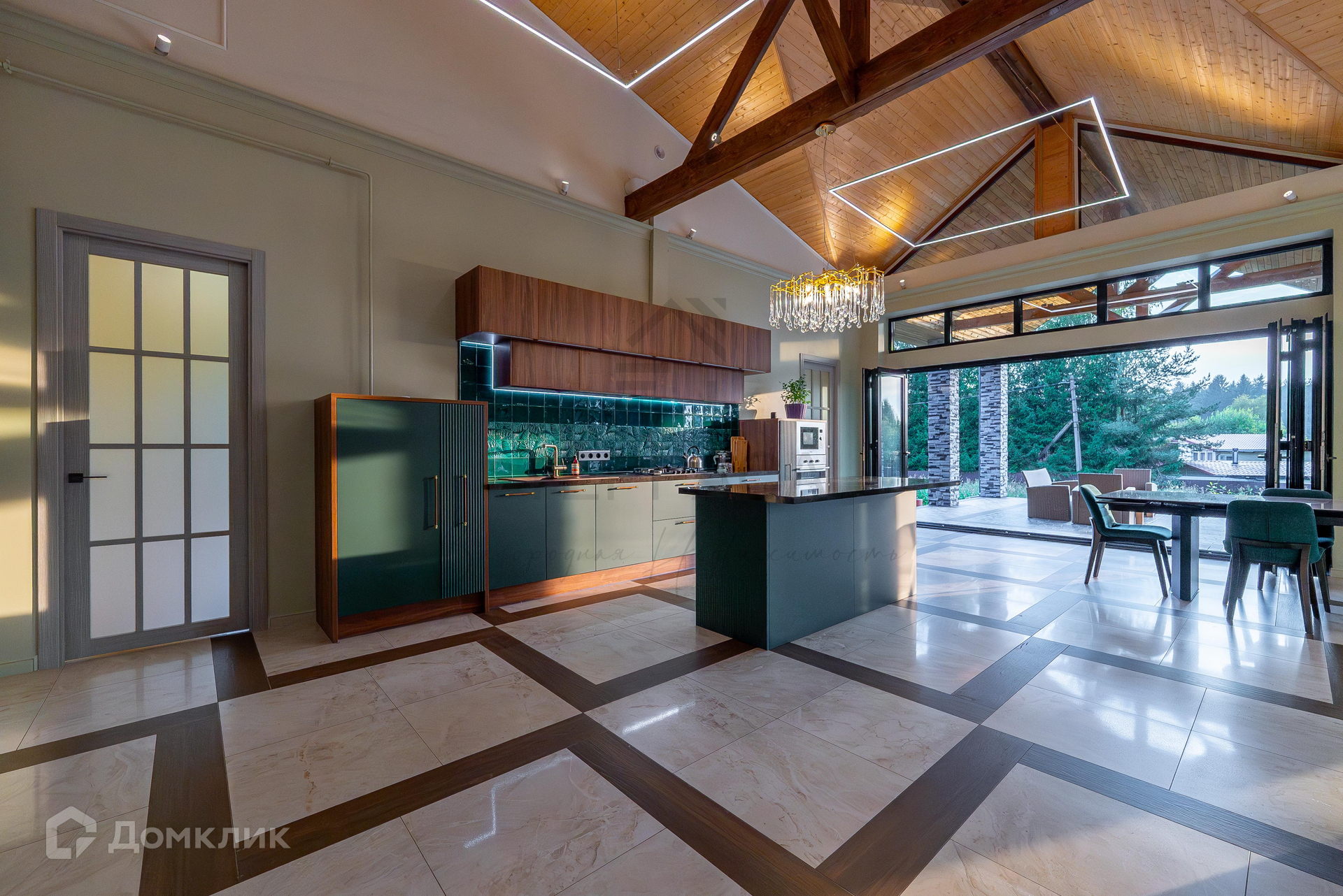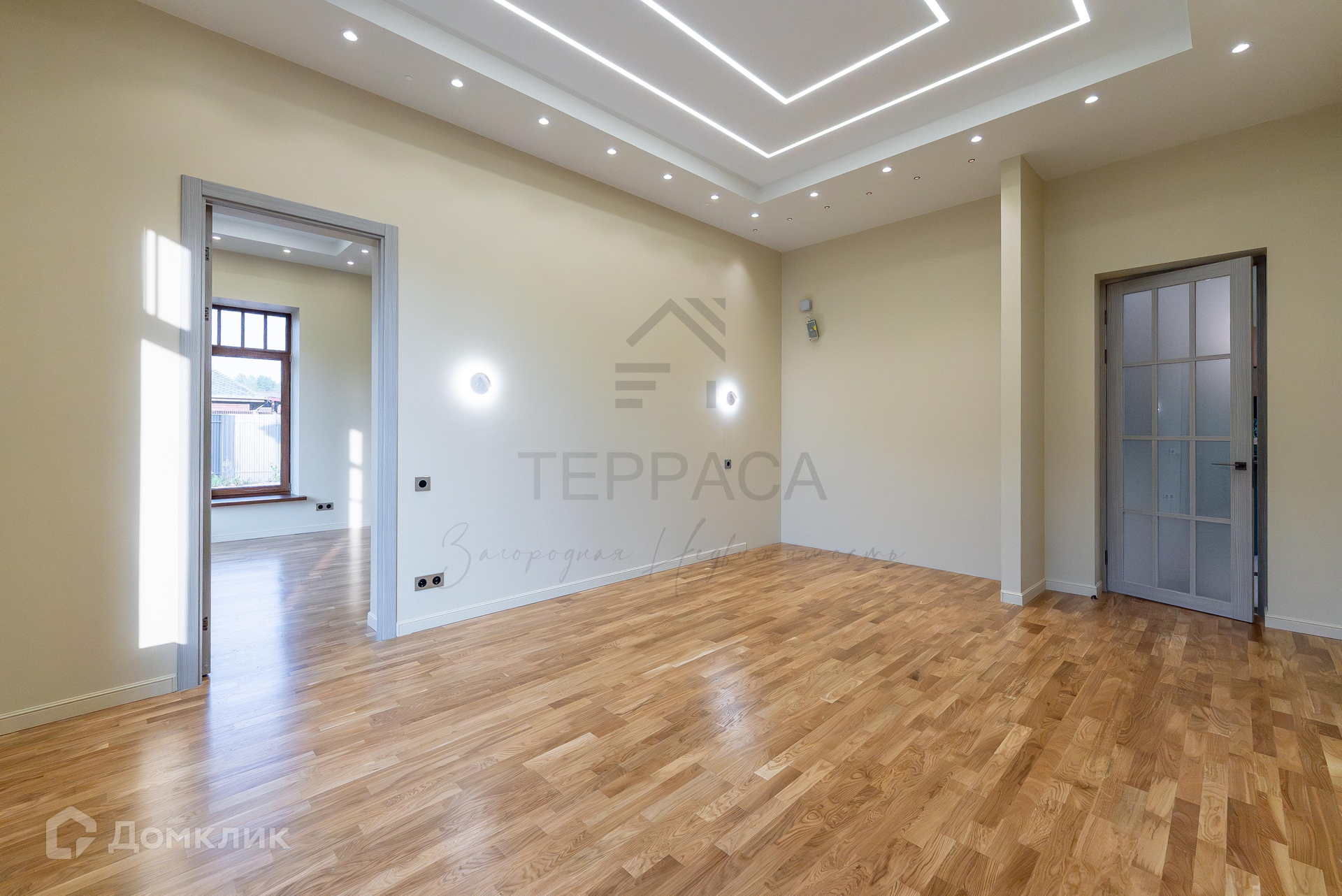 1 этаж – большая крытая терраса, уютная кухня-гостиная с дизайнерской мебелью и качественной техникой, 3 изолированные комнаты (одна из них – с кабинетом), гардеробная, комната-холодильник, котельная, 3 с/у.