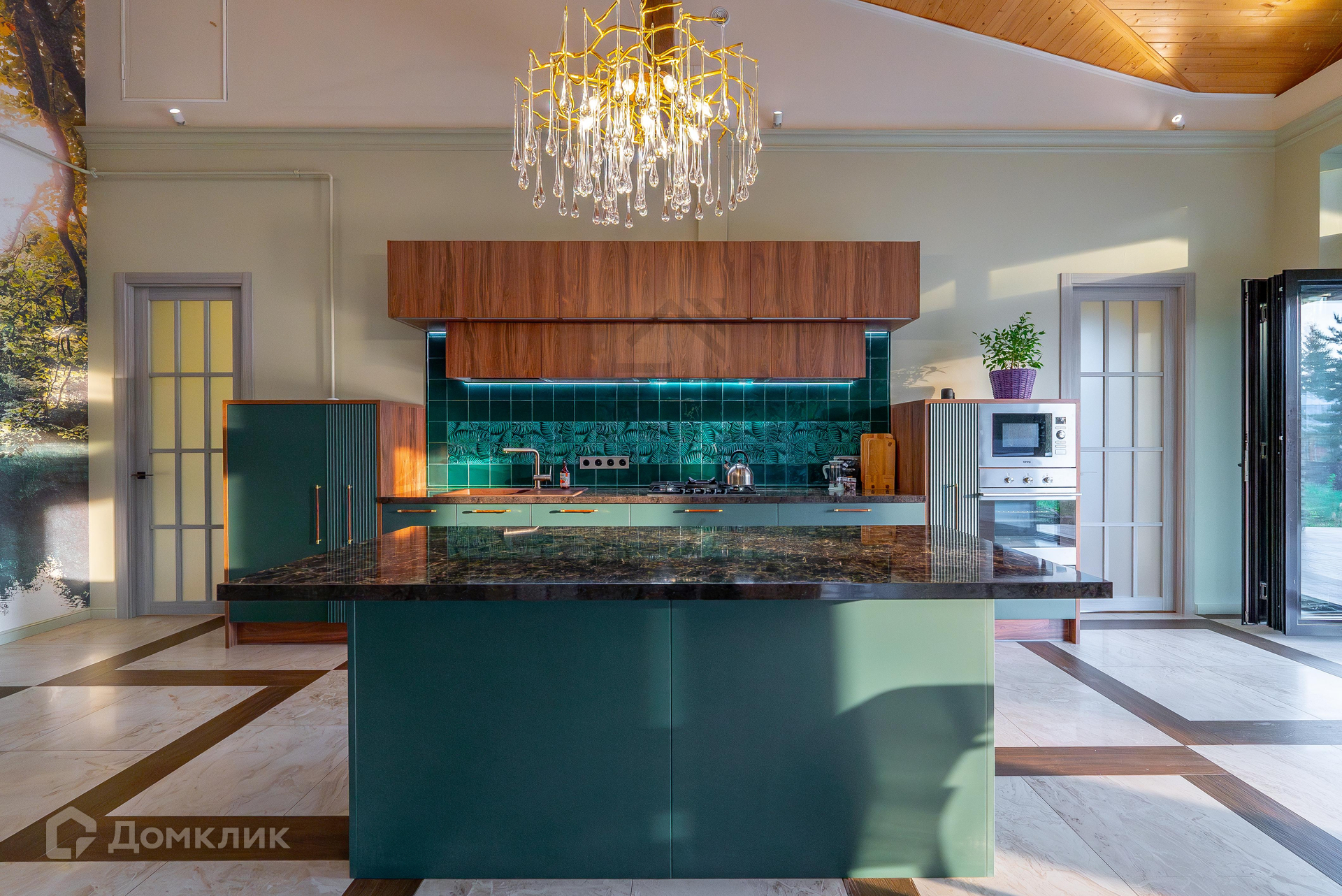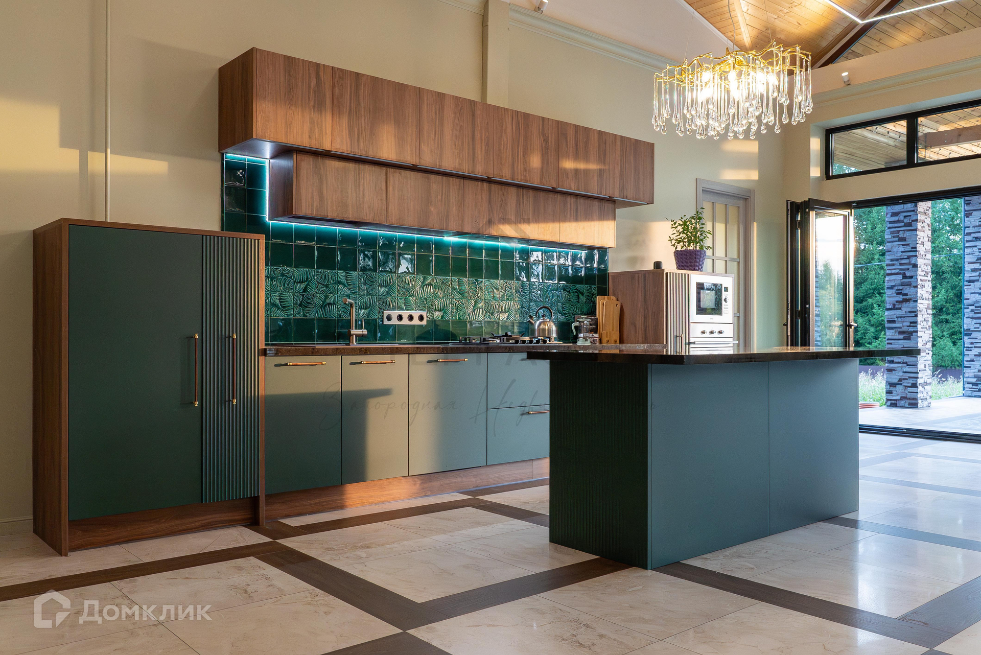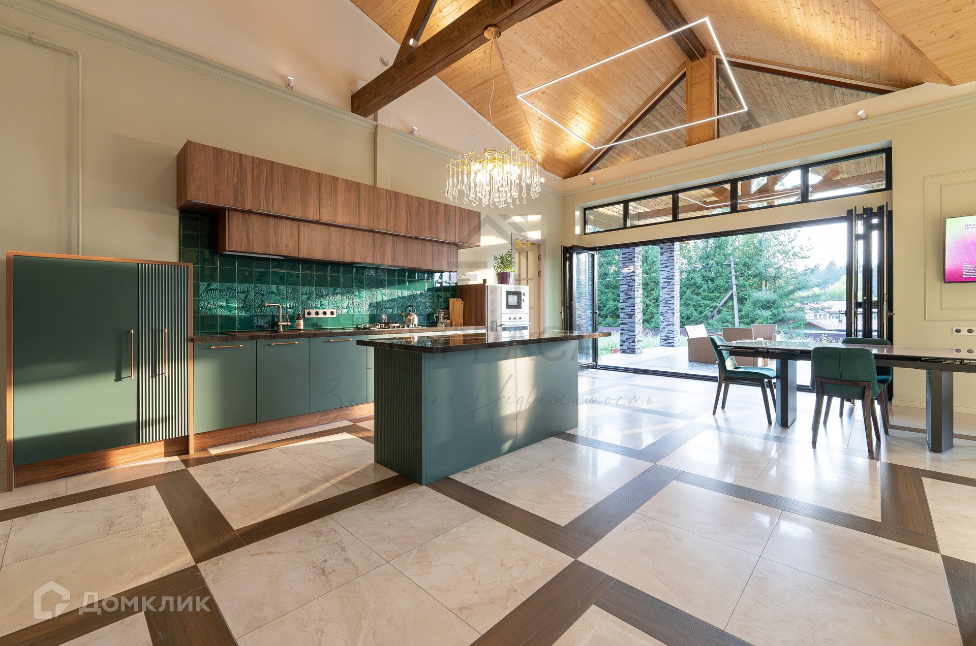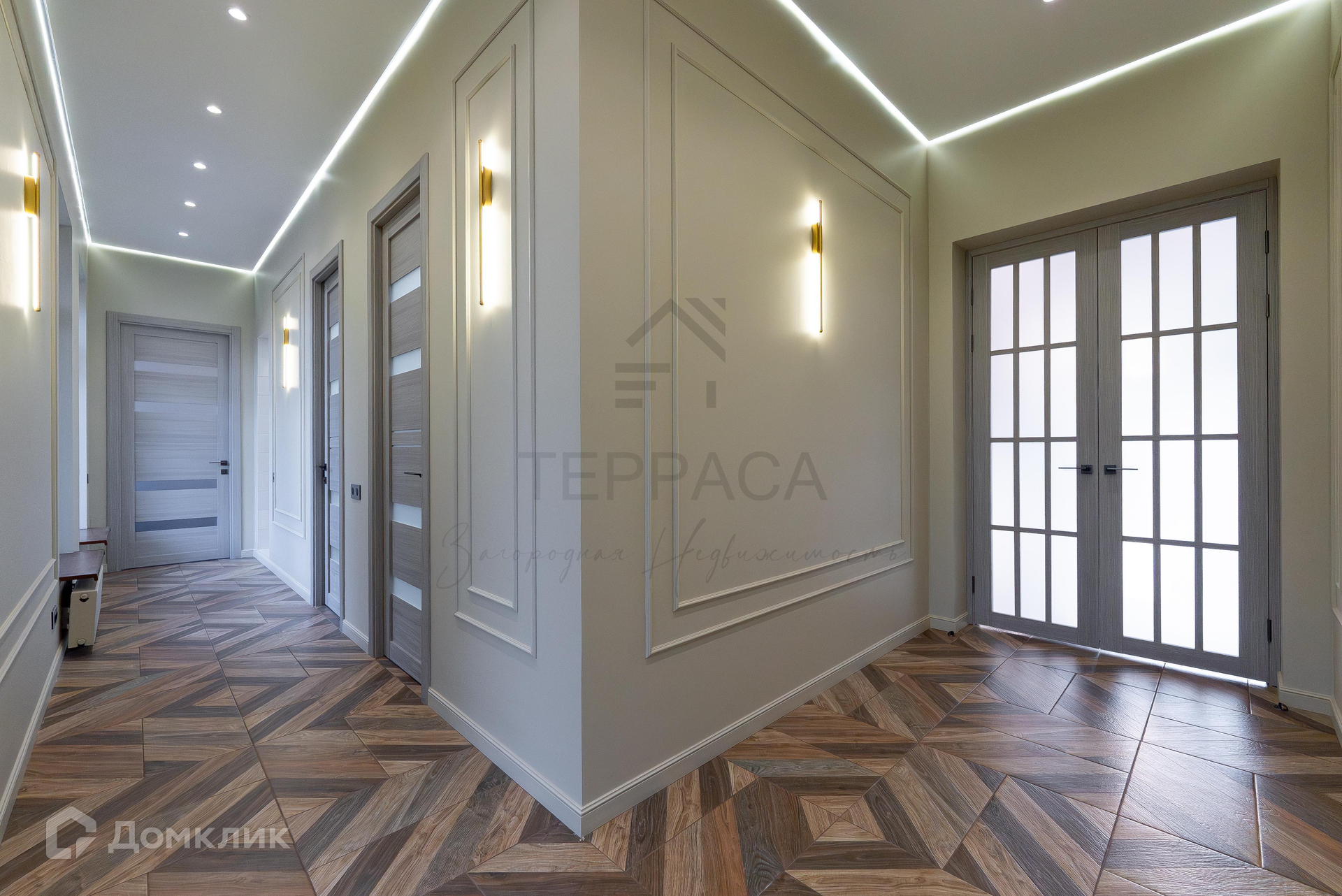 1 этаж – большая крытая терраса, уютная кухня-гостиная с дизайнерской мебелью и качественной техникой, 3 изолированные комнаты (одна из них – с кабинетом), гардеробная, комната-холодильник, котельная, 3 с/у.