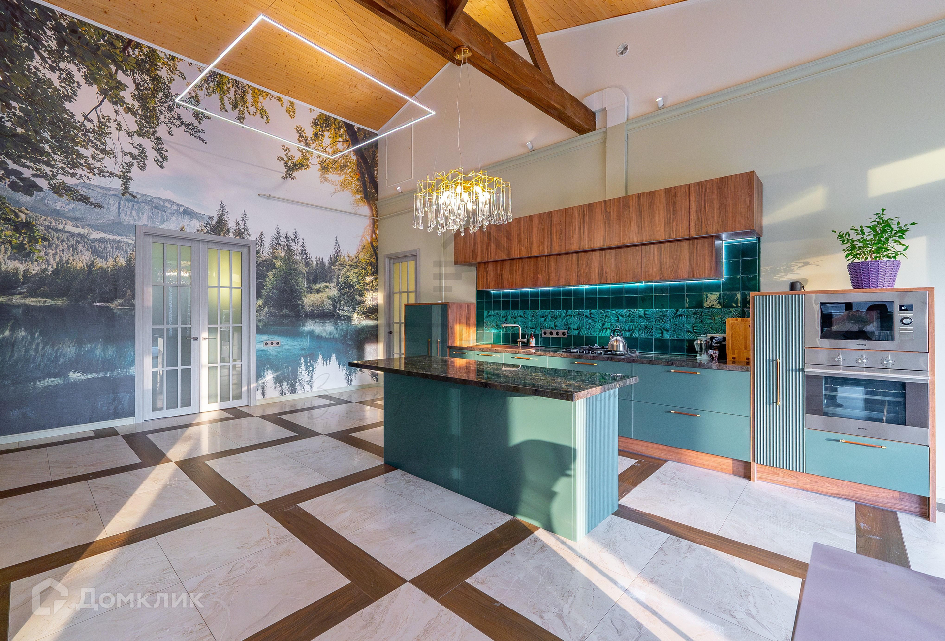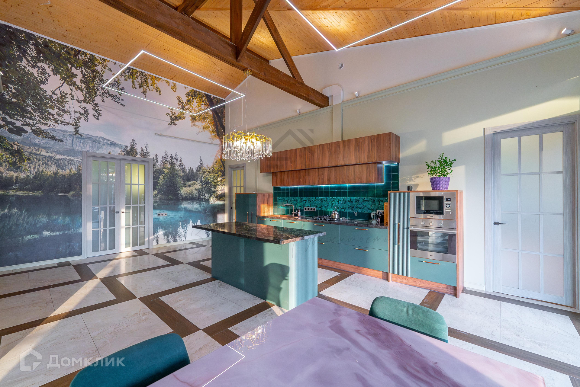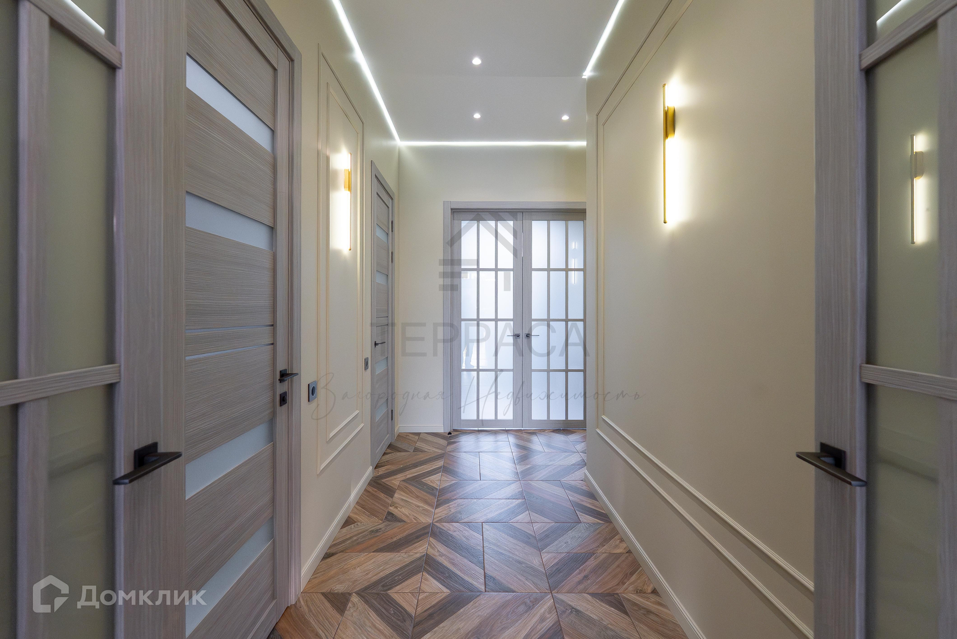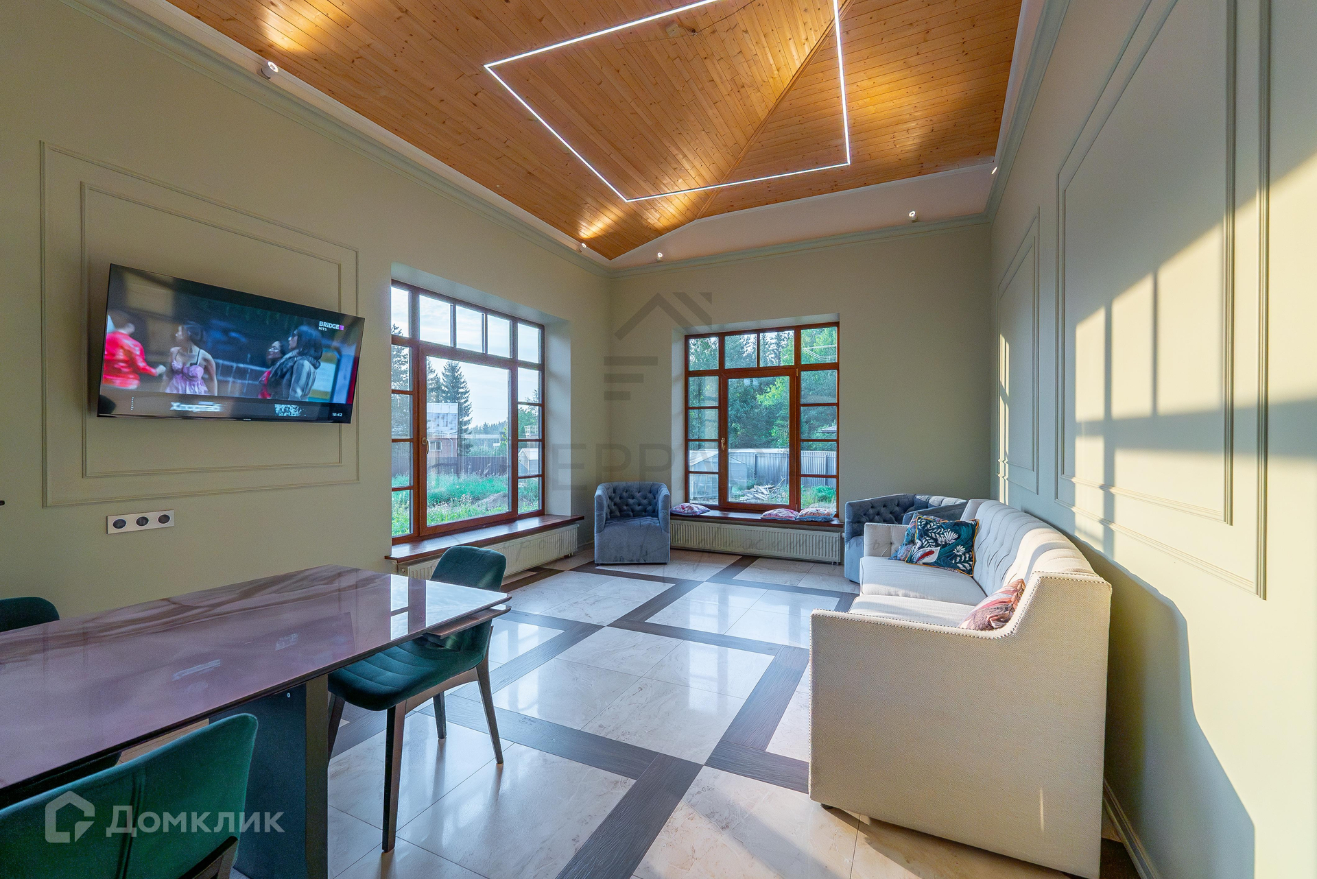 1 этаж – большая крытая терраса, уютная кухня-гостиная с дизайнерской мебелью и качественной техникой, 3 изолированные комнаты (одна из них – с кабинетом), гардеробная, комната-холодильник, котельная, 3 с/у.