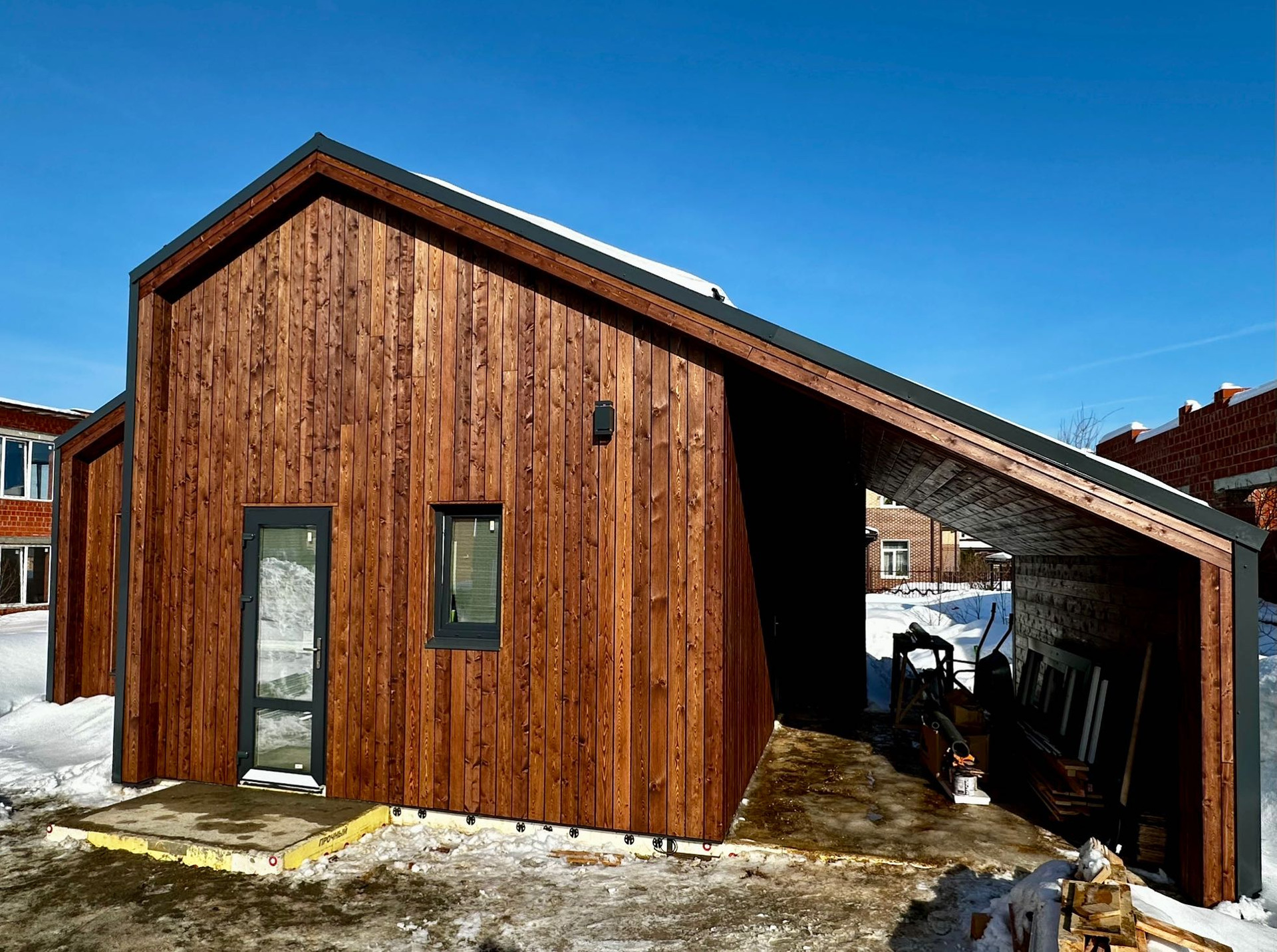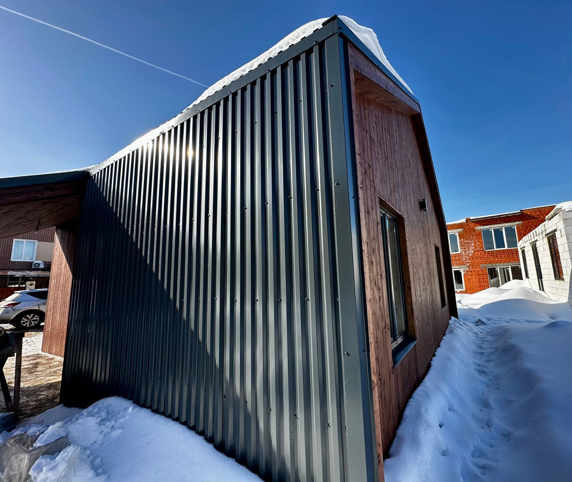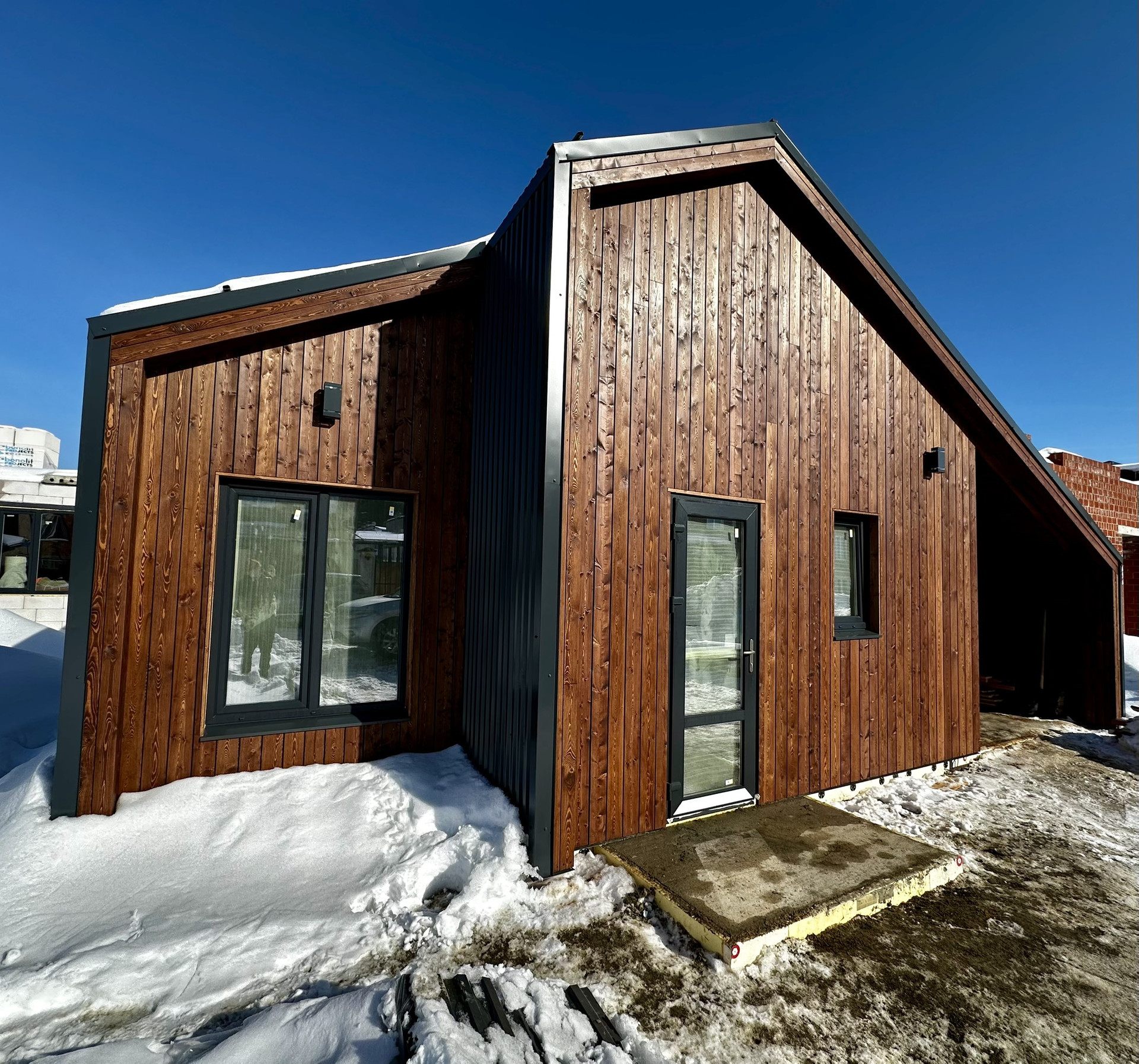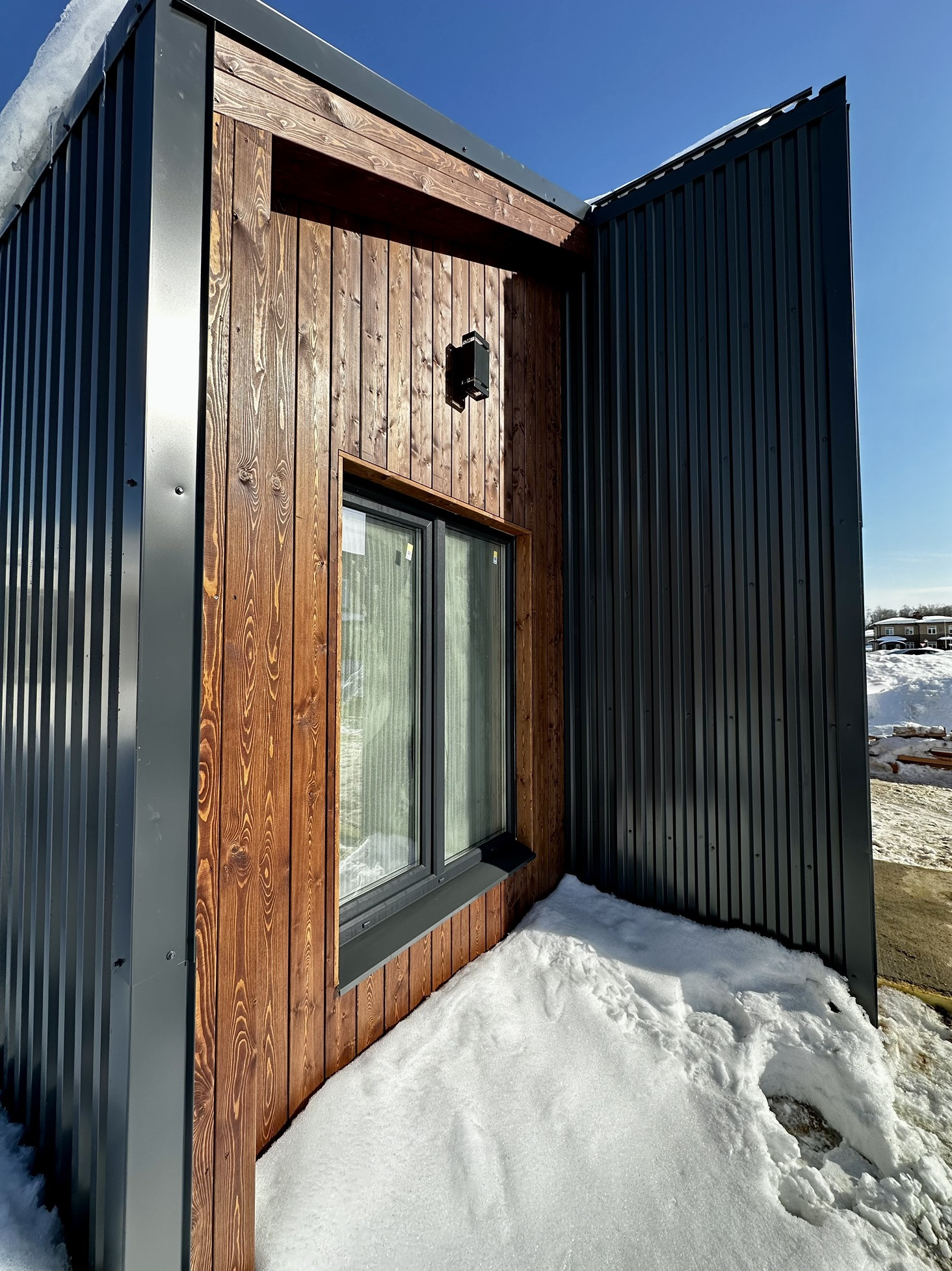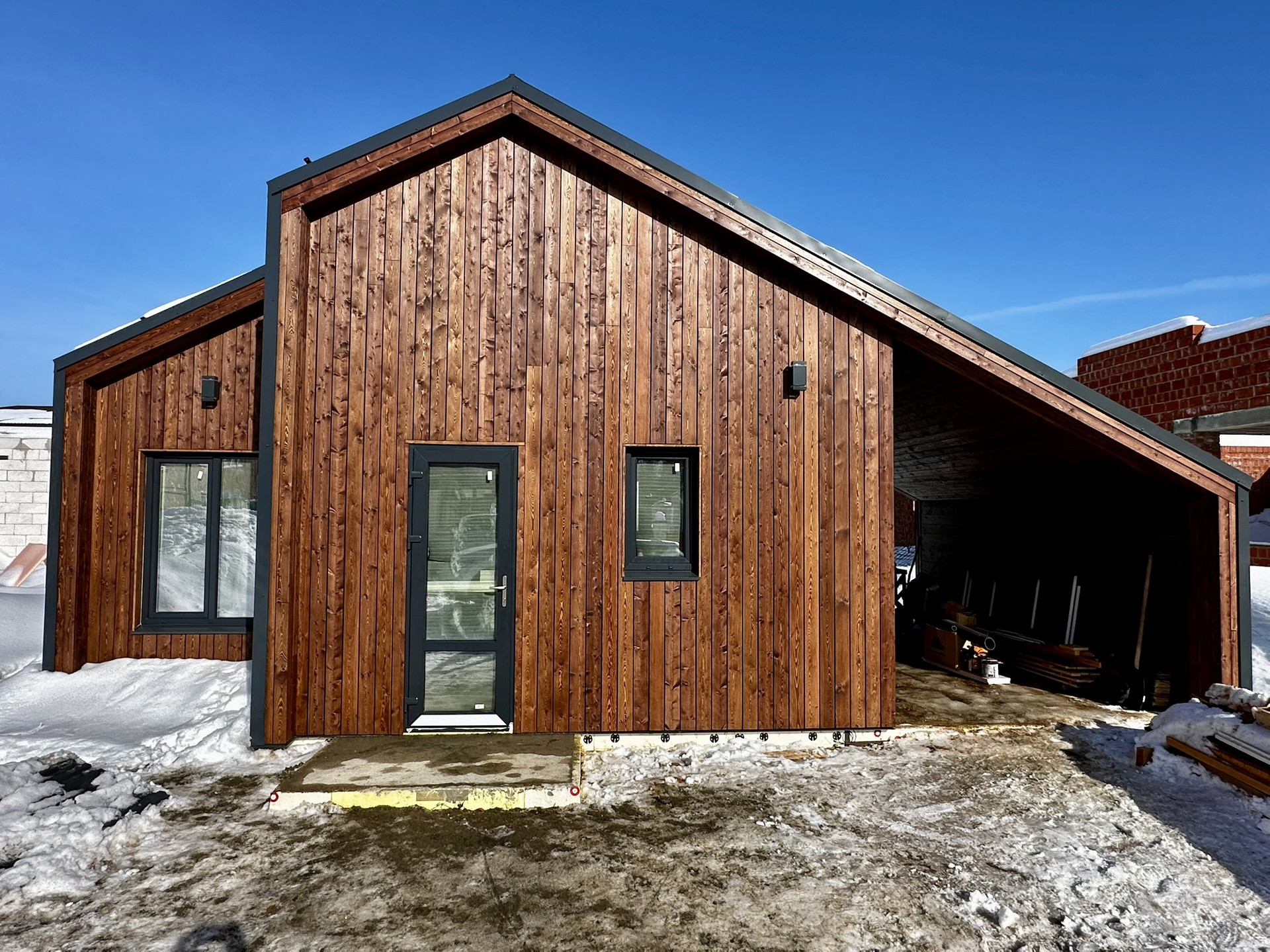 Комбинированный фасад планкен лиственницы обработан маслом и смонтирован на скрытый крепеж цвет тик и кровельный профнастил 0,5 мм. Окна и двери Рехау 70мм, двухкамерный стеклопакет, 3 стекла с энергосберегающими покрытием.
