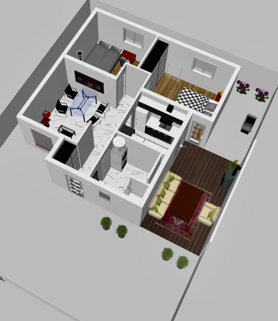 Дом на участке 2 сот, придомовая территория позволяет разместить 4 машины, есть зона для барбекю, хранения инвентаря, можно разбить газон, площадка отсыпана щебнем, сделан дренаж. Можно разместить гараж, навес. Площадь дома 70 м2, две спальни, гостиная, ванная, кухня, с выходом на террасу. По Вашему желанию террасу можно остеклить, установить камин или печь и использовать круглогодично как столовую, заложены трубы теплого пола. Планировка производилась с учетом удобства расстановки мебели, санитарных нормативов и акустического комфорта при проживании, а так же градостроительных норм.