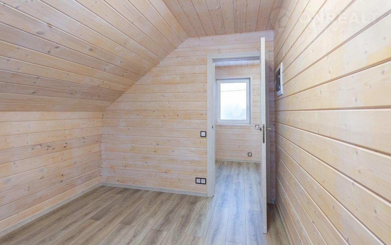 Первый этаж дома общей площадью 32,5 м². Здесь расположена просторная кухня-столовая с панорамными окнами и печью-камином, санузел. Со стороны участка сделана открытая терраса площадью 16 м². На втором мансардном этаже две спальни, каждая по 10,5 м² и небольшой холл, в котором можно оборудовать вместительный шкаф купе.