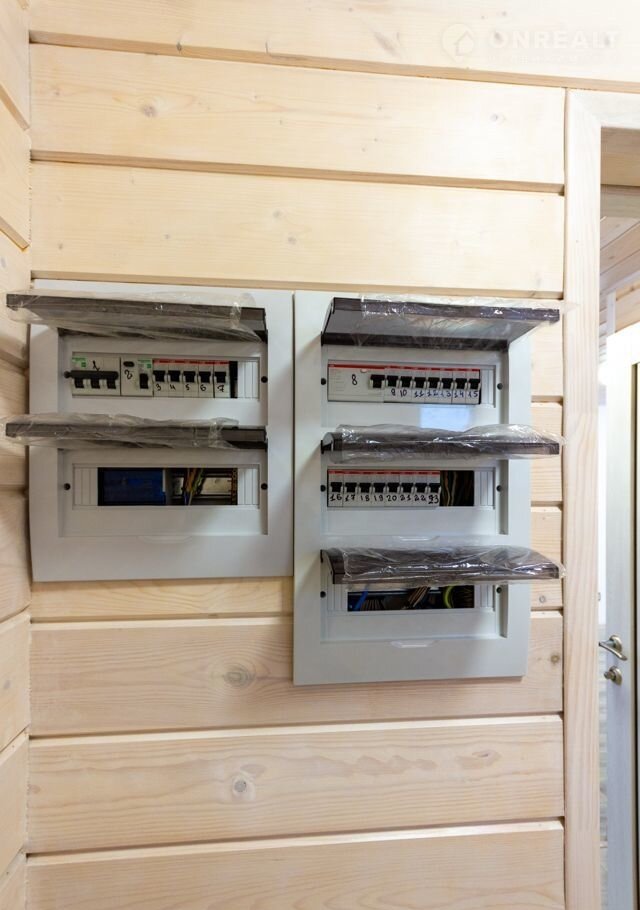 Дом полностью электрифицирован, организован ввод электричества на 15 КВт, в доме смонтирована вся проводка, установлены все осветительные приборы, выключатели, розетки. На лестничной зоне, реализованы проходные переключатели для комфортного управления светом с 1-го и 2-го этажей. Смонтировано уличное освещение террасы, освещение входа в дом, с датчиком движения и уличные розетки. Сделаны вводы воды и отводы канализации, остается только установить септик и пробурить скважину.