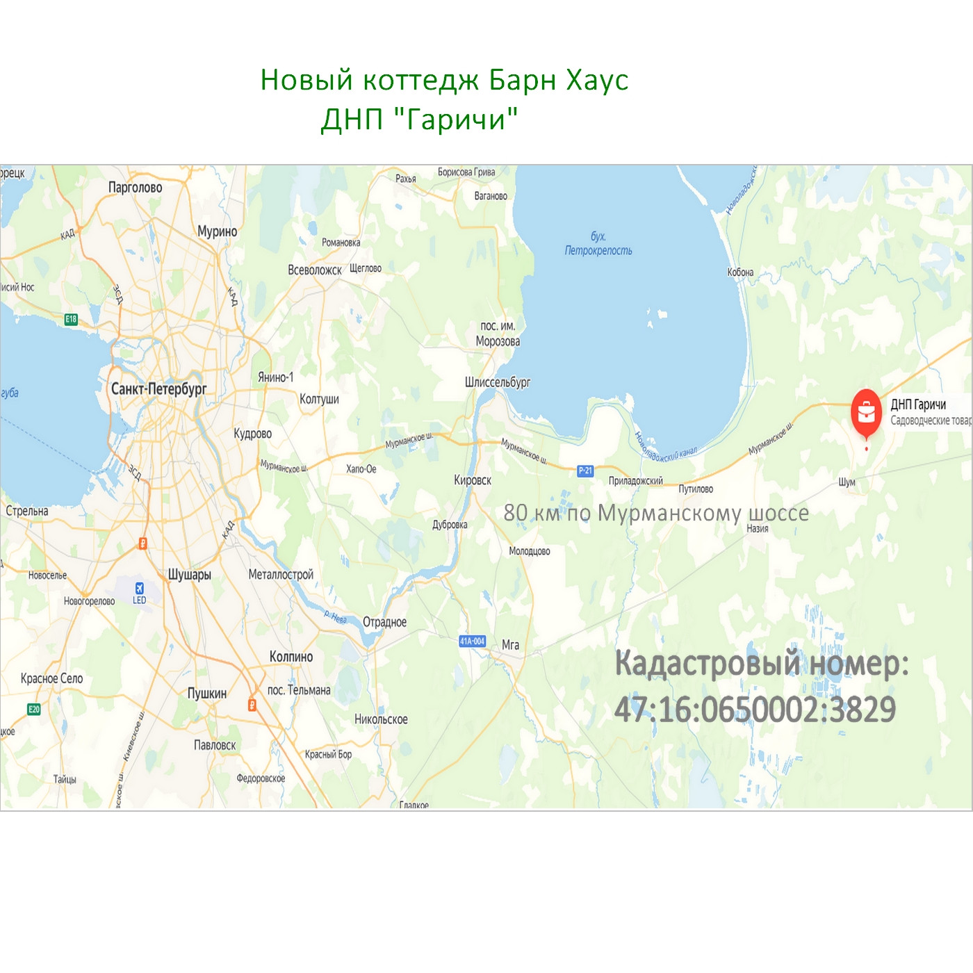 Современное Днп Гаричи, не далеко от города 71 км по Мурманской трассе (40 минут на машине от КАД), отличный подъезд. Дороги чистят круглый год.