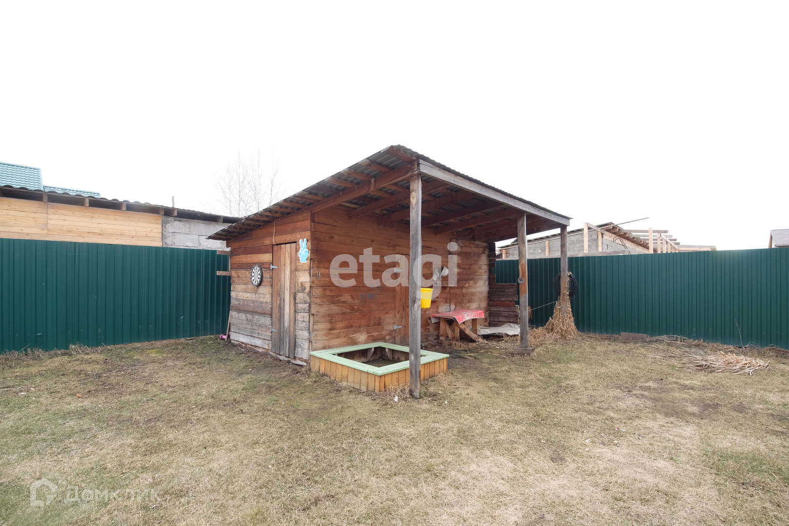 Участок огорожен профлистом, имеются автоматические ворота. Готова площадка под гараж на 3 машины, залит фундамент.