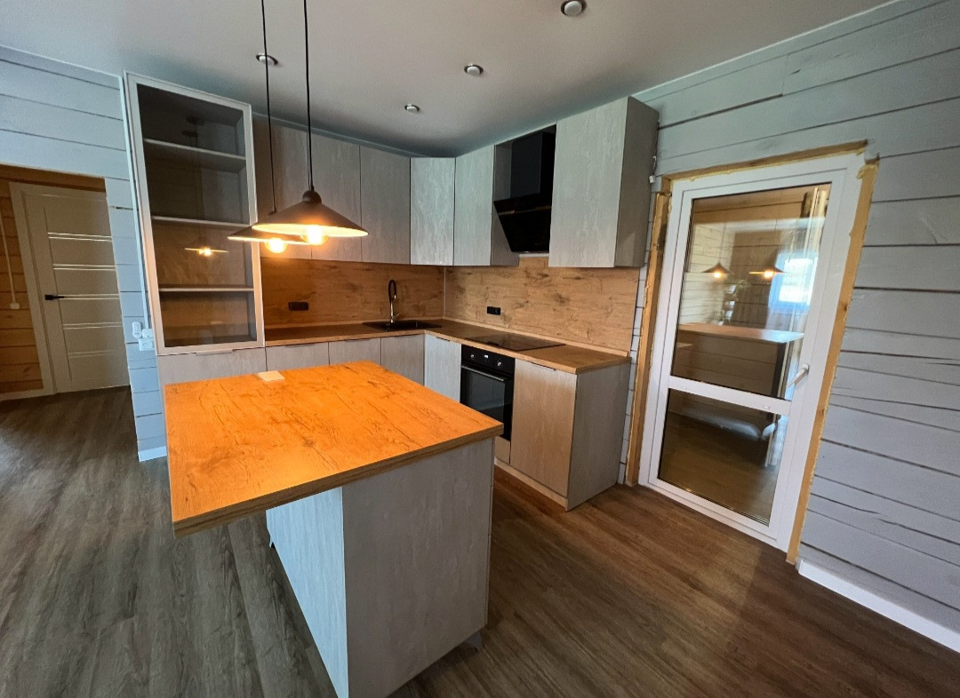 Остаётся кухонный гарнитур и обеденная группа