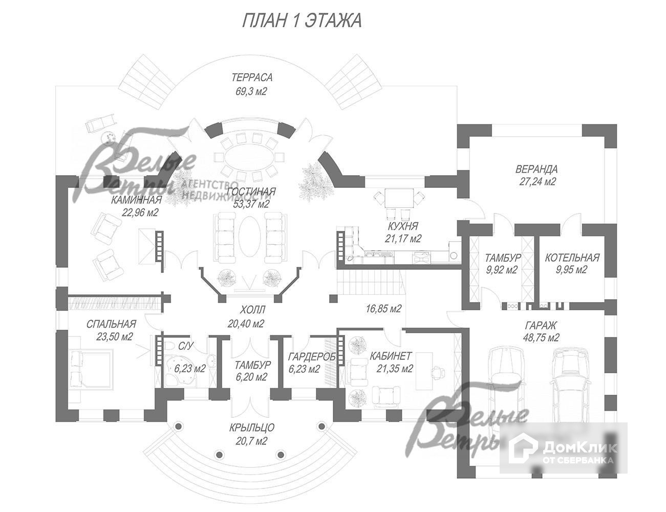 1-ый этаж: Свободная планировка. Предполагается следующий вариант: круговое крыльцо 21 кв.м, тамбур, гостиная 53 кв.м с выходом на открытую террасу 69 кв.м, каминная 23 кв.м, кухня 21 кв.м с выходом на застекленную веранду 27 кв.м, спальня 24 кв.м, кабинет 21 кв.м, гардероб 6 кв.м, санузел 6 кв.м, коридор 17 кв.м, гараж 49 кв.м, тамбур 10 кв.м, котельная 10 кв.м с отдельным входом..