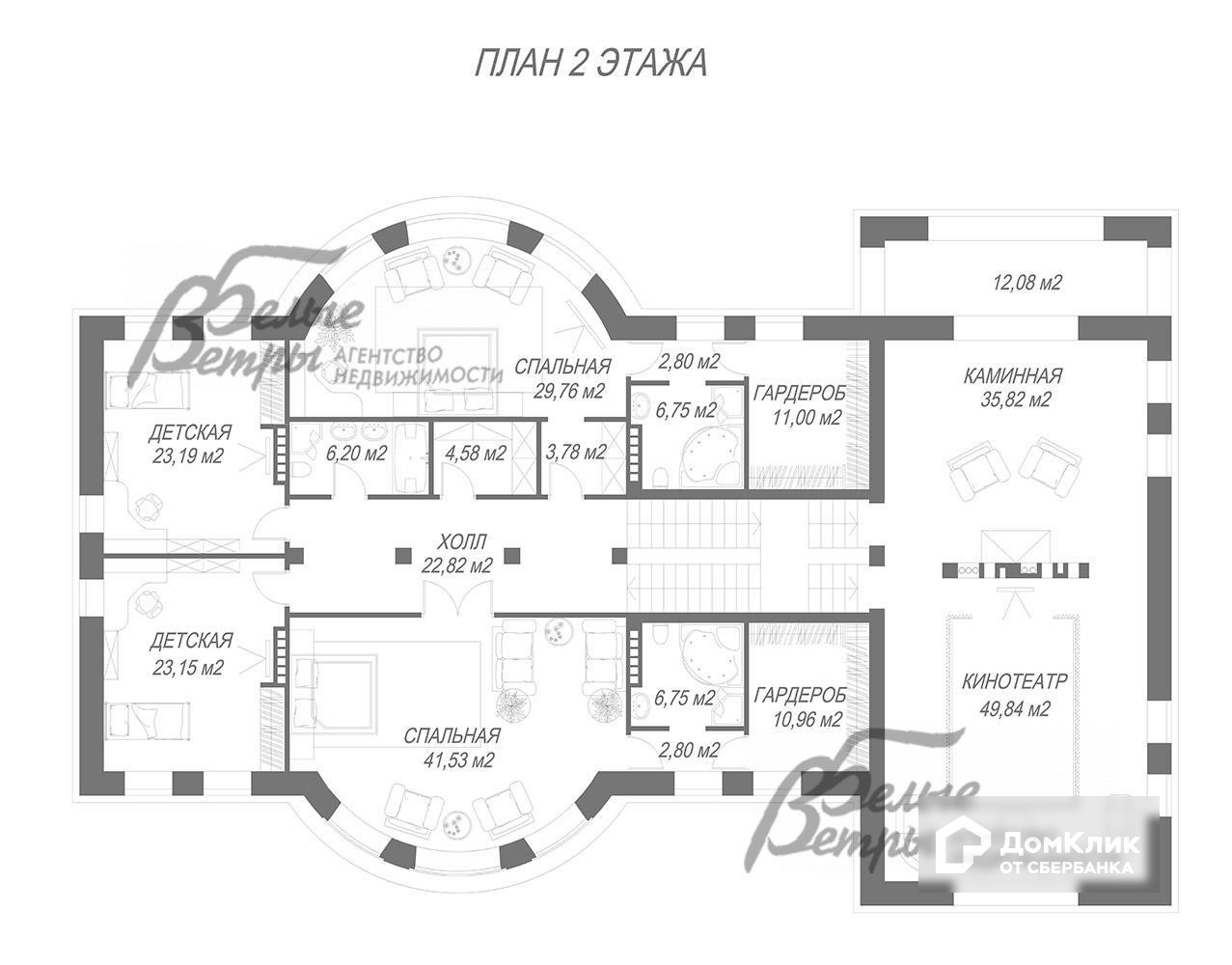 2-ой этаж: Свободная планировка. Предполагается следующий вариант: холл 23 кв.м, каминная 36 кв.м с выходом на балкон 12 кв.м, кинотеатр 50 кв.м, мастер спальня 42 кв.м с гардеробной 11 кв.м и санузлом 7 кв.м, спальня 30 кв.м с гардеробной 11 кв.м и санузлом 7 кв.м, 2 детские по 23 кв.м, гардеробная 5 кв.м, санузел 6 кв.м..