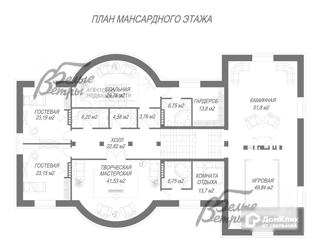 3-ий этаж: Свободная планировка. Предполагается следующий вариант: холл 23 кв.м, каминная 52 кв.м, игровая 50 кв.м, спальня 42 кв.м с гардеробной 14 кв.м и санузлом 7 кв.м, спальня 30 кв.м с гардеробной 14 кв.м и санузлом 7 кв.м, 2 гостевых спальни по 23 кв.м, гардеробная 5 кв.м, санузел 6 кв.м..