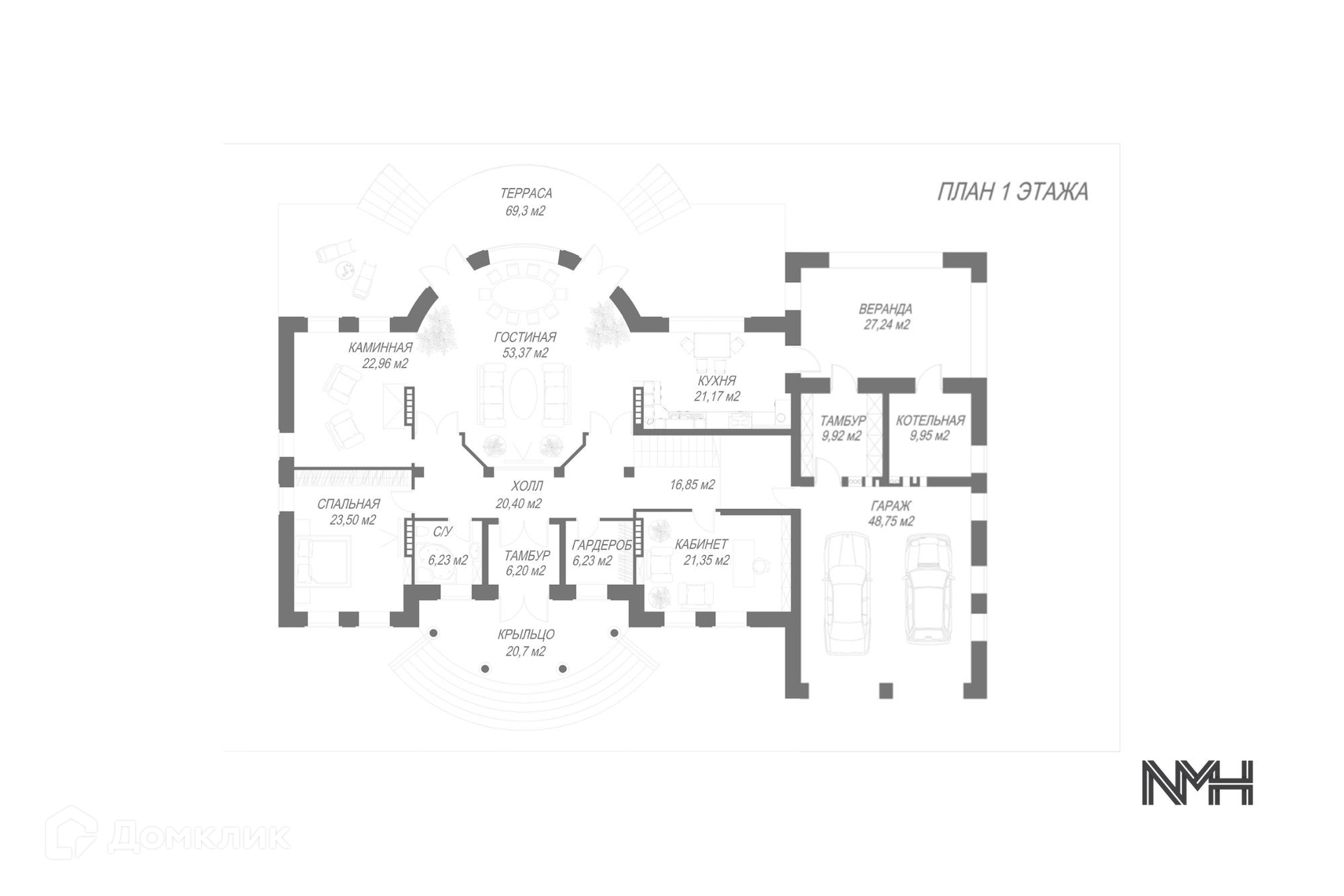 Из особенностей: высокие потолки, большая площадь остекления, гараж на 2 автомобиля, панорамный вид на лес.