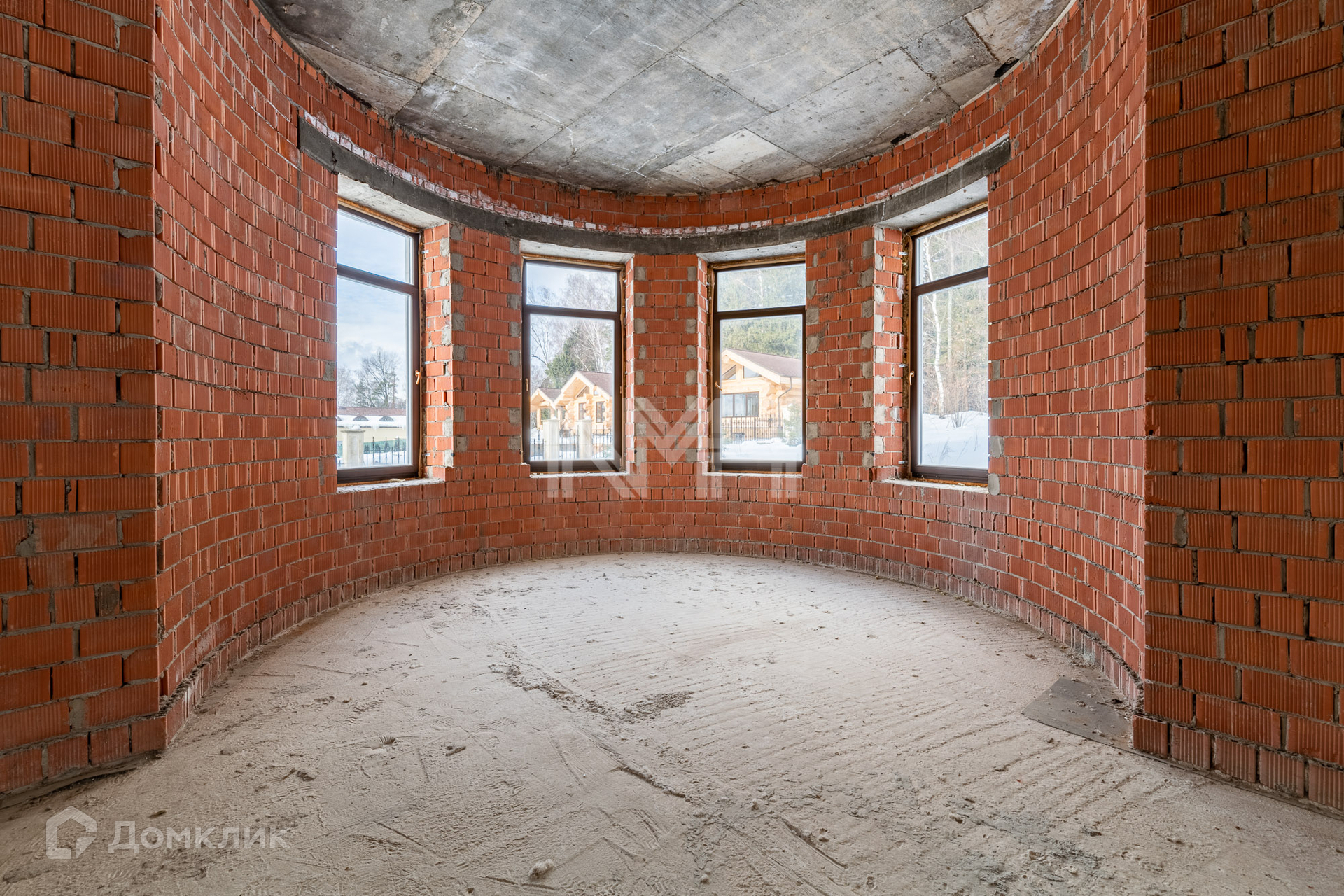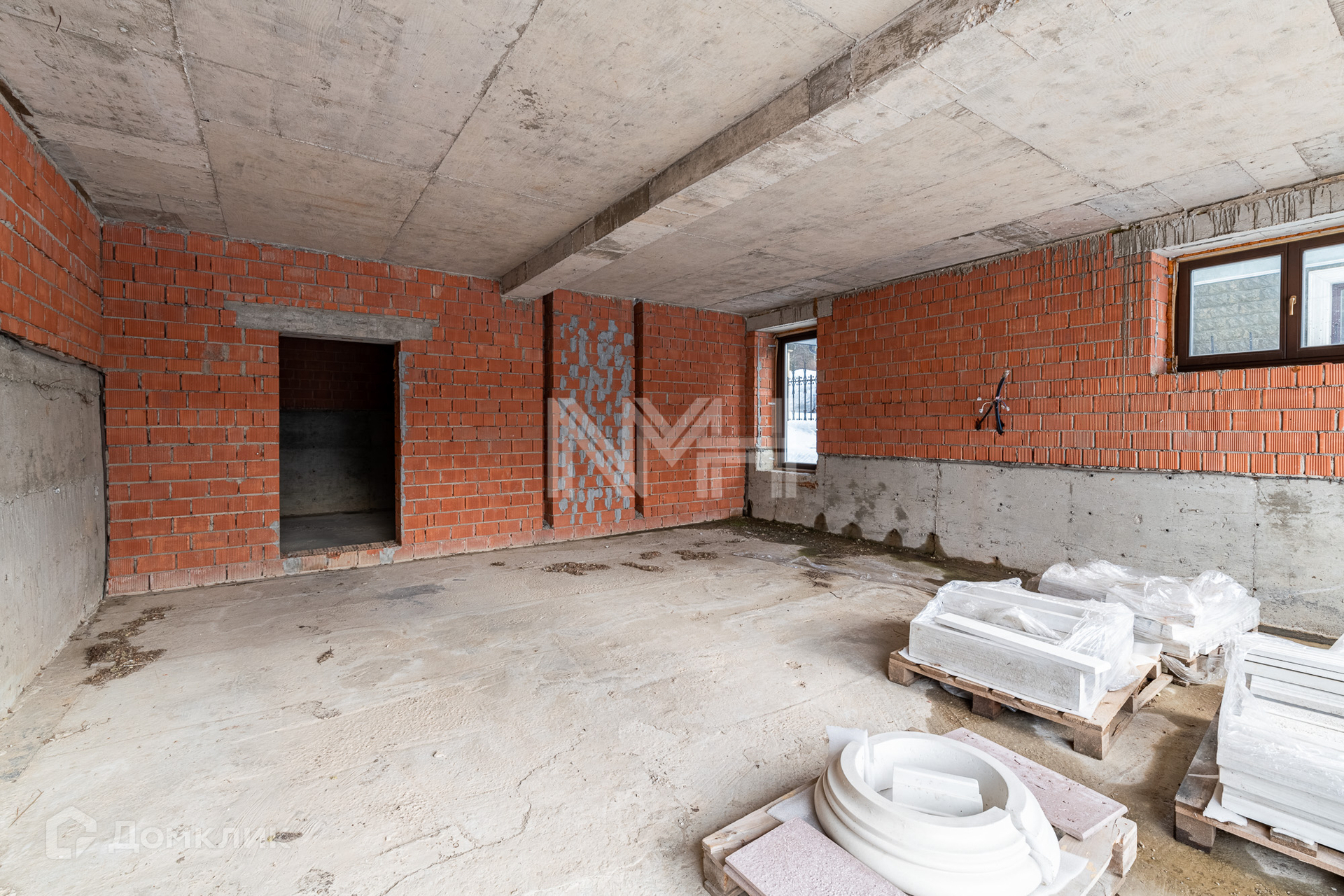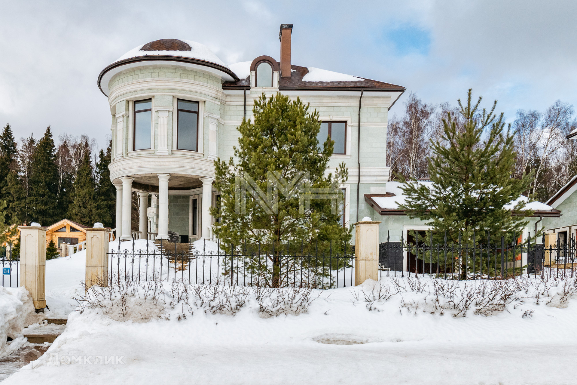Конструктив: монолит-кирпич, фасад облицован камнем травентин, кровля — мягкая черепица Tegola, высота потолков 4.2 м, большая площадь остекления, полукруглый вход и эркер с балконом второго этажа оформлены колоннами. В доме на данный момент свободная планировка. Коммуникации заведены в дом.