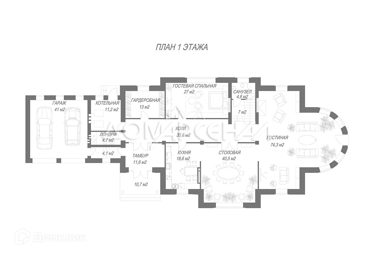 1 этаж: Тамбур, холл, кухня-столовая, гостиная, спальня, гардеробная, с/у, прачечная, котельная с дополнительным входом с улицы, теплый гараж на 2 м/м