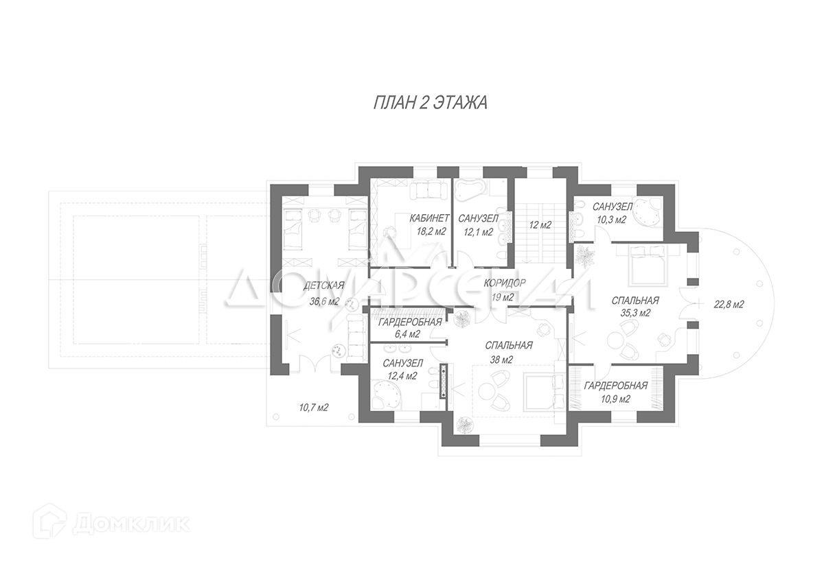 2 этаж: Холл, мастер-спальня с ванной комнатой, гардеробной и выходом на балкон, спальня с ванной комнатой и гардеробной, детская с игровой, кабинет, с/у