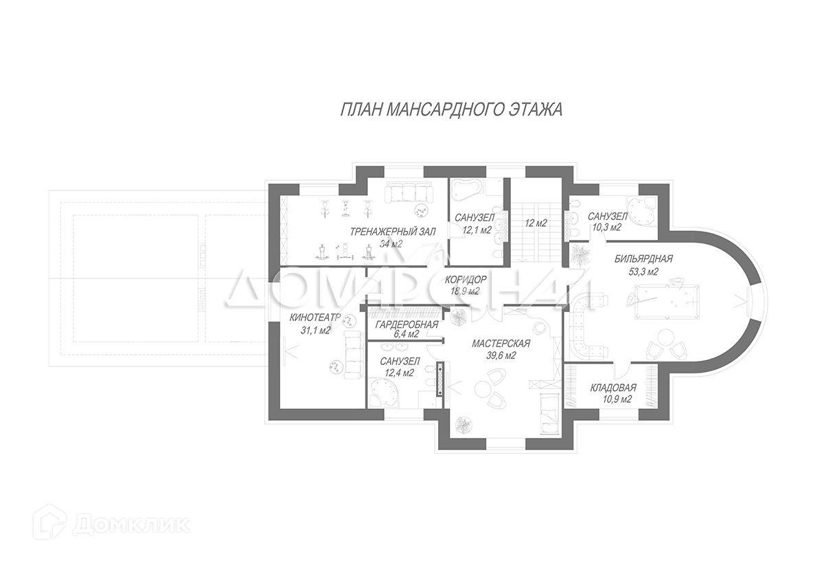 Мансарда: Холл, тренажерный зал с ванной комнатой, бильярдная с кладовой и ванной комнатой, мастерская с гардеробной и ванной комнатой, кинотеатр