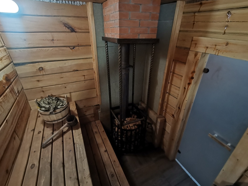 — растопка сауны производиться из гостиной и выполнена в стилистике камина,