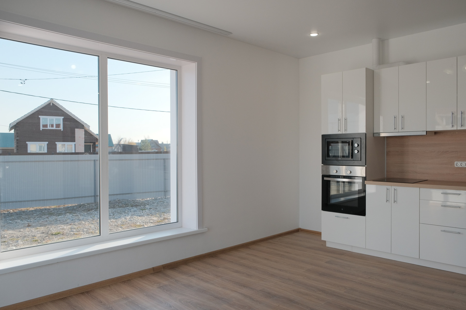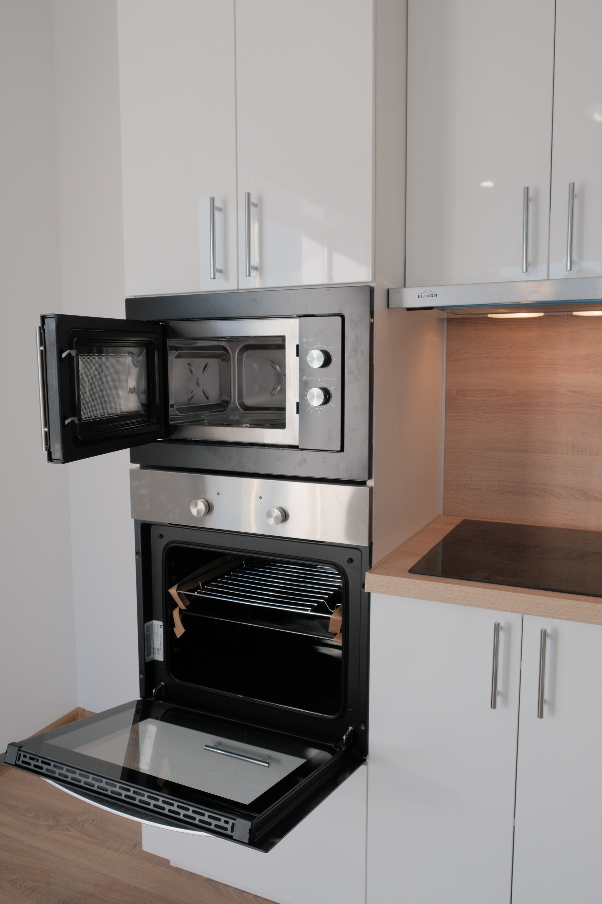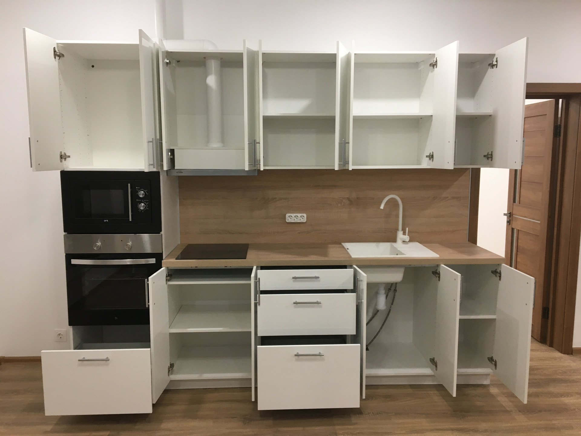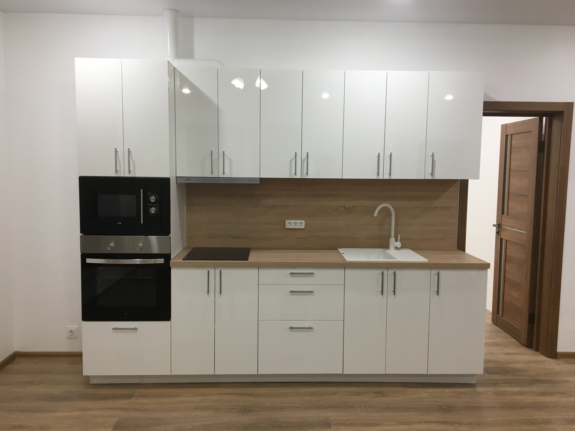 Установлен современный новый кухонный гарнитур со всей встроенной техникой.