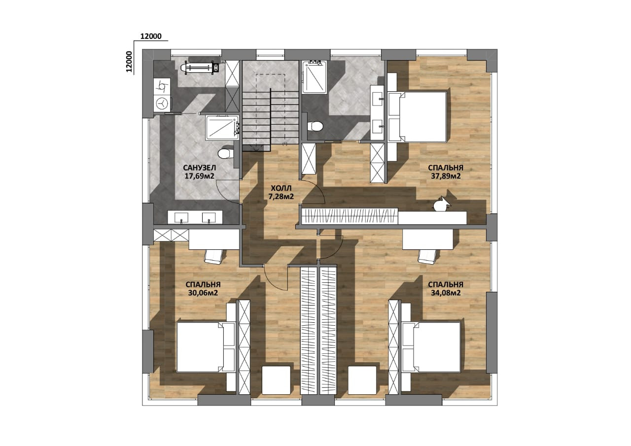 На втором этаже расположена главная спальня с собственным санузлом и проходной гардеробной зоной (37,9 м2).