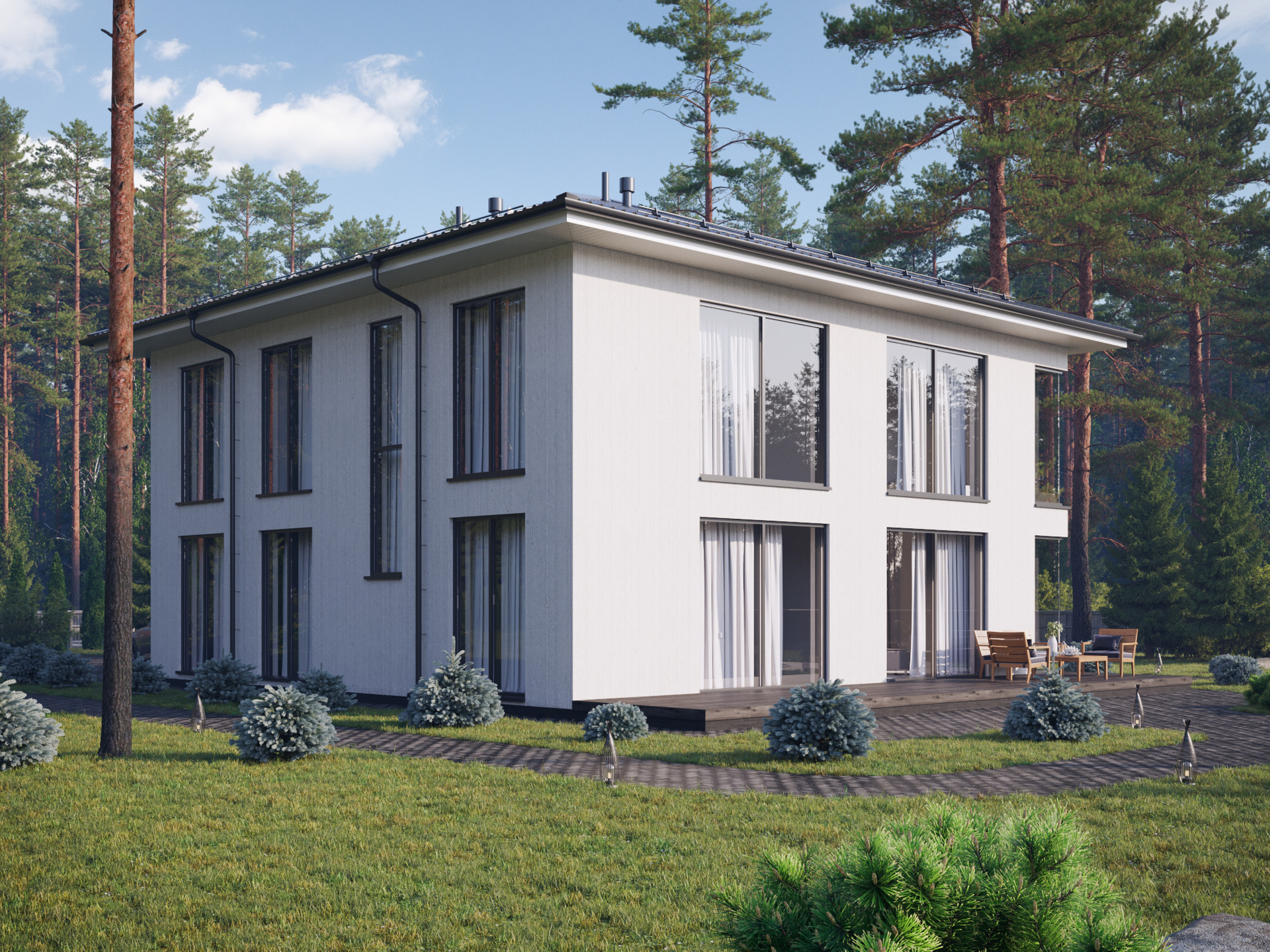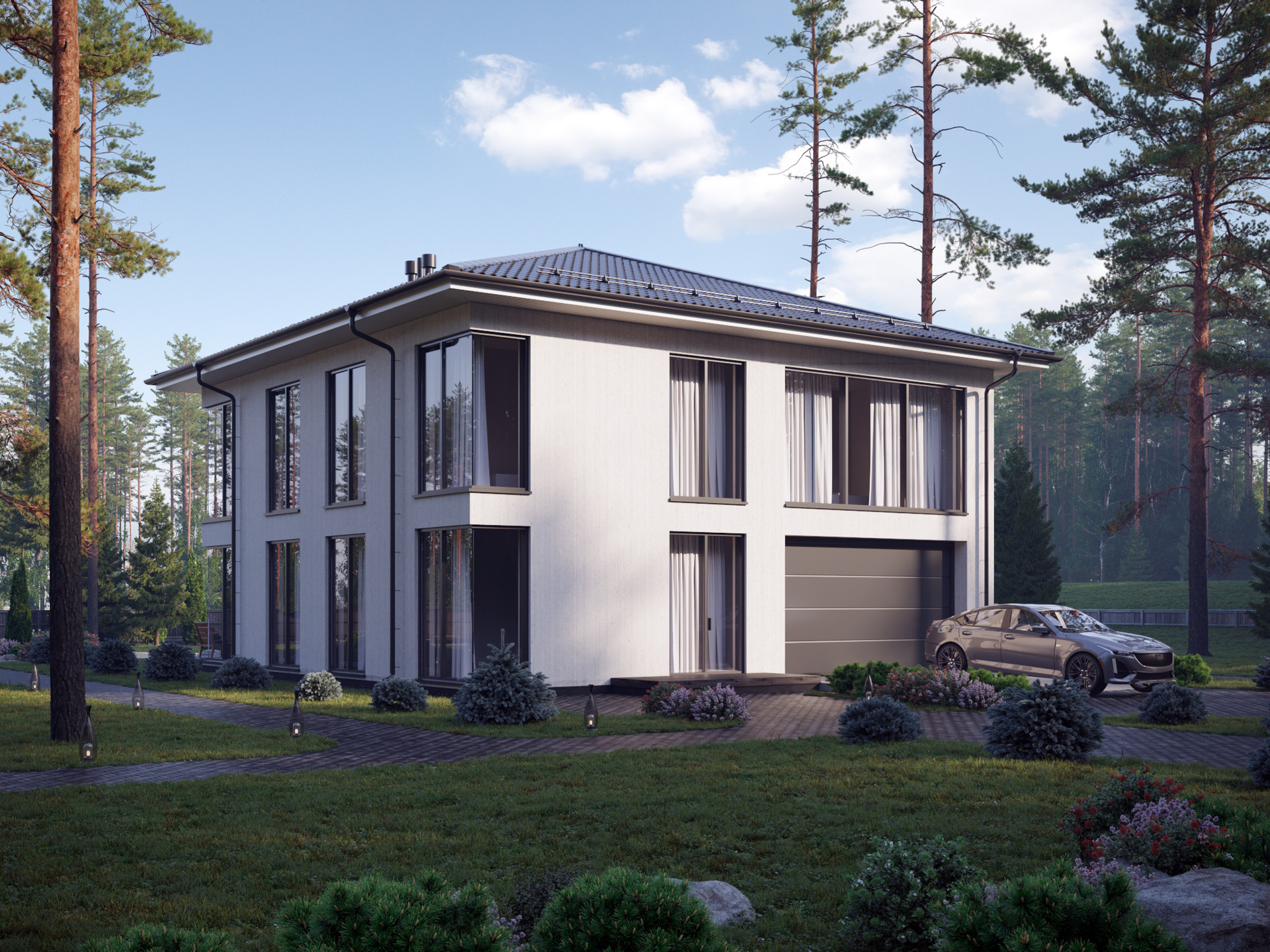 Чтобы достичь этого эффекта, мы пересчитали все деревья в будущем поселке и деликатно вписали дома в существующий природный ландшафт.
