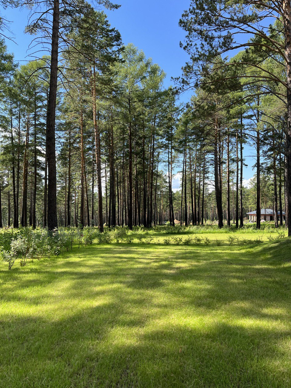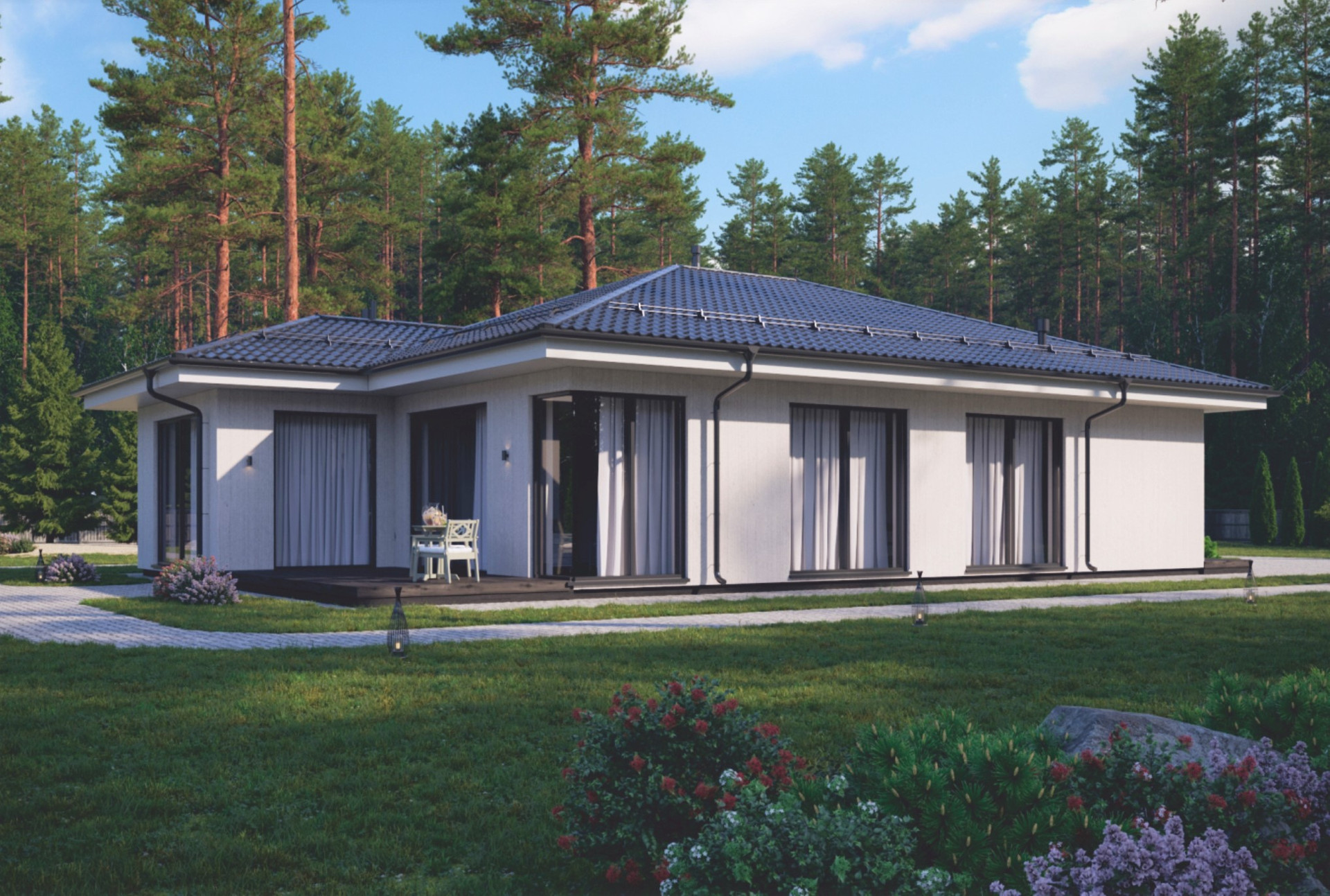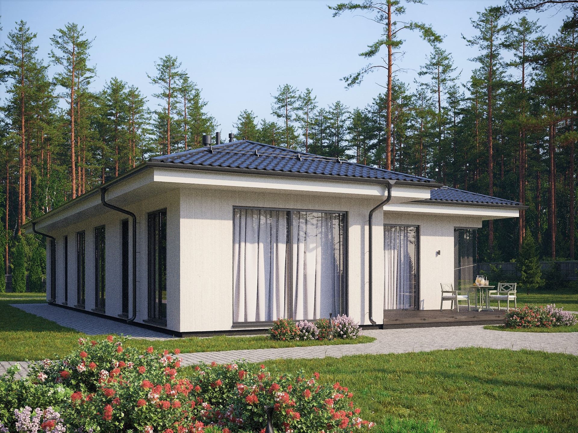 Чтобы достичь этого эффекта, мы пересчитали все деревья в будущем поселке и деликатно вписали дома в существующий природный ландшафт.