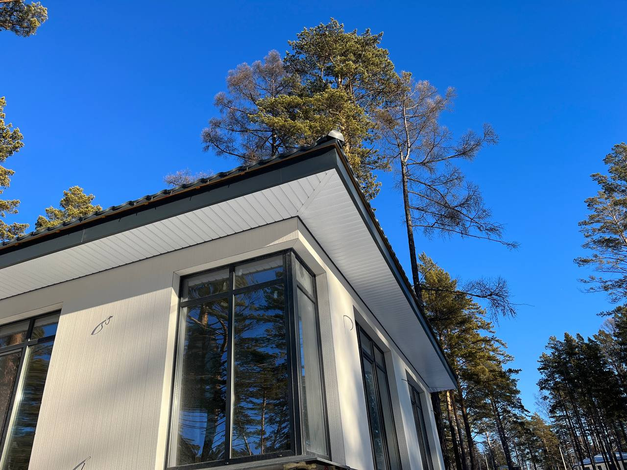 Остекление – ПВХ профиль и мультифункциональный стеклопакет. В зоне гостиной – угловое остекление.