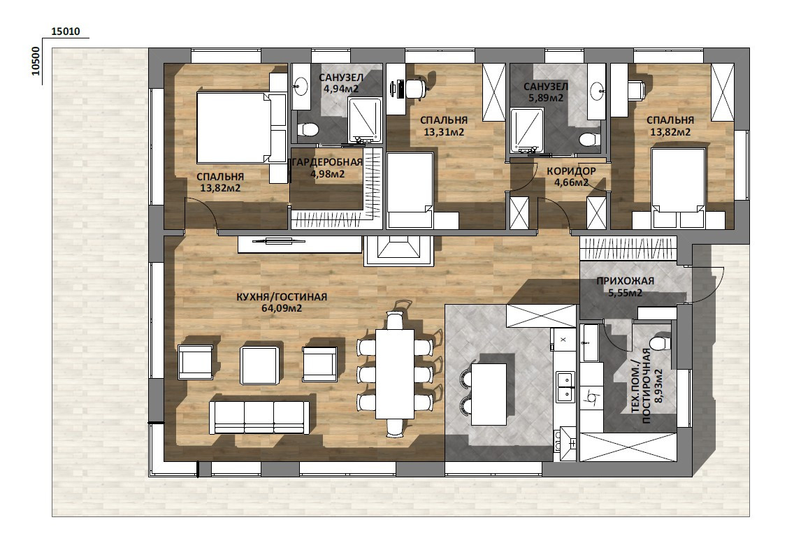 Открытое пространство включает гостиную, столовую и кухню и имеет выход на террасу. Это единое пространство (64,7 м2)