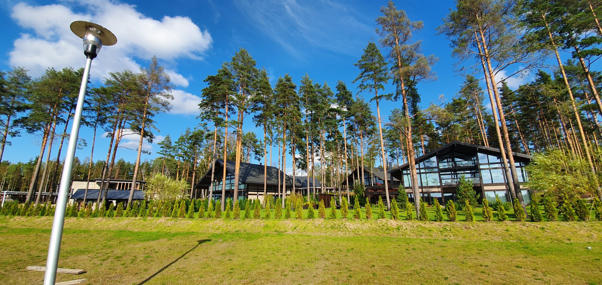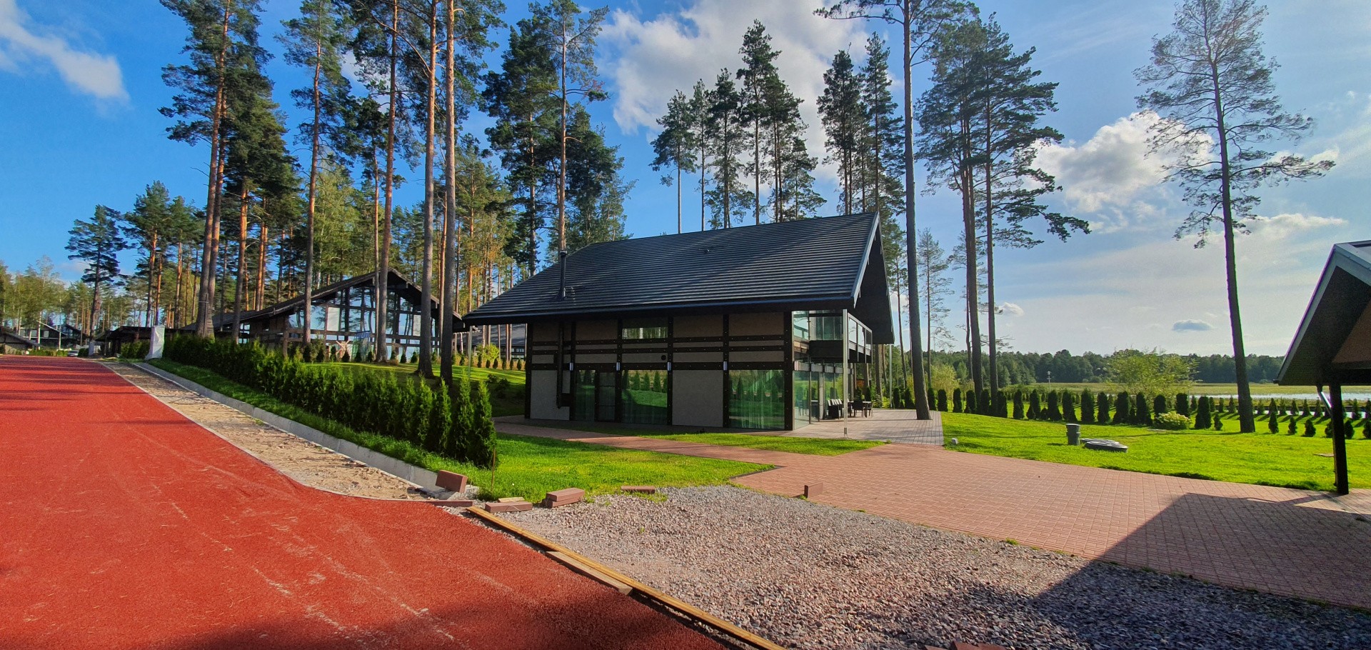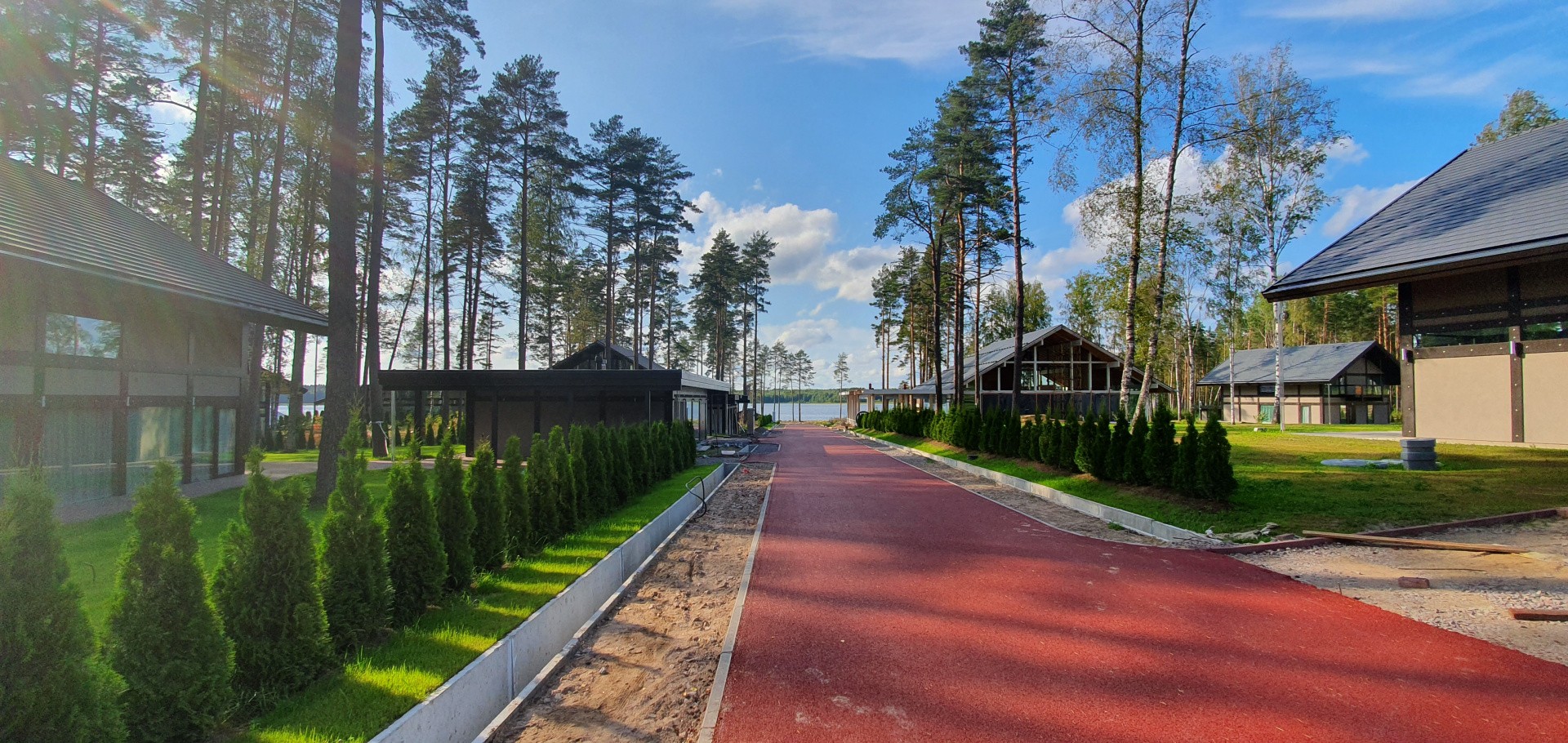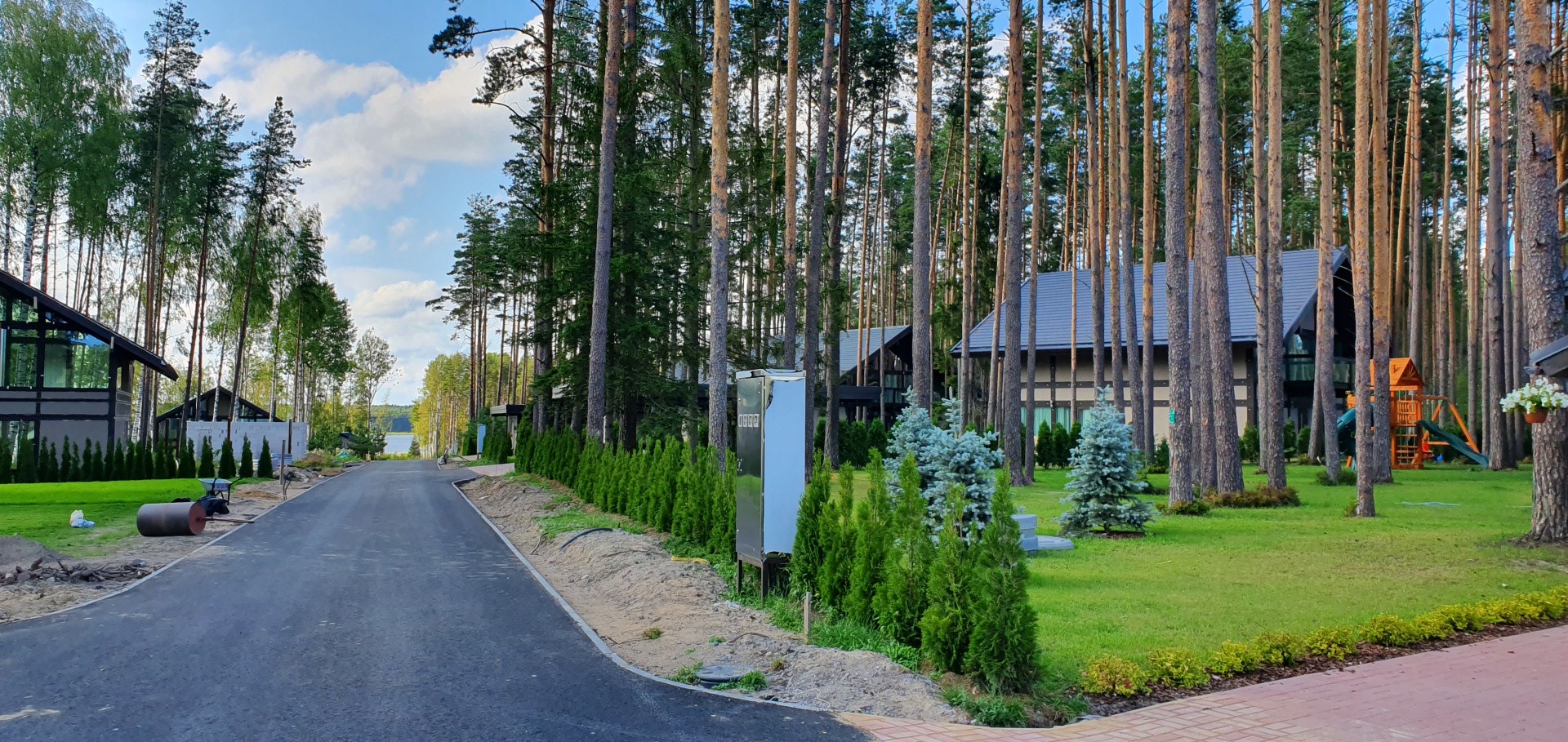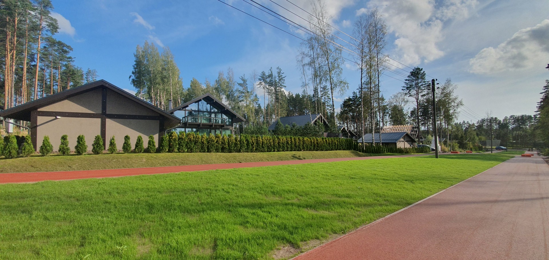 В посёлке всего 45 участков с домовладениями. На каждом участке есть крытая парковка на 2-3 автомобиля, хозяйственное помещение, посевной газон и ландшафтный дизайн.