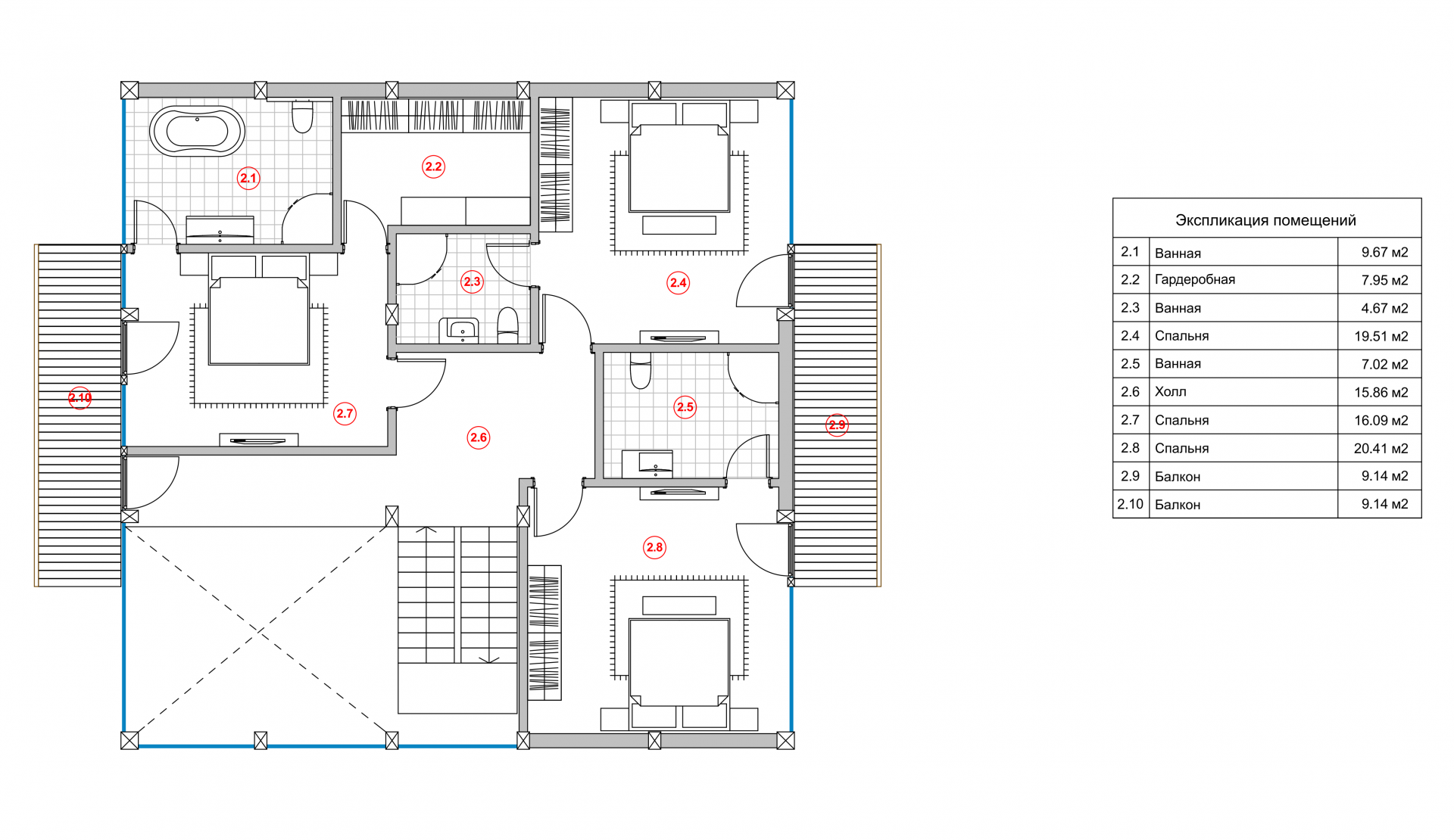Планировка второго этажа подразумевает отдельную ванную для каждой спальни. Таким образом никому не придётся ходить в душ «по расписанию», у каждого будет свой туалетный столик. Дом, где пространство создано персональным.