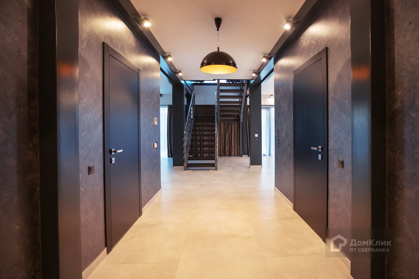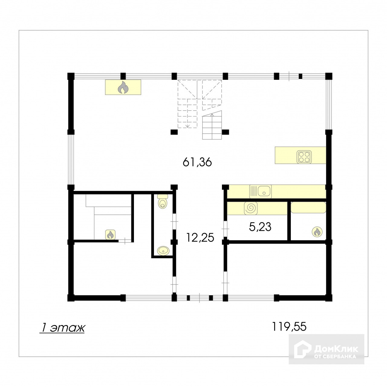На первом этаже предусмотрены: просторная кухня-столовая с выходом на террасу, зона гостиной отделена лестницей на второй этаж, логически разделяя общее пространство. Камин установлен на круговом диске, можно повернуть в любую сторону. На 1 этаже, при входе, сделана большая spa-зона с комнатой отдыха с электрической сауной, установлена массажная система. Напротив сауны - кабинет или жилая комната, рядом сан.узел и постирочная.