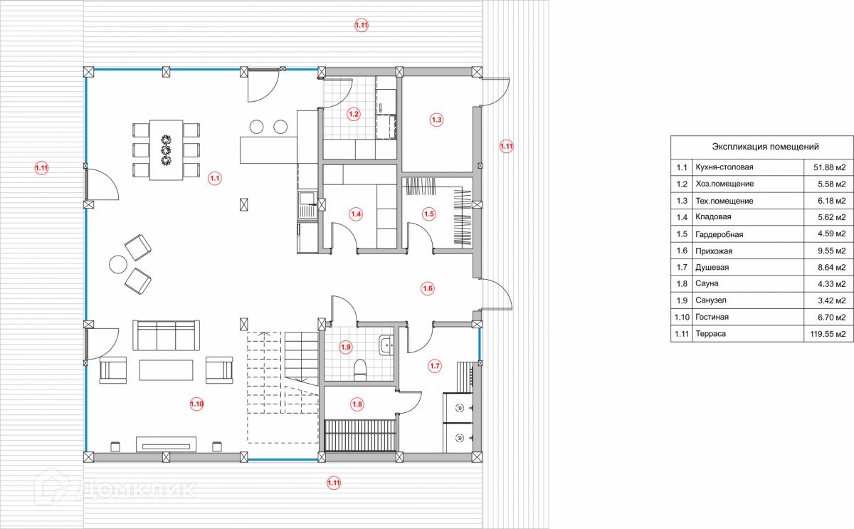 На первом этаже расположены хозяйственные и технические помещения, гардеробная и гостевой санузел. Расслабиться и «оздоровиться» хозяева и их гости смогут в сауне с душевой зоной.