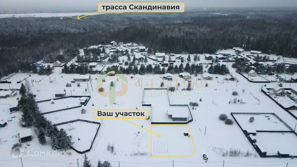 Участок имеет удобные подъездные пути, буквально 500 метров по лесной дороге от Скандинавского шоссе до въезда в поселок.