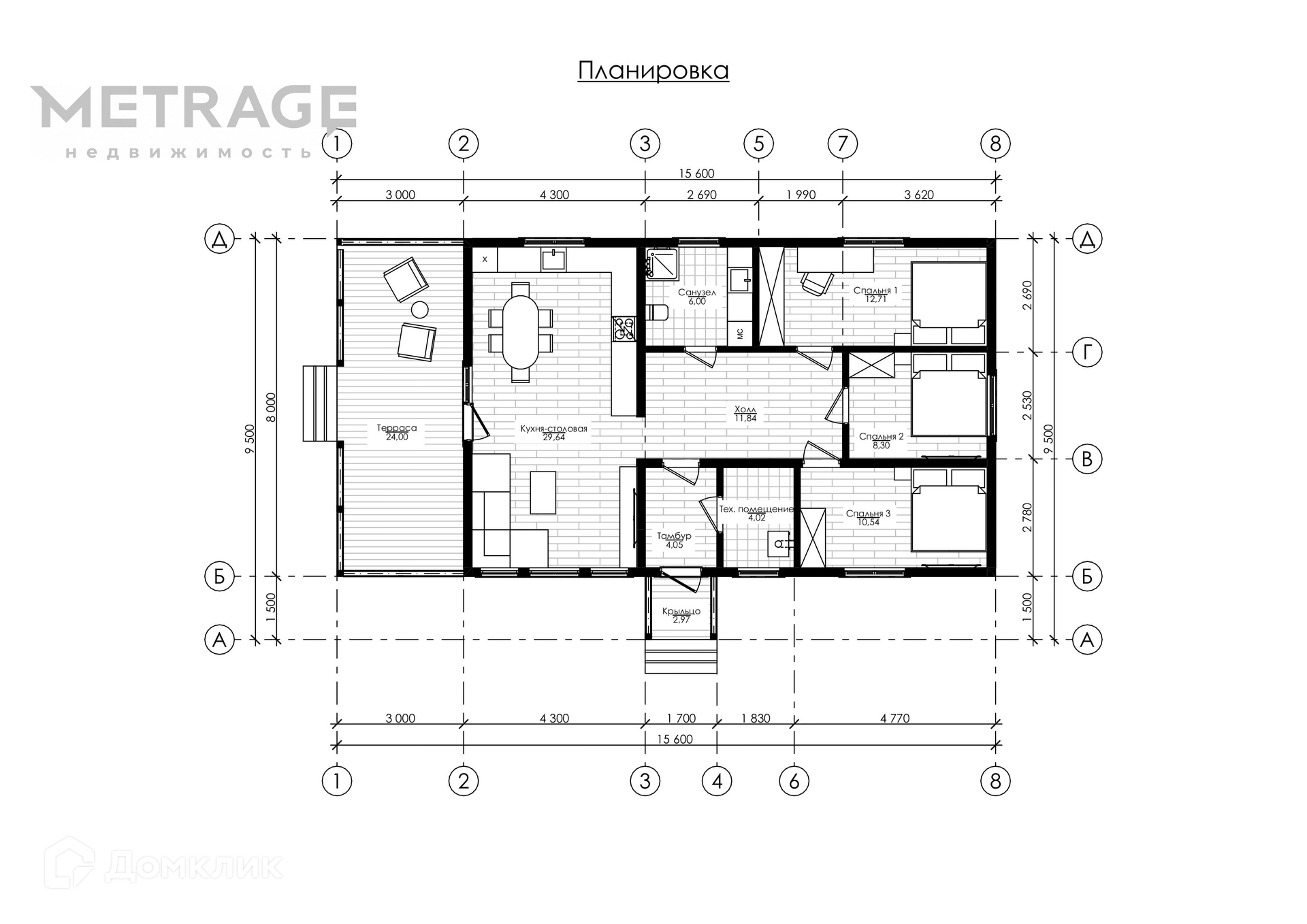 Одноэтажный дом 9.5 на 15.6 метров, общей площадью 124.8 м2, из СИП панелей, с бойлерной, террасой и тремя спальнями на первом этаже!