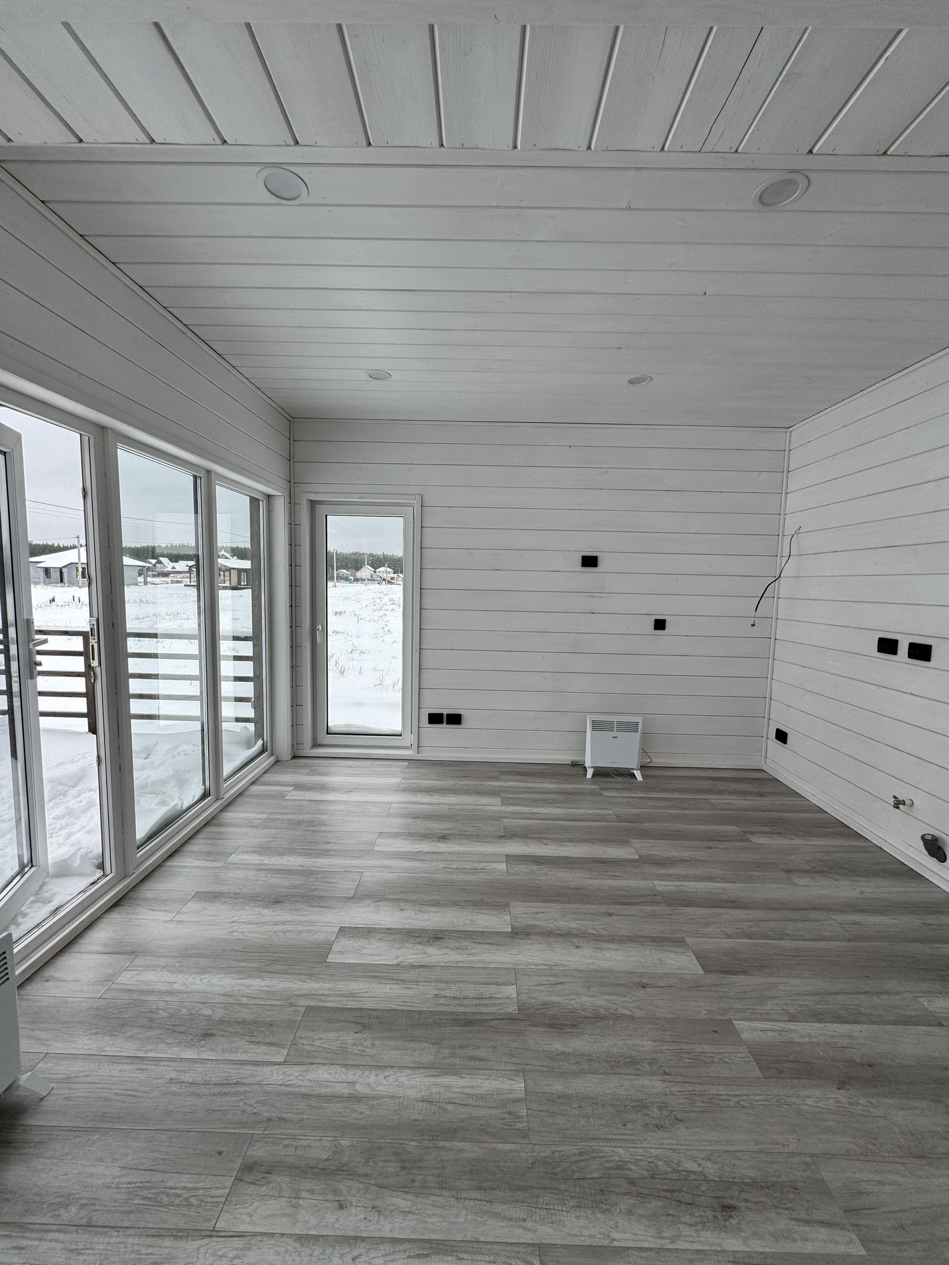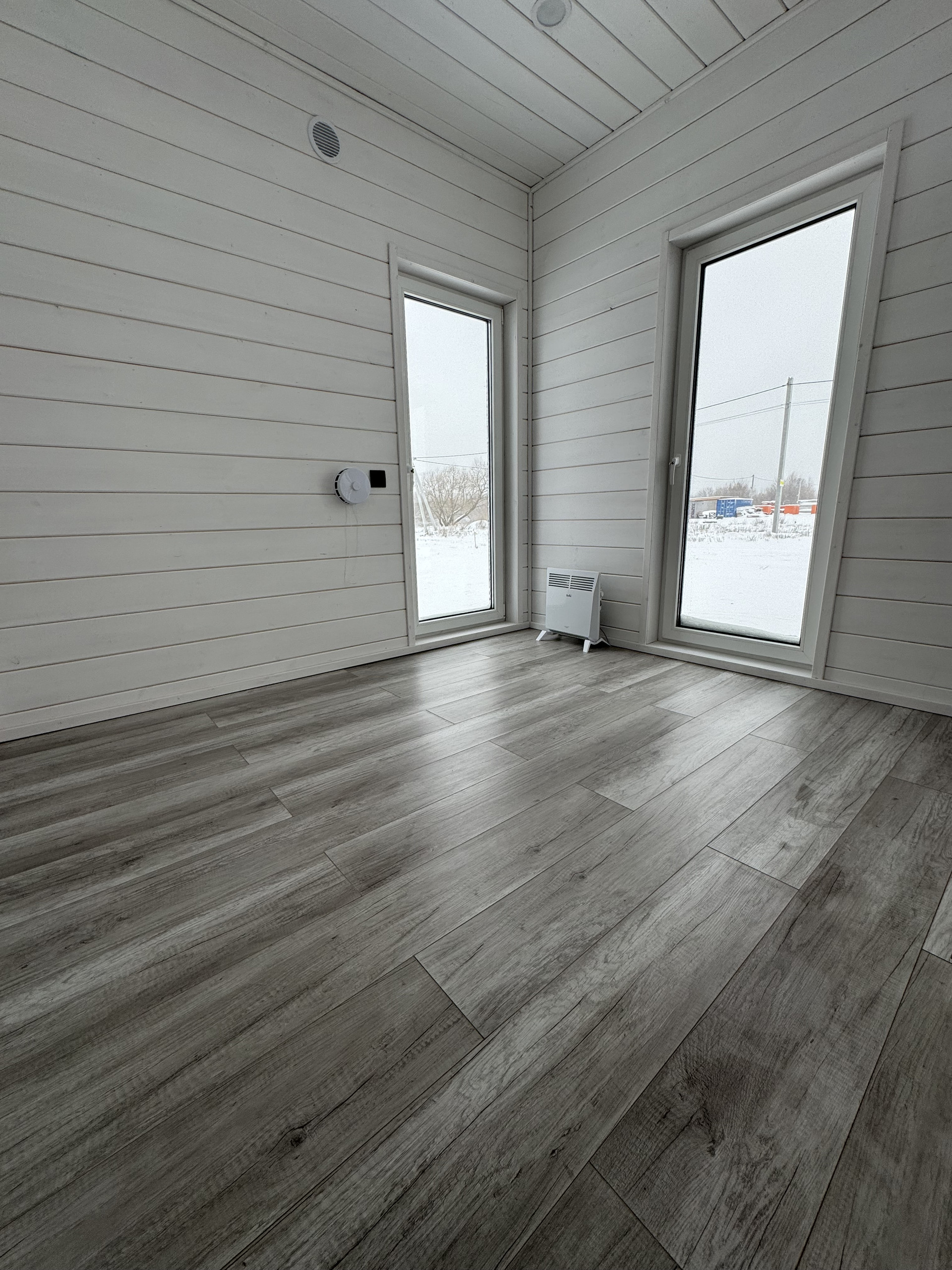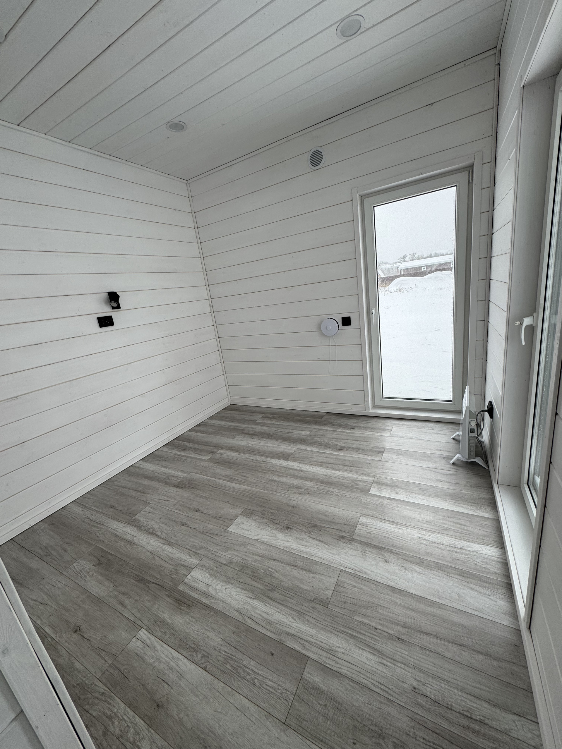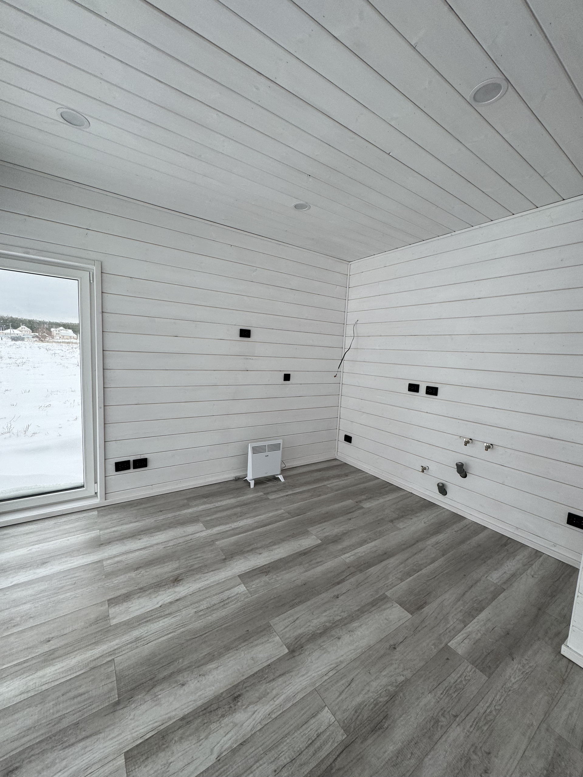 Жилая зона (умный дом, все коммуникации управляются со смартфона): отопление - электрические конвекторы, сплит-система, 3 рекуператора, освещение. Пол в жилой зоне - ламинат 33 класса.