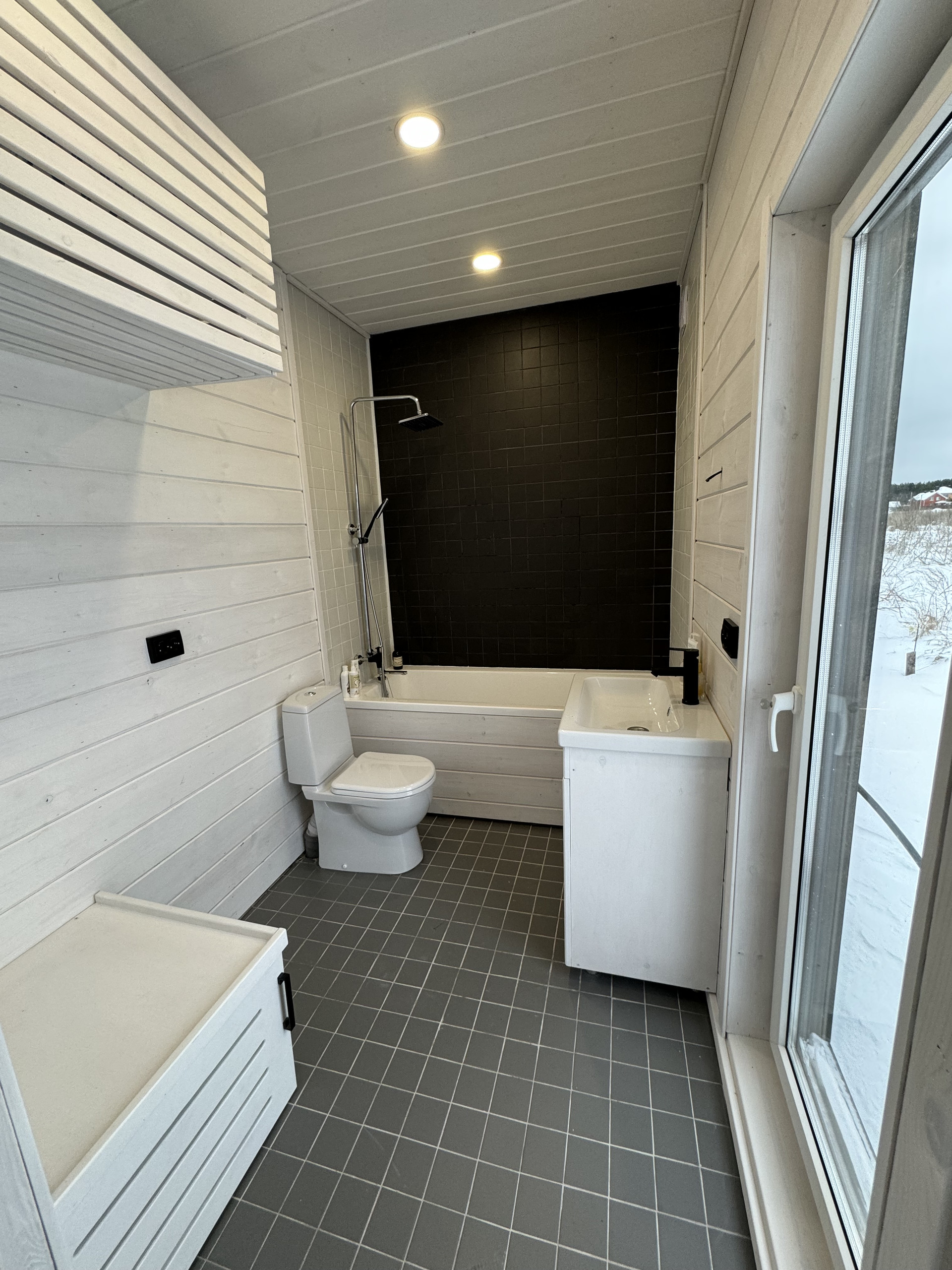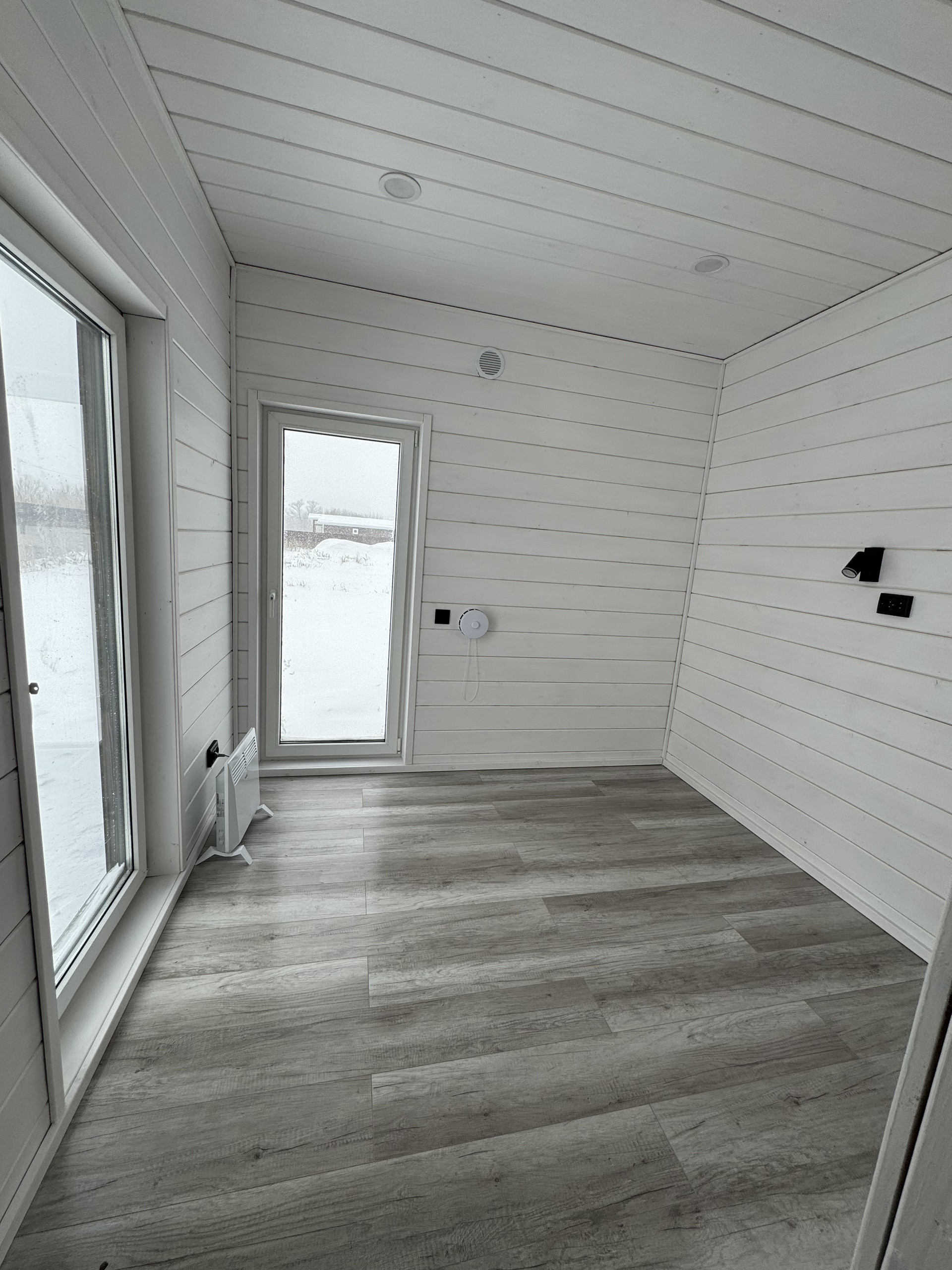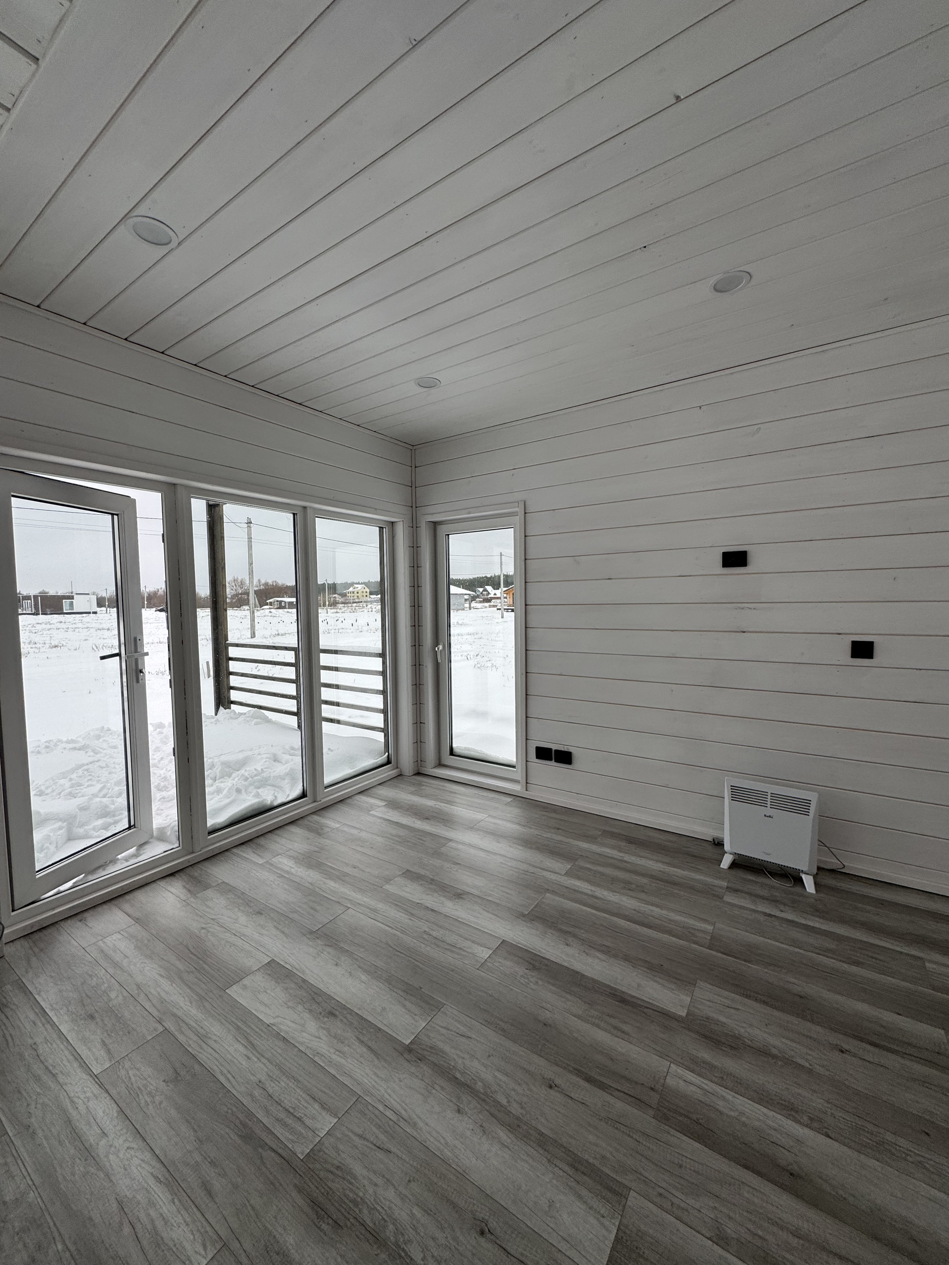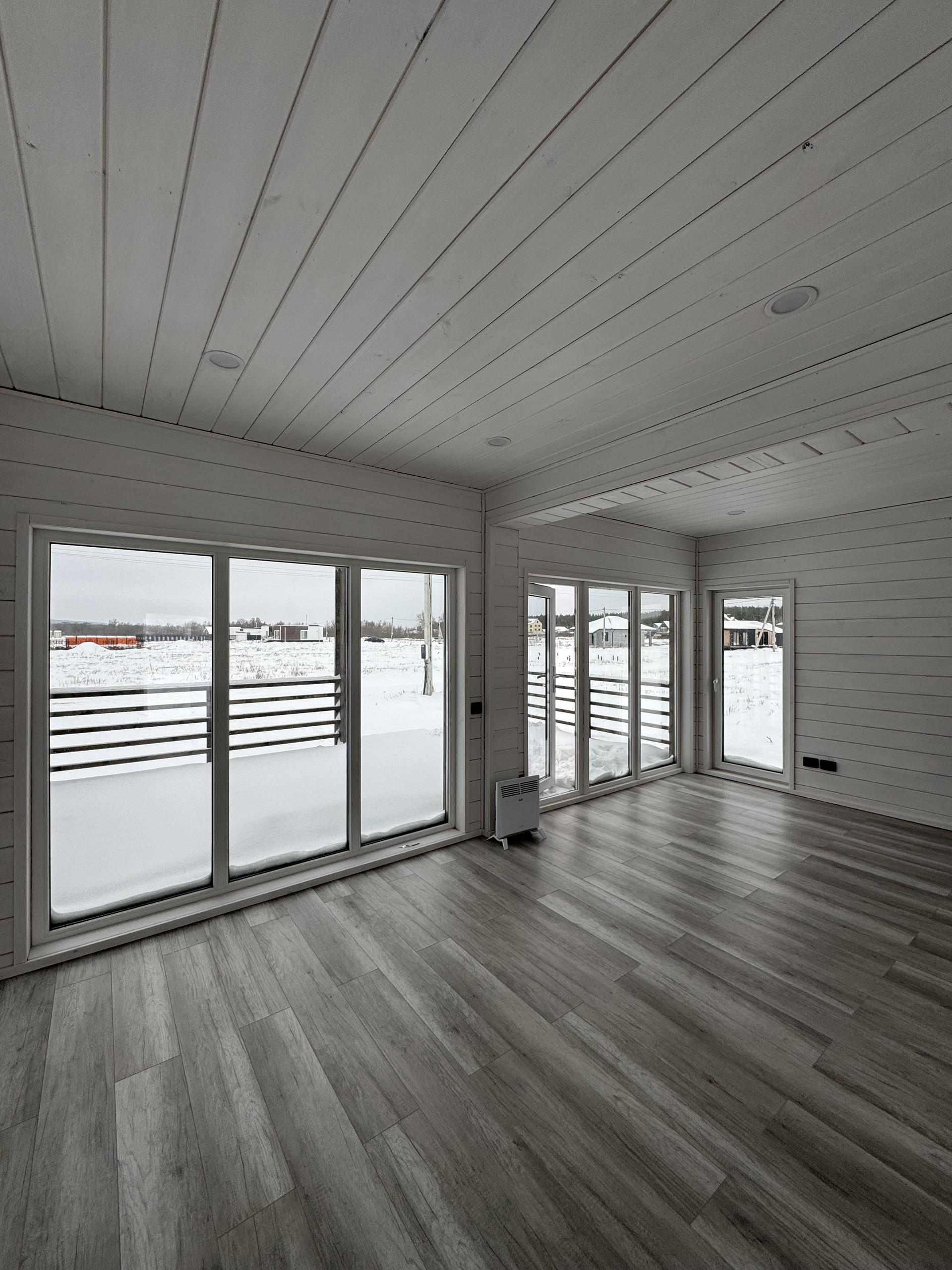 Жилая зона (умный дом, все коммуникации управляются со смартфона): отопление - электрические конвекторы, сплит-система, 3 рекуператора, освещение. Пол в жилой зоне - ламинат 33 класса.