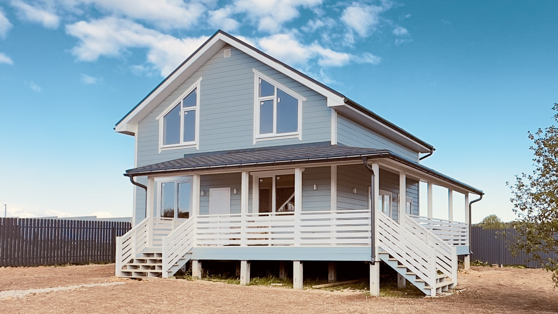Дом построен в 2023 году по каркасной технологии на свайном железобетонном фундаменте. Кровля из мягкой черепицы. Сделана водосточная система.