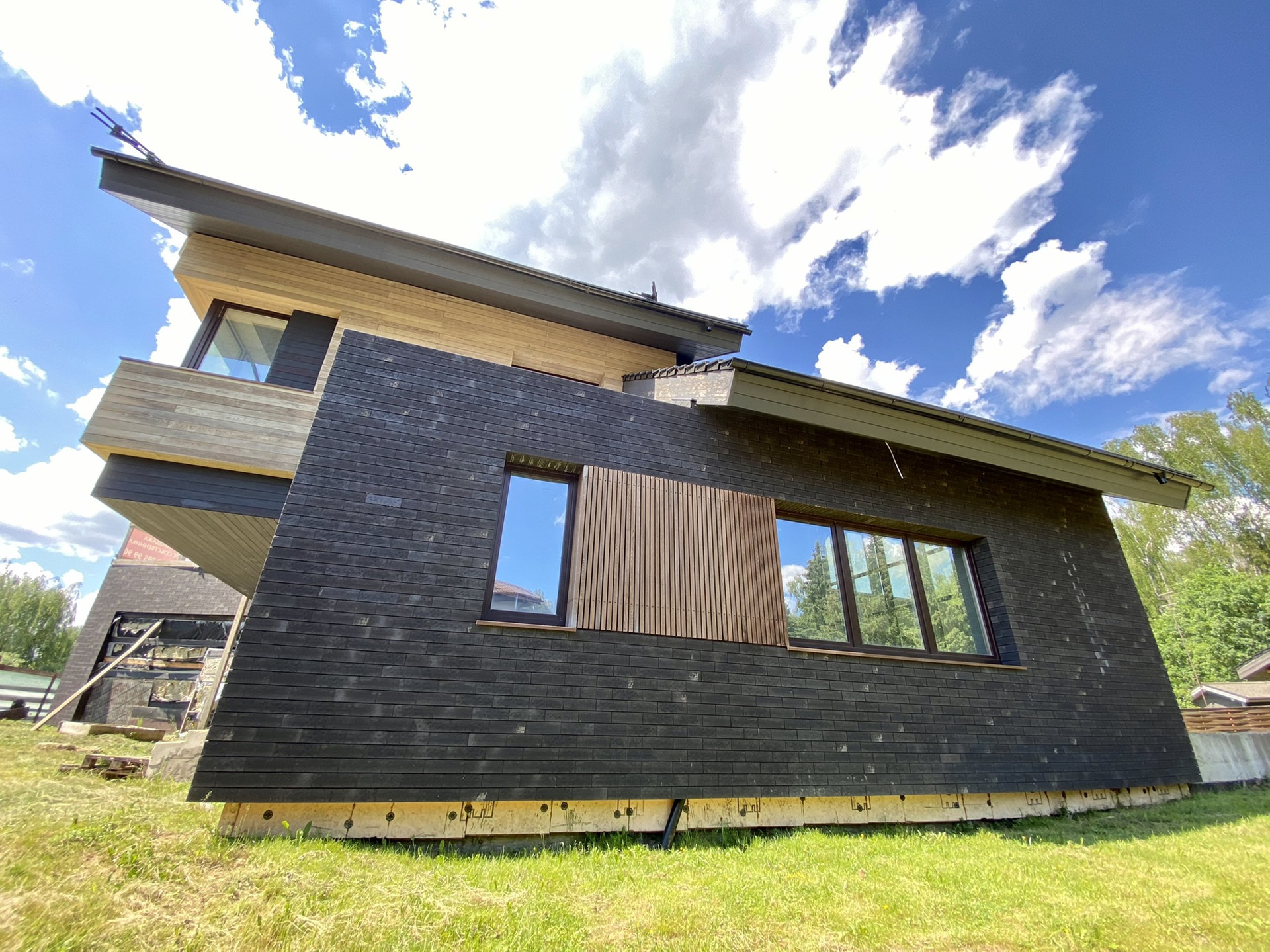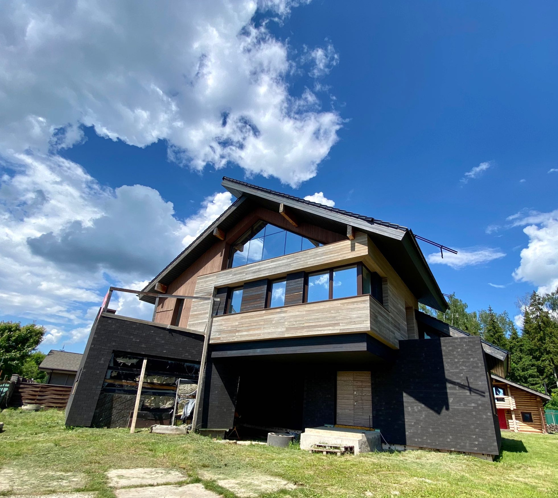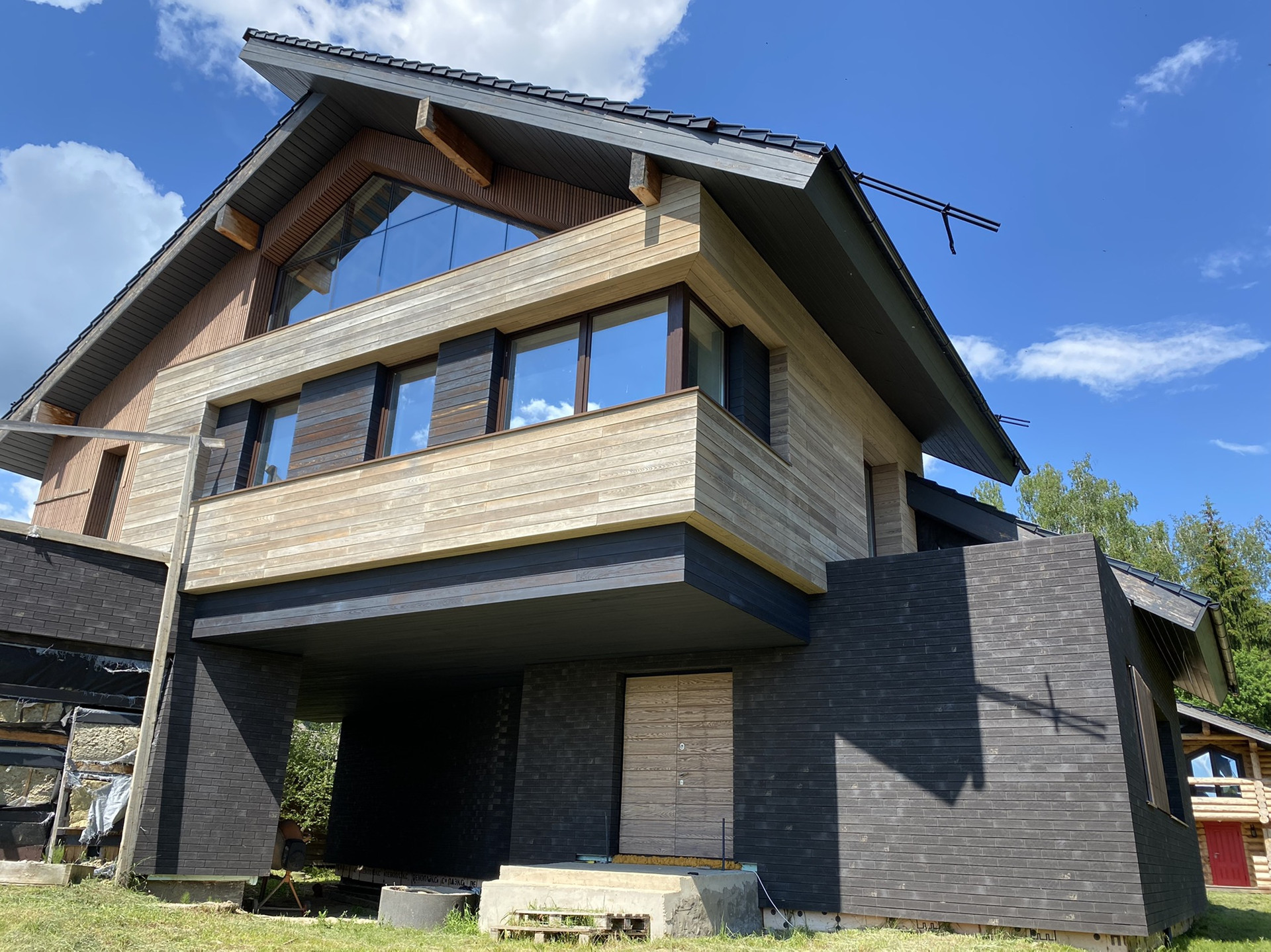 Задачей для архитекторов стояло исполнить проект с отсылкой к стилю шале в современном прочтении. Дом имеет удачное расположение в поселке и граничит с вековым лесом (собственный выход). В отделке использованы натуральные материалы дерево, керамическая черепица Laumans, немецкая отделочная плитка и дерево (лиственница).