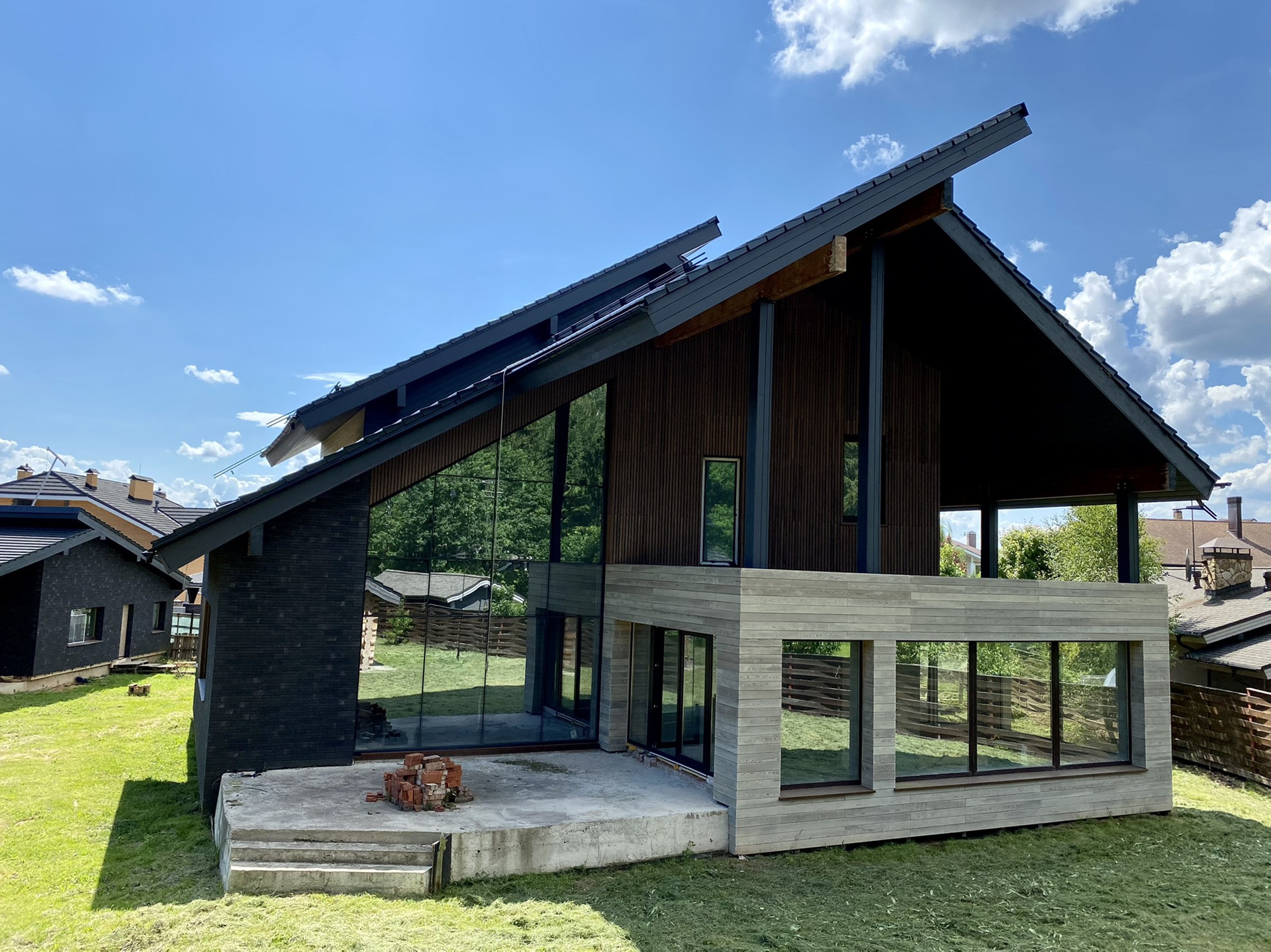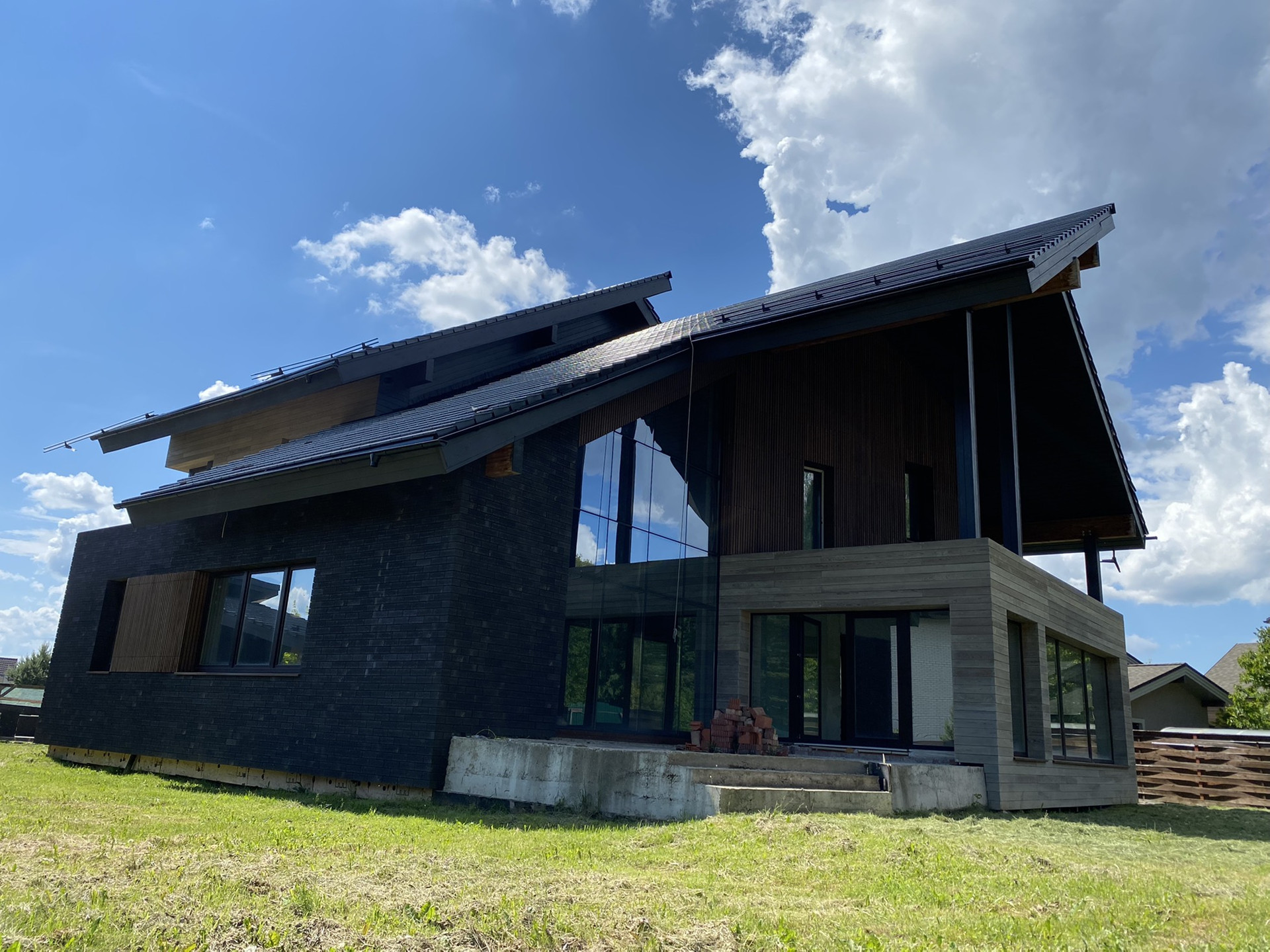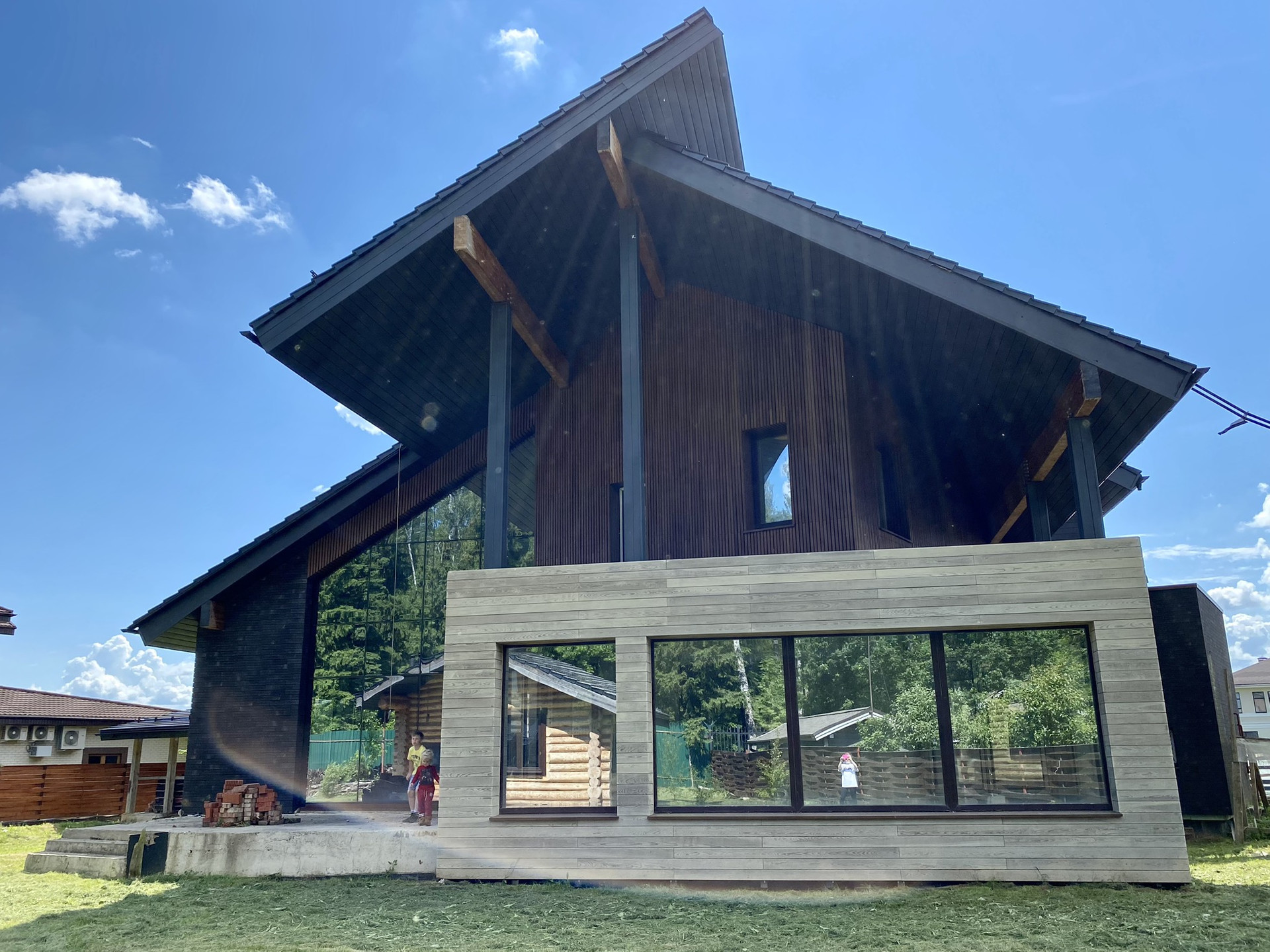 Задачей для архитекторов стояло исполнить проект с отсылкой к стилю шале в современном прочтении. Дом имеет удачное расположение в поселке и граничит с вековым лесом (собственный выход). В отделке использованы натуральные материалы дерево, керамическая черепица Laumans, немецкая отделочная плитка и дерево (лиственница).