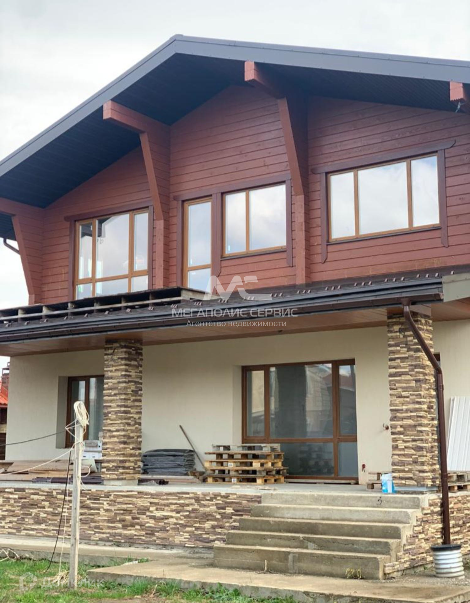 Фундамент монолитная плита. Перекрытия ж/б плиты. Материал стен: 1-й этаж кирпич, 2-й этаж клееный брус (GoodWood). Кровля мягкая черепица. Лестница монолитная. Энерго-эффективные бронированные окна. Фасад штукатурка, натуральный камень и лиственница.