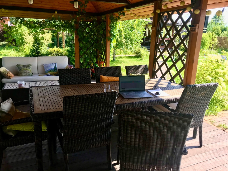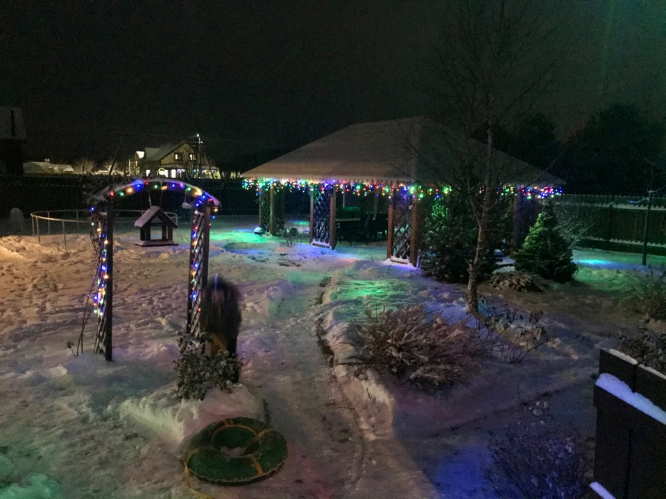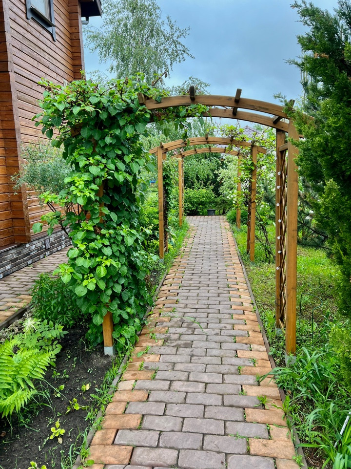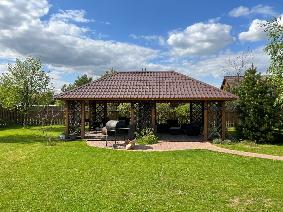 И конечно, центр всех семейных и дружеских посиделок - великолепная деревянная беседка 54 кв. м. со обеденной и лаунж зонами, обвитая диким виноградом.