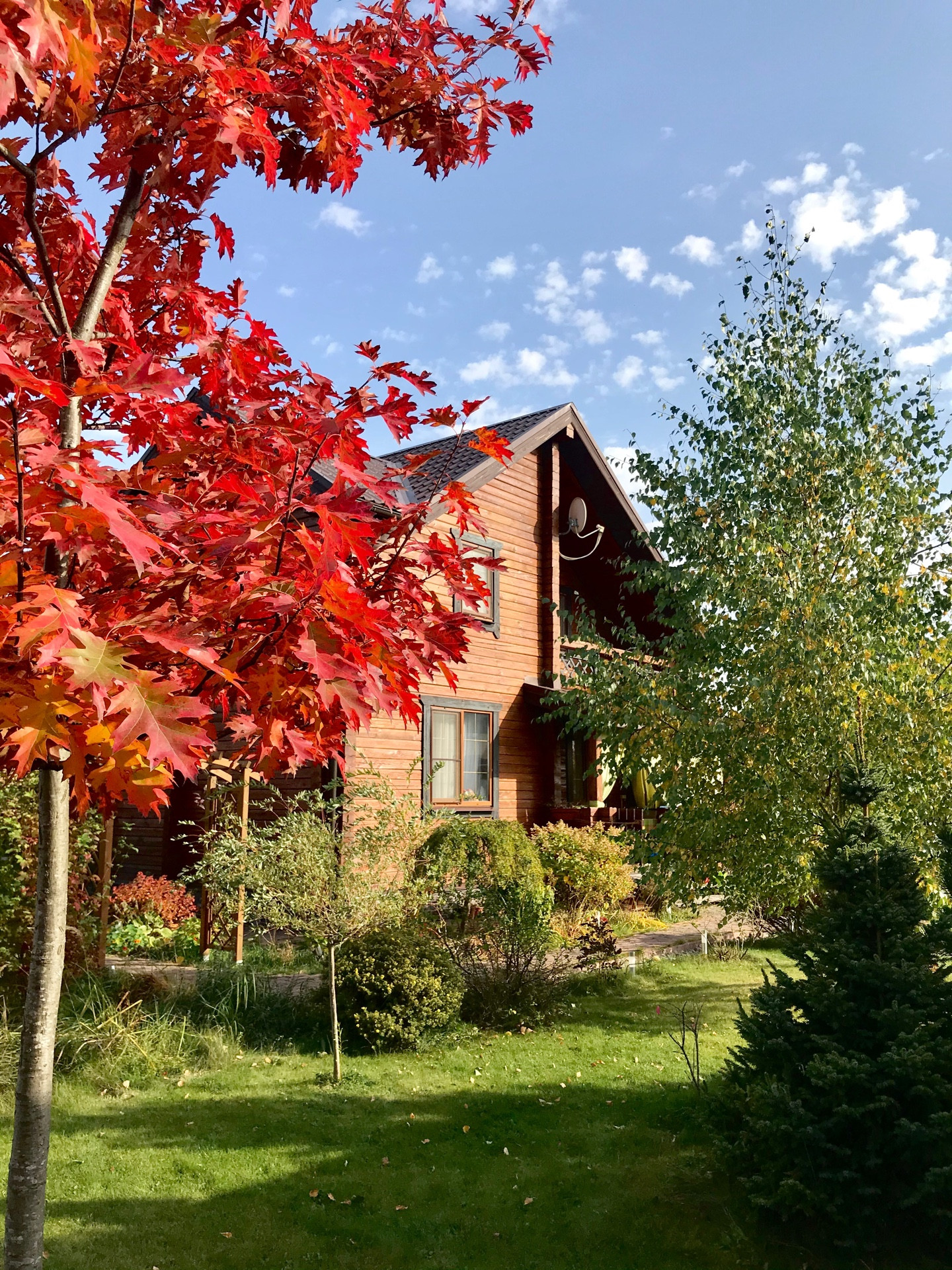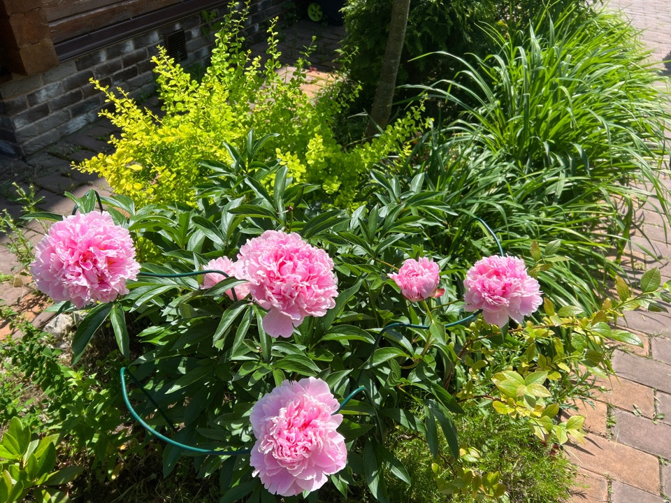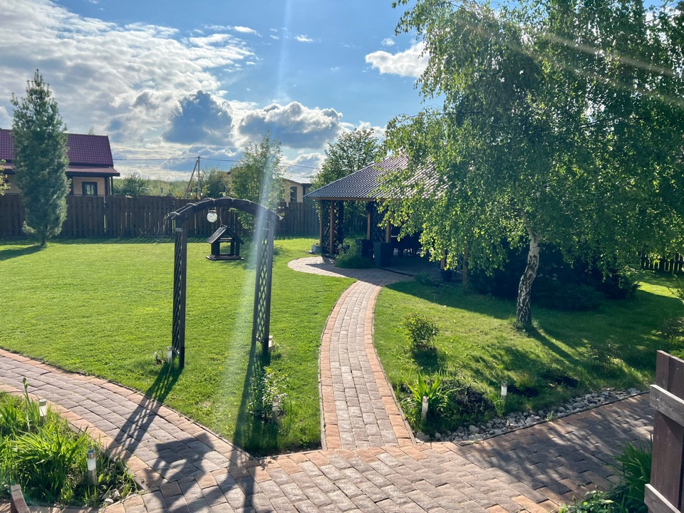 На участке предусмотрена большая открытая парковка на 3 автомобиля, обустроены дорожки из брусчатки, посажены декоративные и плодовые деревья и кустарники и море... цветов!