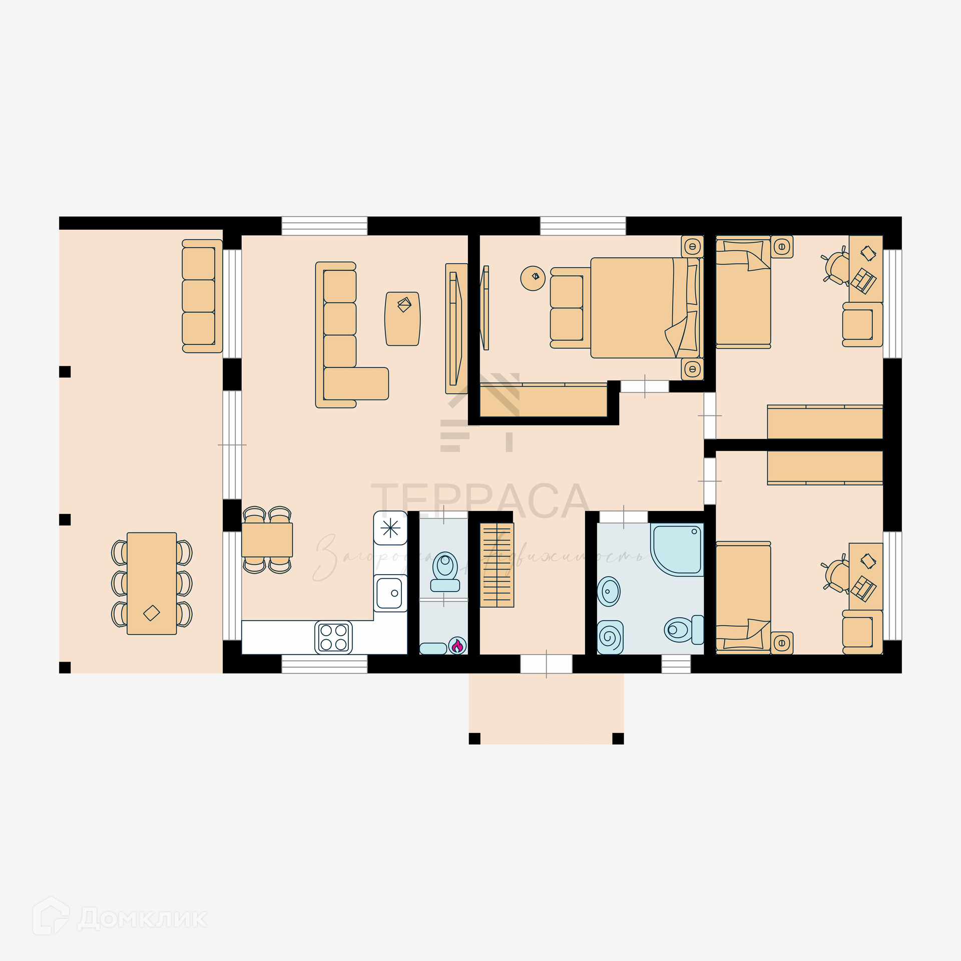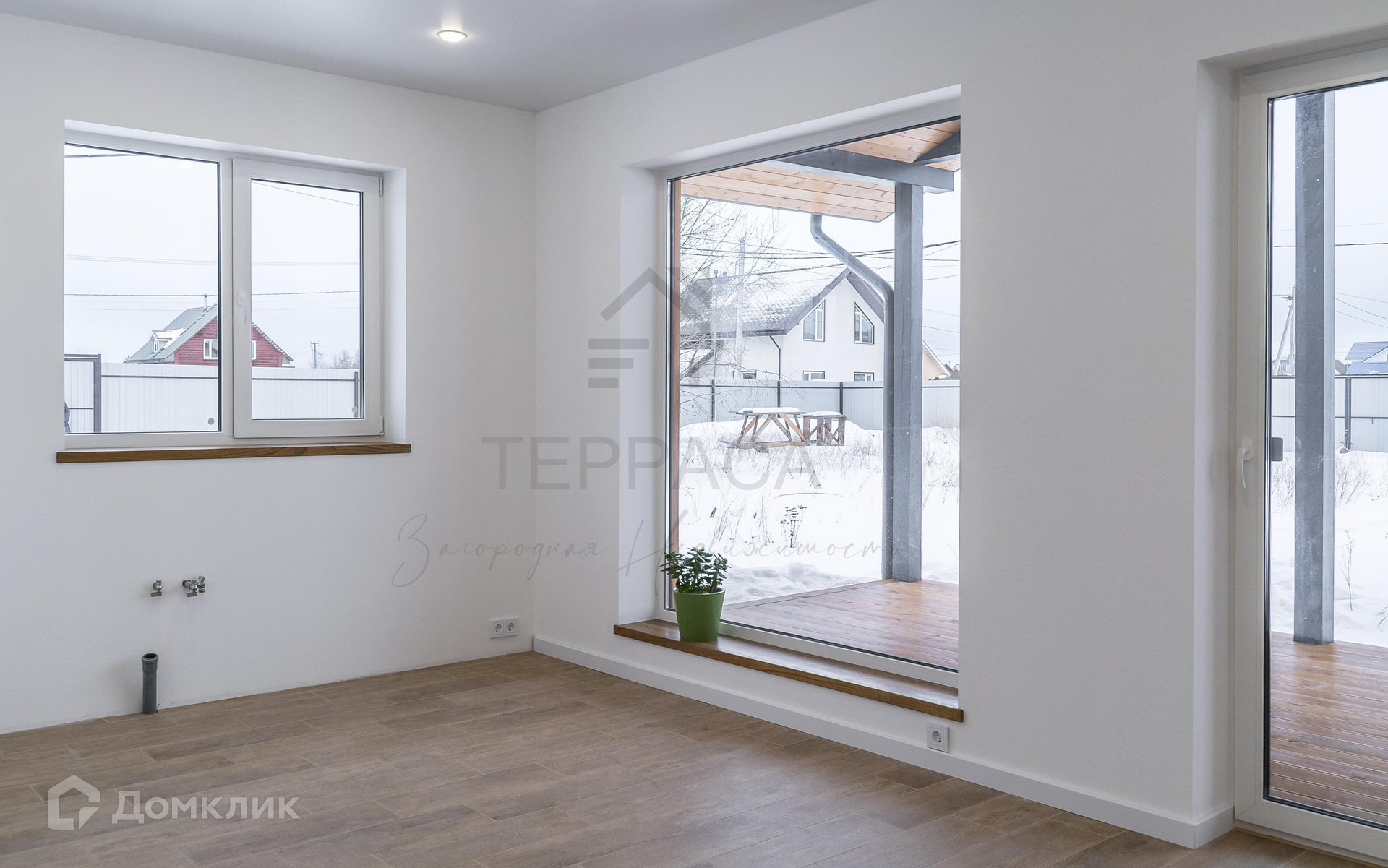 1 Этаж – кухня-гостиная с выходом на террасу с покрытием террасной доской, холл, 3 изолированные комнаты, с\у + котельная, совмещённый с\у и душевая, прихожая.