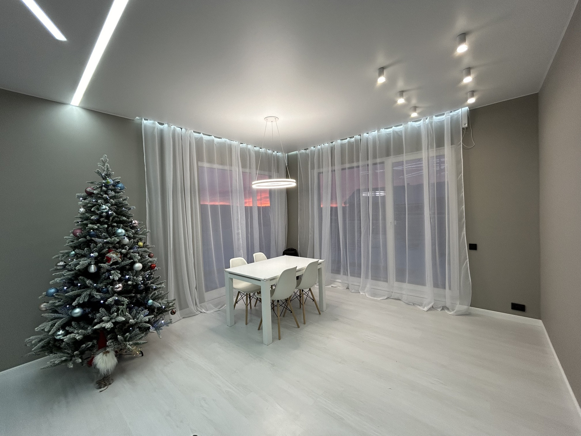 Большой совмещенный зал с кухней 42м2 продуманна обеденная зона с панорамным видом на террасу.